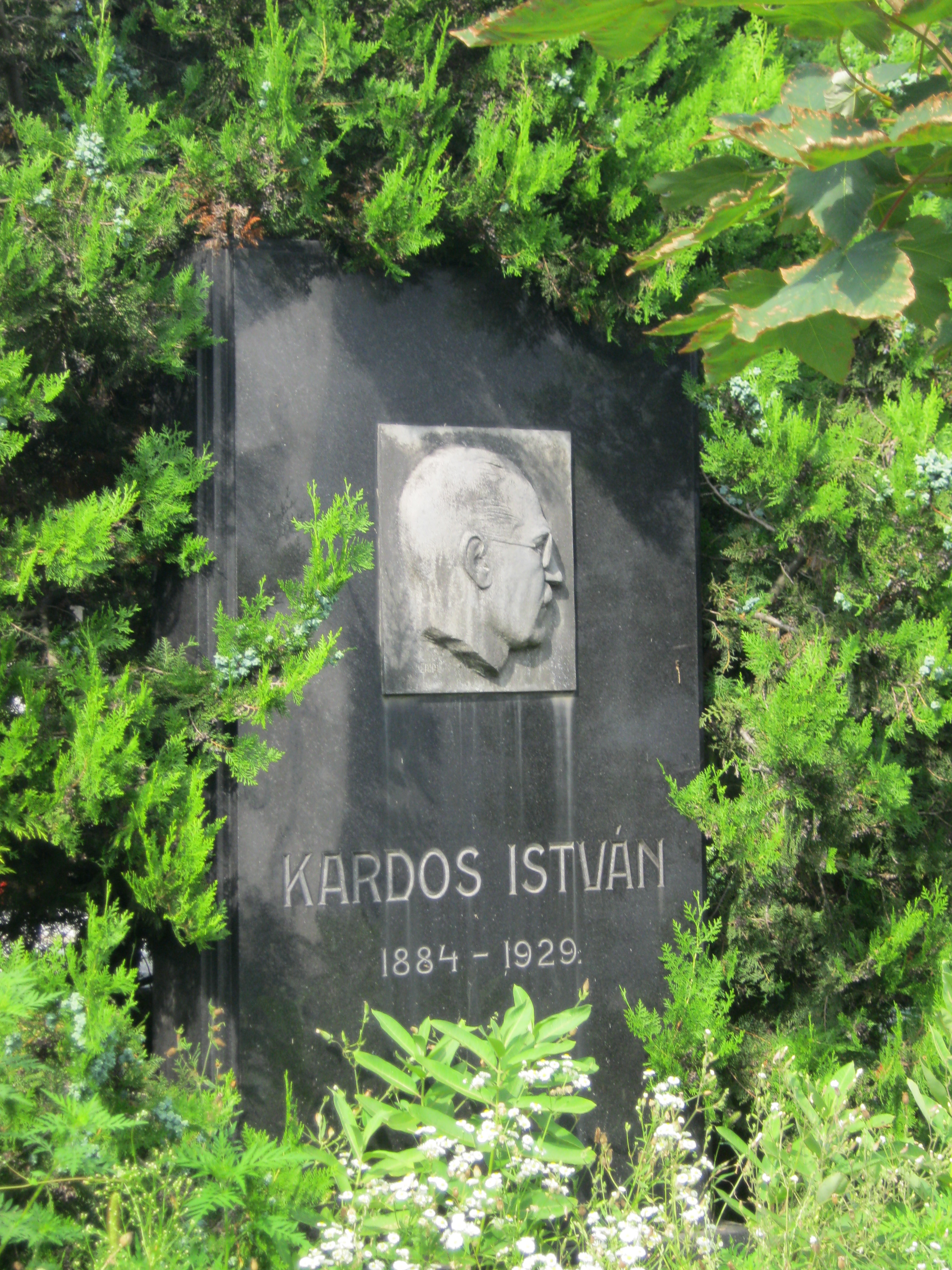 Nyilvános 1113 | 1700 | Nyíregyháza, Pazonyi tér, Északi temető: Kardos István | A Dózsa György út vezet Nyíregyháza Északi temetőjébe. Itt nyugszik Kardos István (1884-1929), Nyíregyháza kulturális életének egyik fontos alakja: kultúrtanácsnok és a Bessenyei Kör főtitkára. Arcvonásait bronz dombormű őrzi síremlékén, amelyet 1940-ben a Bessenyei Kör állíttatott fel. Felh. irod.: Fazekas Árpád - Szekrényes András: Nyíregyháza temetői. Nyíregyháza, 1990 A fénykép 2010 augusztus elején készült |