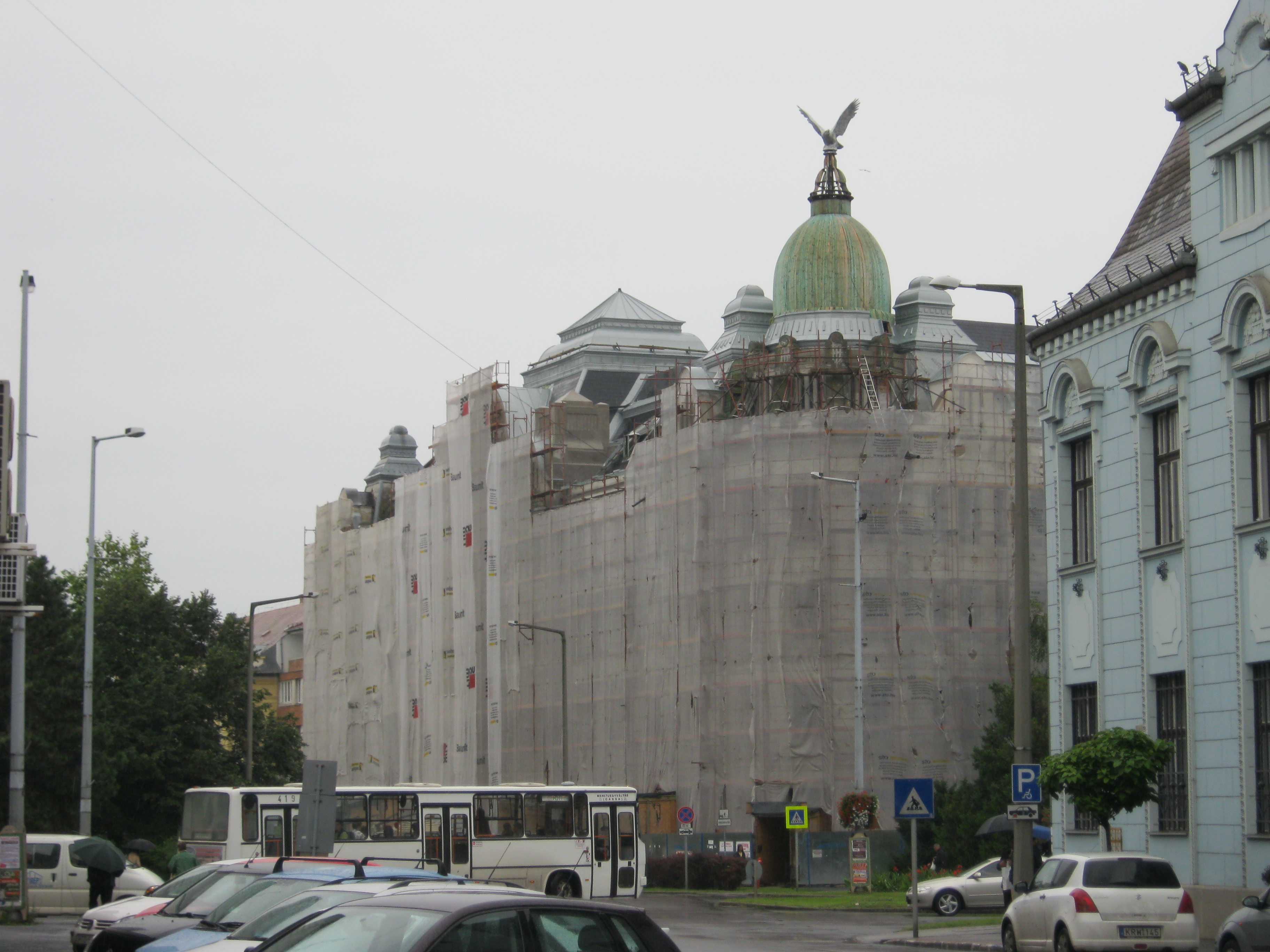 Nyilvános 1072 | 1541 | Nyíregyháza, Széchenyi utca 1. Nyírvíz-palota | Az Országzászló tér nyugati oldalán indul a város egykori főútvonala, a Széchenyi utca. Itt van a bejárata a hatalmas tömböt elfoglaló Nyírvíz-palotának, amely 1913-ban épült a Nyírvíz-szabályozó Társulat székházának Papp Gyula és Szabolcs Ferenc tervei alapján. A városban mind építészetileg, mind városképileg meghatározó épület szecessziós és eklektikus jegyeket visel magán. A lépcsőház díszes ablakai (87 négyzetméter), a lift és a függőfolyosó lengő ajtajainak maratott üvegei (43 négyzetméter), valamint a homlokzat gyönyörű díszei Róth Miksa műhelyében (lásd: Budapest, 07. Nefelejcs u. 26.) készültek. Eredetileg a földszinten üzletek, szolgálati lakások, az emeleteken bérlakások, hivatal helyiségek nyertek elhelyzést. Személy- és teherfelvonóval, házi vízvezetékrendszerrel és központi fűtéssel rendelkezett. Két kapubejárata lett a Széchenyi utca és az Országzászló tér felől nyílik, amelyek ikerlépcsőházban találkoznak. Kupoláján rétisas látható, amely az eltűnt eredeti másolata. (Ottjártamkor felállványozva találtam, de mivel fontos épület, ebben az állapotában is lefényképeztem. KK.) Felh. irod.: www.nyirviz.hu A fénykép 2010 augusztus elején készült |