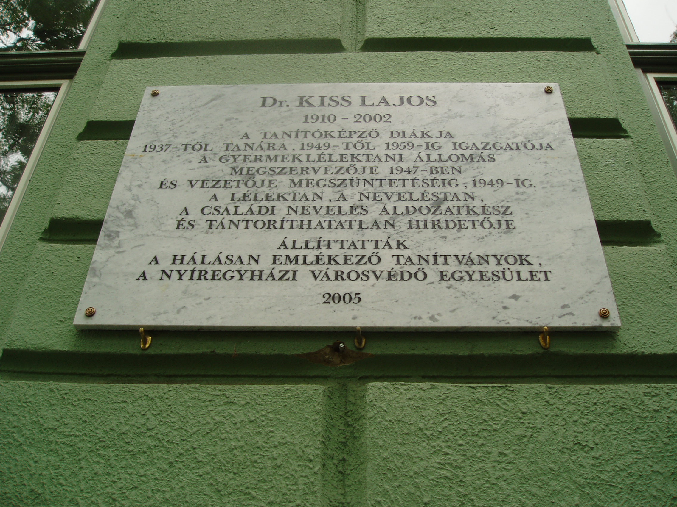 Nyilvános 1057 | 1416 | Nyíregyháza, Széchenyi utca 6. Kölcsey Ferenc Gimnázium | Épületét 1901-ben, Barzó Mihály tervei alapján, pénzügyigazgatósági székháznak emelték. 1925-től, 1957-ben történt megszűnéséig középfokú tanítóképző intézetként működött. Azóta a Kölcsey gimnázium otthona. Az első gimnáziumi osztály 1954/55-ben még egy korábbi épületben kezdte meg a tanulást, de már itt érettségizett 1959-ben. Az iskolaépület homlokzatán több emléktábla idézi az egykori tanítóképző, majd gimnázium neves tanárainak és diákjainak alakját. Kiss Lajos (1910-2002) a tanítóképző diákja, majd tanára volt. Felh. irod.: www.kolcsey-nyh.sulinet.hu A fénykép 2010 augusztus elején készült |