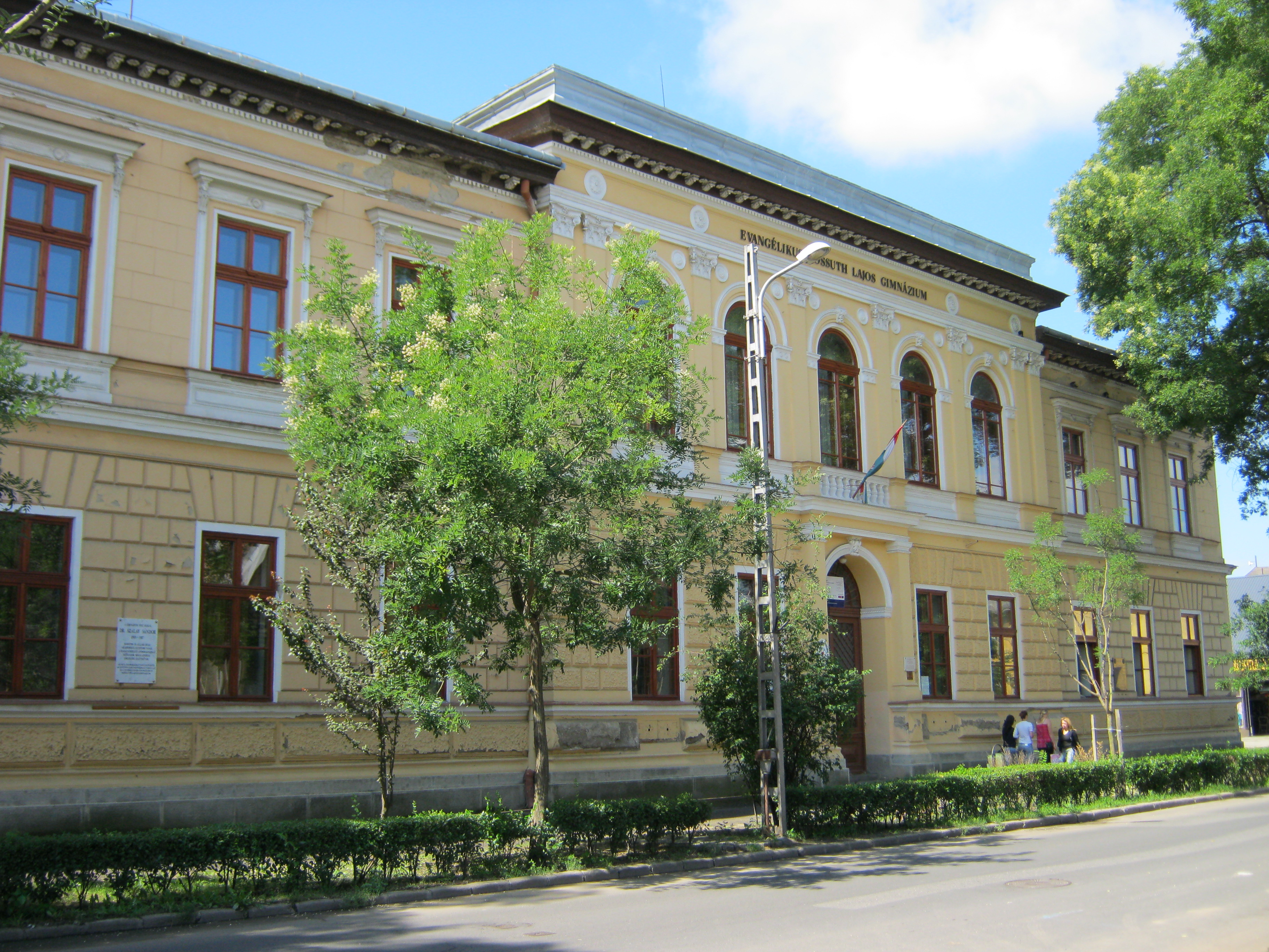 Nyilvános 1050 | 1439 | Nyíregyháza, Szent István utca 19. Evangélikus Kossuth Lajos Gimnázium | A megye legrégibb középiskolája. 1808-ban alapították mint evangélikus professzori iskolát (lásd: Nyíregyháza, Luther utca 5.). Nyolc osztályos gimnáziummá 1888-ra fejlesztették fel. Mai épületét ekkoriban, 1887-ben emelték Bobula János tervei szerint. Kossuth Lajos nevét 1921-ben vette fel. Az 1948-ban államosított iskolát 1992-ben kapta vissza az evangélikus egyház. Homlokzatán számos márványtábla emlékezik kiváló diákjaira, tanáraira. Felh. irod.: www.eklg.hu A fénykép 2010 augusztus elején készült |