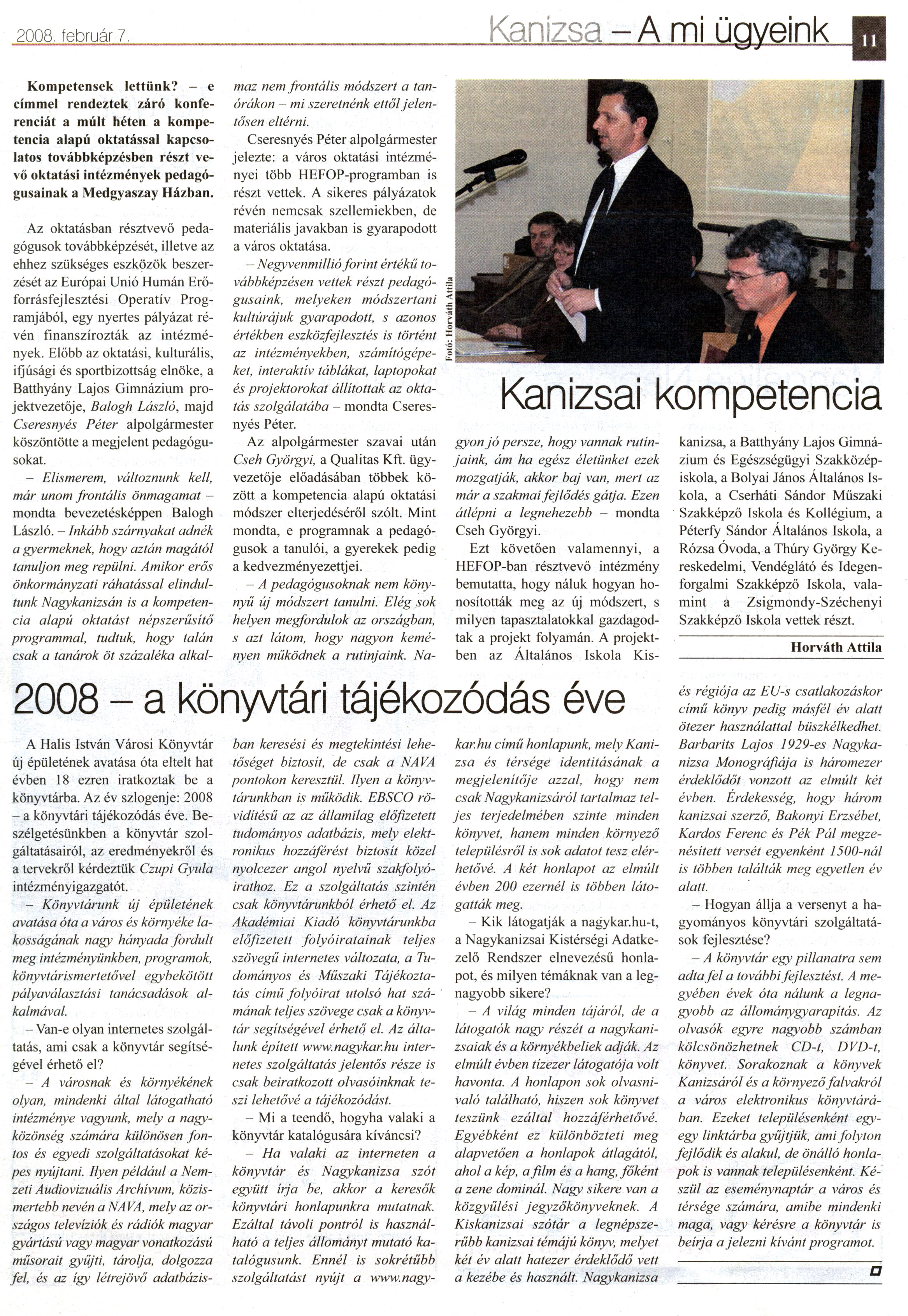 Nyilvános 2063 | 4393 | Kanizsa 2008. február 7. 11. oldal | 2008 - A könyvtári tájékozódás éve 2008 - a könyvtári tájékozódás éve A Halis István Városi Könyvtár új épületének avatása óta eltelt hat évben 18 ezren iratkoztak be a könyvtárba. Az év szlogenje: 2008 - a könyvtári tájékozódás éve. Beszélgetésünkben a könyvtár szolgáltatásairól, az eredményekről és a tervekről kérdeztük Czupi Gyula intézményigazgatót. - Könyvtárunk új épületének avatása óta a város és környéke lakosságának nagy hányada fordult meg intézményünkben, programok, könyvtárismertetővel egybekötött pályaválasztási tanácsadások alkalmával. - Van-e olyan internetes szolgáltatás, ami csak a könyvtár segítségével érhető el? - A városnak és környékének olyan, mindenki által látogatható intézménye vagyunk, mely a nagyközönség számára különösen fontos és egyedi szolgáltatásokat képes nyújtani. Ilyen például a Nemzeti Audiovizuális Archívum, közismertebb nevén a NAVA, mely az országos televíziók és rádiók magyar gyártású vagy magyar vonatkozású műsorait gyűjti, tárolja, dolgozza fel, és az így létrejövő adatbázis- ban keresési és megtekintési lehetőséget biztosit, de csak a NAVA pontokon keresztül. Ilyen a könyvtárunkban is működik. EBSCO rövidítésű az az államilag előfizetett tudományos adatbázis, mely elektronikus hozzáférést biztosit közel nyolcezer angol nyelvű szakfolyóirathoz. Ez a szolgáltatás szintén csak könyvtárunkból érhető el. Az Akadémiai Kiadó könyvtárunkba előfizetett folyóiratainak teljes szövegű internetes változata, a Tudományos és Műszaki Tájékoztatás című folyóirat utolsó hat számának teljes szövege csak a könyvtár segítségével érhető el. Az általunk épített www.nagykar.hu internetes szolgáltatás jelentős része is csak beiratkozott olvasóinknak teszi lehetővé a tájékozódást. - Mi a teendő, hogyha valaki a könyvtár katalógusára kíváncsi? - Ha valaki az interneten a könyvtár és Nagykanizsa szót együtt írja be, akkor a keresők könyvtári honlapunkra mutatnak. Ezáltal távoli pontról is használható a teljes állományt mutató katalógusunk. Ennél is sokrétűbb szolgáltatást nyújt a www. nagy- kar, hu című honlapunk, mely Kanizsa és térsége identitásának a megjelenítője azzal, hogy nem csak Nagykanizsáról tartalmaz teljes terjedelmében szinte minden könyvet, hanem minden környező településről is sok adatot tesz elérhetővé. A két honlapot az elmúlt évben 200 ezernél is többen látogatták meg. - Kik látogatják a nagykar.hu-t, a Nagykanizsai Kistérségi Adatkezelő Rendszer elnevezésű honlapot, és milyen témáknak van a legnagyobb sikere? — A világ minden tájáról, de a látogatók nagy részét a nagykanizsaiak és a környékbeliek adják. Az elmúlt évben tízezer látogatója volt havonta. A honlapon sok olvasnivaló található, hiszen sok könyvet teszünk ezáltal hozzáférhetővé. Egyébként ez különbözteti meg alapvetően a honlapok átlagától, ahol a kép, a film és a hang, főként a zene dominál. Nagy sikere van a közgyűlési jegyzökönyveknek. A Kiskanizsai szótár a legnépszerűbb kanizsai témájú könyv, melyet két év alatt hatezer érdeklődő vett a kezébe és használt. Nagykanizsa és régiója az EU-s csatlakozáskor című könyv pedig másfél év alatt ötezer használattal büszkélkedhet. Barbarits Lajos 1929-es Nagykanizsa Monográfiája is háromezer érdeklődőt vonzott az elmúlt két évben. Érdekesség, hogy három kanizsai szerző, Bakonyi Erzsébet, Kardos Ferenc és Pék Pál megzenésített versét egyenként 1500-nál is többen találták meg egyetlen év alatt. - Hogyan állja a versenyt a hagyományos könyvtári szolgáltatások fejlesztése? - A könyvtár egy pillanatra sem adta fel a további fejlesztést. A megyében évek óta nálunk a legnagyobb az állománygyarapítás. Az olvasók egyre nagyobb számban kölcsönözhetnek CD-t, DVD-t, könyvet. Sorakoznak a könyvek Kanizsáról és a környező falvakról a város elektronikus könyvtárában. Ezeket településenként egy-egy linktárba gyűjtjük, ami folyton fejlődik és alakul, de önálló honlapok is vannak településenként. Készül az eseménynaptár a város és térsége számára, amibe mindenki maga, vagy kérésre a könyvtár is beírja a jelezni kívánt programot. |