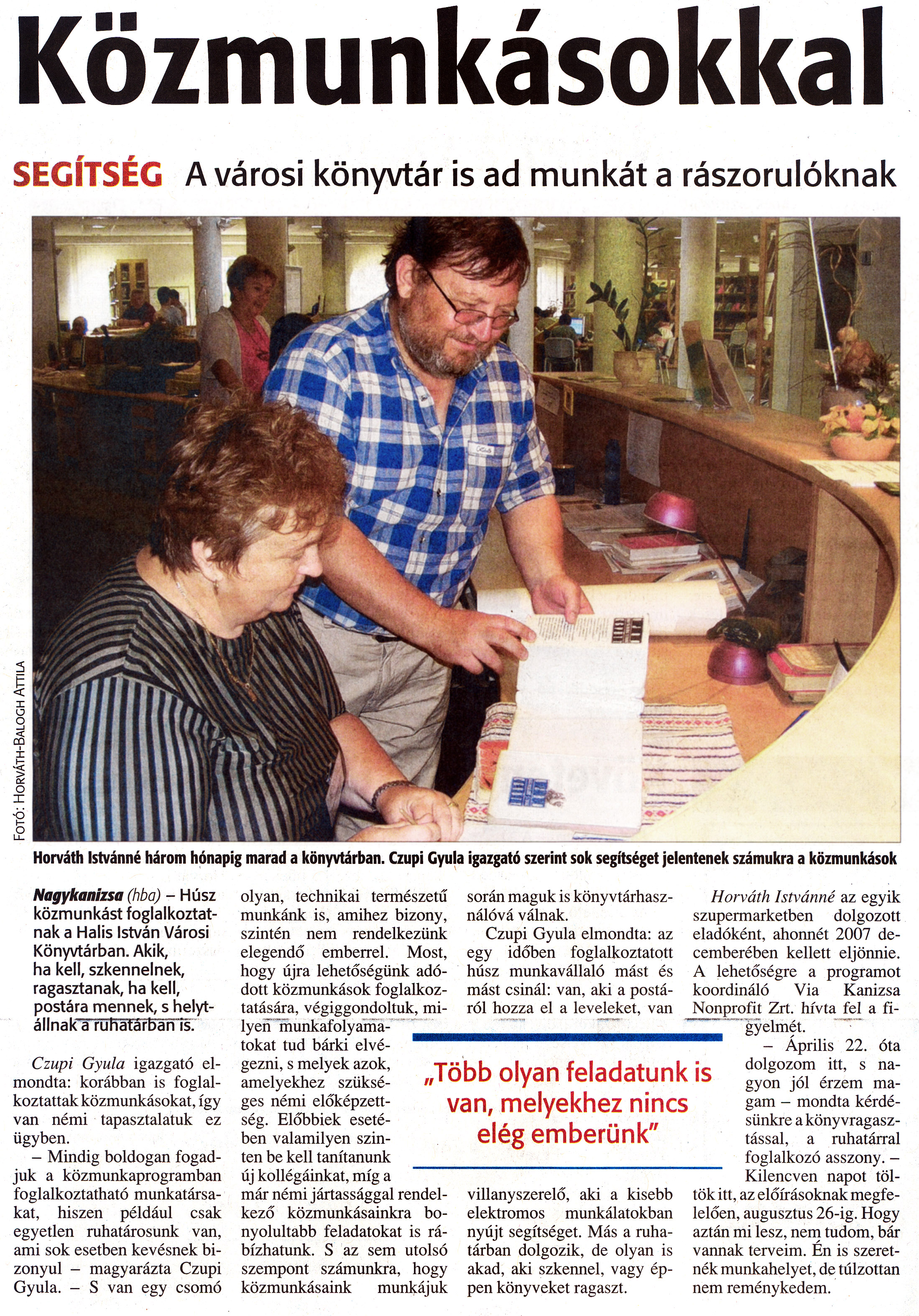 Nyilvános 1206 | 1556 | Zalai Hírlap 2009 05 26 122sz 14old - Közmunkásokkal | A cikk szövege: Közmunkásokkal SEGÍTSÉG A városi könyvtár is ad munkát a rászorulóknak „Több olyan feladatunk is van, melyekhez nincs elég emberünk" Horváth Istvánné három hónapig marad a könyvtárban. Czupi Gyula igazgató szerint sok segítséget jelentenek számukra a közmunkások Nagykanizsa (hba) - Húsz közmunkást foglalkoztatnak a Halis István Városi Könyvtárban. Akik, ha kell, szkennelnek, ragasztanak, ha kell, postára mennek, s helytállnak a ruhatárban is. Czupi Gyula igazgató elmondta: korábban is foglalkoztattak közmunkásokat, így van némi tapasztalatuk ez ügyben. - Mindig boldogan fogadjuk a közmunkaprogramban foglalkoztatható munkatársakat, hiszen például csak egyetlen ruhatárosunk van, ami sok esetben kevésnek bizonyul - magyarázta Czupi Gyula. - S van egy csomó olyan, technikai természetű munkánk is, amihez bizony, szintén nem rendelkezünk elegendő emberrel. Most, hogy újra lehetőségünk adódott közmunkások foglalkoztatására, végiggondoltuk, milyen munkafolyama-tokat tud bárki elvégezni, s melyek azok, amelyekhez szükséges némi előképzettség. Előbbiek esetében valamilyen szinten be kell tanítanunk új kollégáinkat, míg a már némi jártassággal rendelkező közmunkásainkra bonyolultabb feladatokat is rábízhatunk. S az sem utolsó szempont számunkra, hogy közmunkásaink munkájuk során maguk is könyvtárhasználóvá válnak. Czupi Gyula elmondta: az egy időben foglalkoztatott húsz munkavállaló mást és mást csinál: van, aki a postáról hozza el a leveleket, van villanyszerelő, aki a kisebb elektromos munkálatokban nyújt segítséget. Más a ruhatárban dolgozik, de olyan is akad, aki szkennel, vagy éppen könyveket ragaszt. Horváth Istvánné az egyik szupermarketben dolgozott eladóként, ahonnét 2007 decemberében kellett eljönnie. A lehetőségre a programot koordináló Via Kanizsa Nonprofit Zrt. hívta fel a figyelmét. - Április 22. óta dolgozom itt, s nagyon jól érzem magam - mondta kérdésünkre a könyvragasztással, a ruhatárral foglalkozó asszony. - Kilencven napot töltök itt, az előírásoknak megfelelően, augusztus 26-ig. Hogy aztán mi lesz, nem tudom, bár vannak terveim. Én is szeretnék munkahelyet, de túlzottan nem reménykedem. |