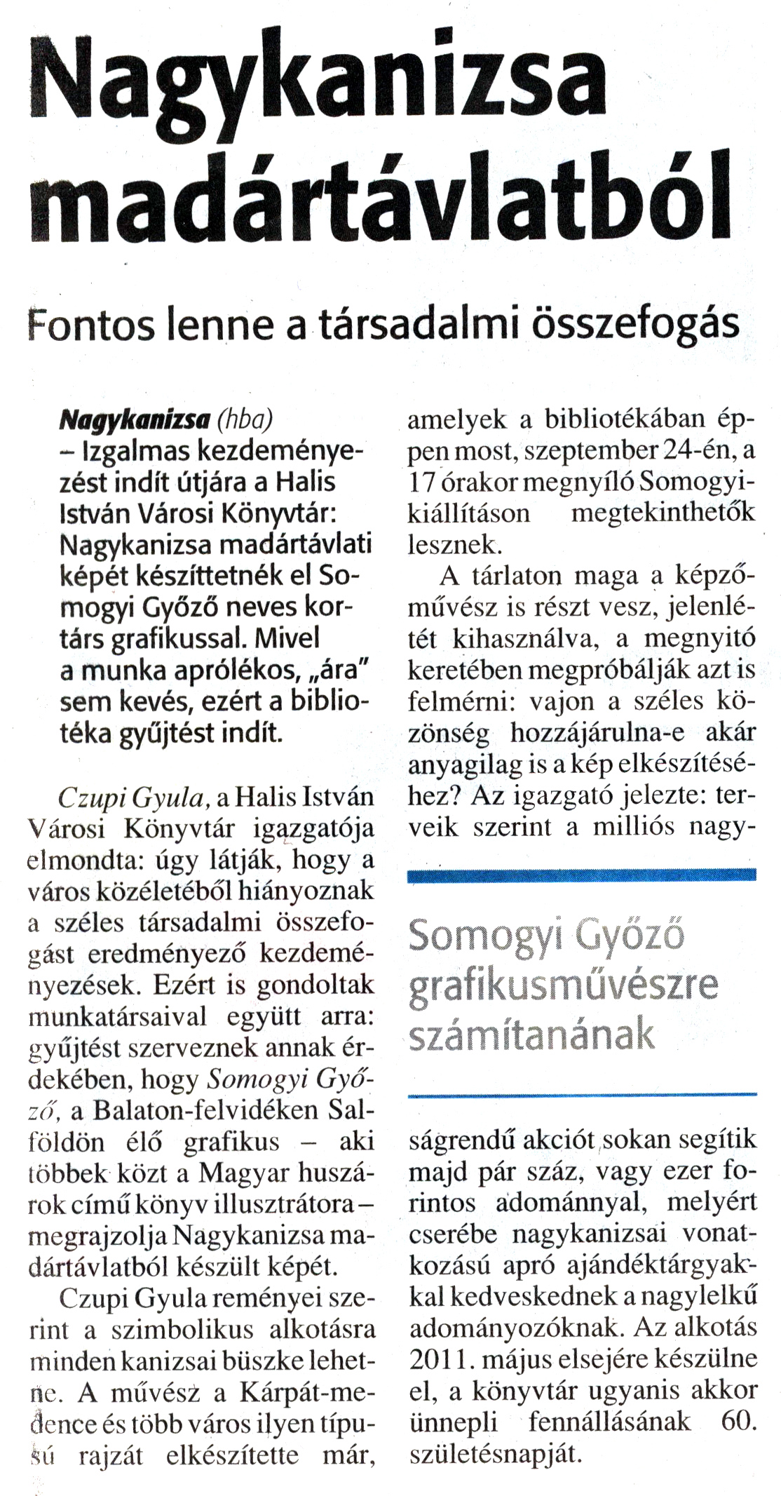 Nyilvános 1218 | 1500 | Zalai Hírlap 2009. szeptember 15. 216. szám 7. oldal - Nagykanizsa madártávlatból | A cikk szövege: Nagykanizsa madártávlatból Fontos lenne a társadalmi összefogás Somogyi Győző grafikusművészre számítanának Nagykanizsa (hba) - Izgalmas kezdeményezést indít útjára a Halis István Városi Könyvtár: Nagykanizsa madártávlati képét készíttetnék el Somogyi Győző neves kortárs grafikussal. Mivel a munka aprólékos, „ára" sem kevés, ezért a bibliotéka gyűjtést indít. Czupi Gyula, a Halis István Városi Könyvtár igazgatója elmondta: úgy látják, hogy a város közéletéből hiányoznak a széles társadalmi összefogást eredményező kezdeményezések. Ezért is gondoltak munkatársaival együtt arra: gyűjtést szerveznek annak érdekében, hogy Somogyi Győző, a Balaton-felvidéken Salföldön élő grafikus - aki többek közt a Magyar huszárok című könyv illusztrátora - megrajzolja Nagykanizsa madártávlatból készült képét. Czupi Gyula reményei szerint a szimbolikus alkotásra minden kanizsai büszke lehetne. A művész a Kárpát-medence és több város ilyen típusú rajzát elkészítette már, amelyek a bibliotékában éppen most, szeptember 24-én, a 17 órakor megnyíló Somogyikiállításon megtekinthetők lesznek. A tárlaton maga a képzőművész is részt vesz, jelenlétét kihasználva, a megnyitó keretében megpróbálják azt is felmérni: vajon a széles közönség hozzájárulna-e akár anyagilag is a kép elkészítéséhez? Az igazgató jelezte: terveik szerint a milliós nagyságrendű akciót sokan segítik majd pár száz, vagy ezer forintos adománnyal, melyért cserébe nagykanizsai vonatkozású apró ajándéktárgyakkal kedveskednek a nagylelkű adományozóknak. Az alkotás 2011. május elsejére készülne el, a könyvtár ugyanis akkor ünnepli fennállásának 60. születésnapját. |