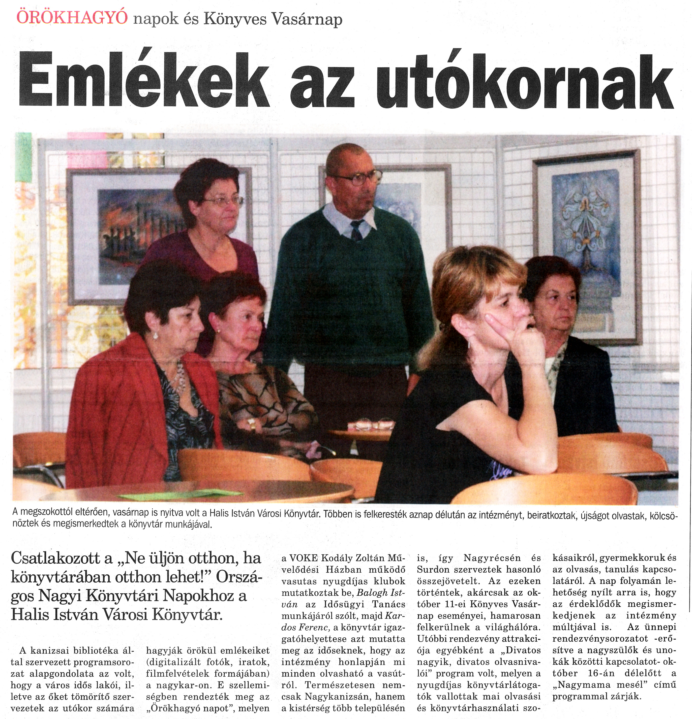 Nyilvános 1270 | 1716 | Nagykanizsai Maraton 2009.10.16. 041. szám 1. oldal - Emlékek az utókornak | A cikk szövege: ÖRÖKHAGYÓ napok és Könyves Vasárnap Emlékek az utókornak A megszokottól eltérően, vasárnap is nyitva volt a Halis István Városi Könyvtár. Többen is felkeresték aznap délután az intézményt, beiratkoztak, újságot olvastak kölcsönöztek és megismerkedtek a könyvtár munkájával. Csatlakozott a „Ne üljön otthon, ha könyvtárában otthon lehet!” Országos Nagyi Könyvtári Napokhoz a Halis István Városi Könyvtár. A kanizsai bibliotéka által szervezett programsorozat alapgondolata az volt, hogy a város idős lakói, illetve az őket tömörítő szervezetek az utókor számára hagyják örökül emlékeiket (digitalizált fotók, iratok, filmfelvételek formájában) a nagykar-on. E szellemiségben rendezték meg az „Örökhagyó napot”, melyen a VOKE Kodály Zoltán Művelődési Házban működő vasutas nyugdíjas klubok mutatkoztak be, Balogh István az Idősügyi Tanács munkájáról szólt, majd Kardos Ferenc, a könyvtár igazgatóhelyettese azt mutatta meg az időseknek, hogy az intézmény honlapján mi minden olvasható a vasútról. Természetesen nemcsak Nagykanizsán, hanem a kistérség több településén is, így Nagyrécsén és Surdon szerveztek hasonló összejövetelt. Az ezeken történtek, akárcsak az október 11-ei Könyves Vasárnap eseményei, hamarosan felkerülnek a világhálóra. Utóbbi rendezvény attrakciója egyébként a „Divatos nagyik, divatos olvasnivalói” program volt, melyen a nyugdíjas könyvtárlátogatók vallottak mai olvasási és könyvtárhasználati szokásaikról, gyermekkoruk és az olvasás, tanulás kapcsolatáról. A nap folyamán lehetőség nyílt arra is, hogy az érdeklődők megismerkedjenek az intézmény múltjával is. Az ünnepi rendezvénysorozatot -erősítve a nagyszülők és unokák közötti kapcsolatot- október 16-án délelőtt a „Nagymama mesél” című programmal zárják. |