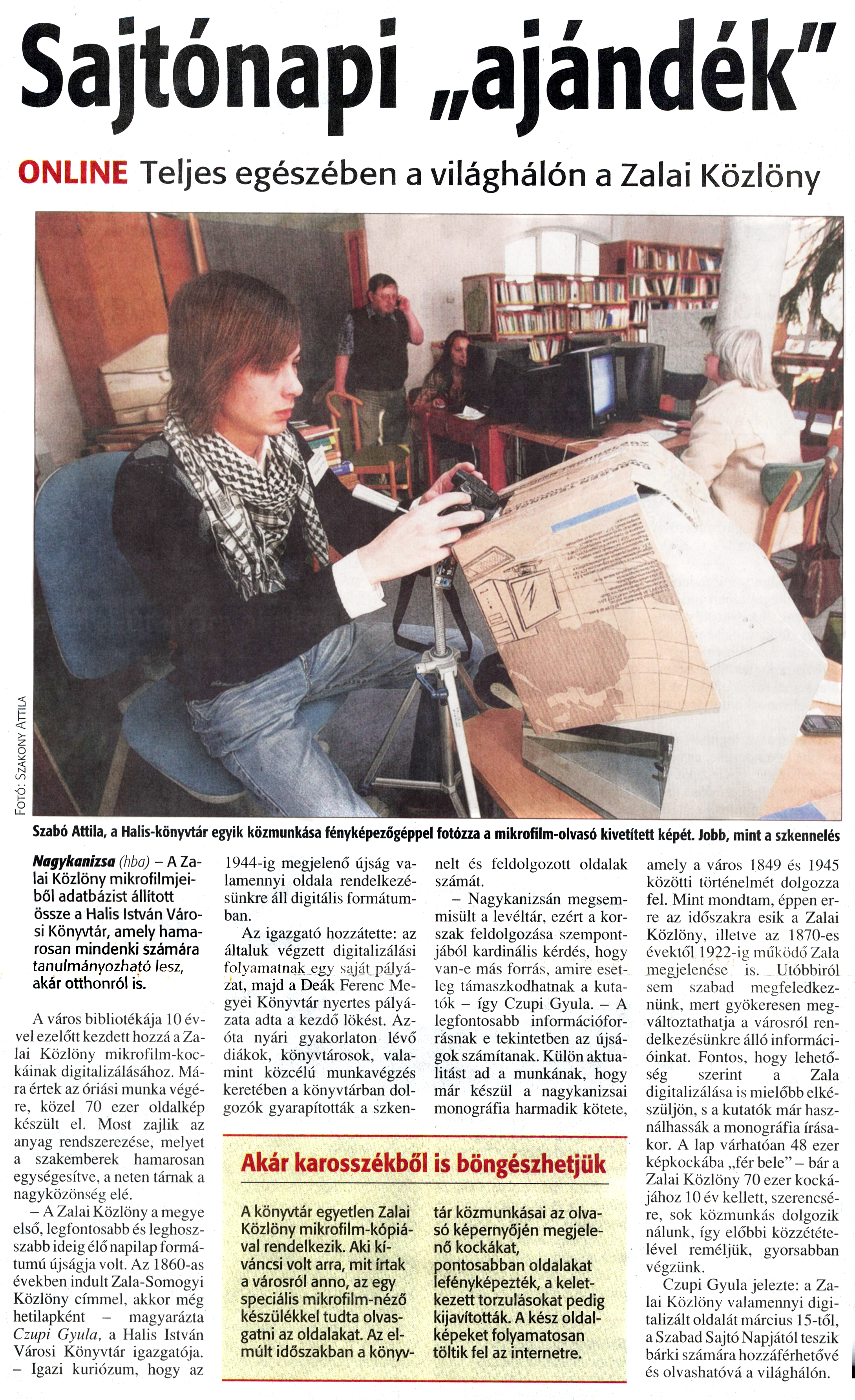 Nyilvános 1248 | 1871 | Zalai Hírlap 2010. február 23. 45. szám 11. oldal - Sajtónapi ajándék | A cikk szövege: Sajtónapi „ajándék" ONLINE Teljes egészében a világhálón a Zalai Közlöny Szabó Attila, a Halis-könyvtár egyik közmunkása fényképezőgéppel fotózza a mikrofilm-olvasó kivetített képét. Jobb, mint a szkennelés Nagykanizsa (hba) - A Zalai Közlöny mikrofilmjeiből adatbázist állított össze a Halis István Városi Könyvtár, amely hamarosan mindenki számára tanulmányozható lesz, akár otthonról is. A város bibliotékája 10 évvel ezelőtt kezdett hozzá a Zalai Közlöny mikrofilm-kockáinak digitalizálásához. Mára értek az óriási munka végére, közel 70 ezer oldalkép készült el. Most zajlik az anyag rendszerezése, melyet a szakemberek hamarosan egységesítve, a neten tárnak a nagyközönség elé. - A Zalai Közlöny a megye első, legfontosabb és leghosszabb ideig élő napilap formátumú újságja volt. Az 1860-as években indult Zala-Somogyi Közlöny címmel, akkor még hetilapként - magyarázta Czupi Gyula, a Halis István Városi Könyvtár igazgatója. - Igazi kuriózum, hogy az 1944-ig megjelenő újság valamennyi oldala rendelkezésünkre áll digitális formátumban. Az igazgató hozzátette: az általuk végzett digitalizálási folyamatnak egy saját pályázat, majd a Deák Ferenc Megyei Könyvtár nyertes pályázata adta a kezdő lökést. Azóta nyári gyakorlaton lévő diákok, könyvtárosok, valamint közcélú munkavégzés keretében a könyvtárban dolgozók gyarapították a szkennelt és feldolgozott oldalak számát. - Nagykanizsán megsemmisült a levéltár, ezért a korszak feldolgozása szempontjából kardinális kérdés, hogy van-e más forrás, amire esetleg támaszkodhatnak a kutatók - így Czupi Gyula. - A legfontosabb információforrásnak e tekintetben az újságok számítanak. Külön aktualitást ad a munkának, hogy már készül a nagykanizsai monográfia harmadik kötete, amely a város 1849 és 1945 közötti történelmét dolgozza fel. Mint mondtam, éppen erre az időszakra esik a Zalai Közlöny, illetve az 1870-es évektől 1922-ig működő Zala megjelenése is. Utóbbiról sem szabad megfeledkeznünk, mert gyökeresen megváltoztathatja a városról rendelkezésünkre álló információinkat. Fontos, hogy lehetőség szerint a Zala digitalizálása is mielőbb elkészüljön, s a kutatók már használhassák a monográfia írásakor. A lap várhatóan 48 ezer képkockába „fér bele" - bár a Zalai Közlöny 70 ezer kockájához 10 év kellett, szerencsére, sok közmunkás dolgozik nálunk, így előbbi közzétételével reméljük, gyorsabban végzünk. Czupi Gyula jelezte: a Zalai Közlöny valamennyi digitalizált oldalát március 15-től, a Szabad Sajtó Napjától teszik bárki számára hozzáférhetővé és olvashatóvá a világhálón. Akár karosszékből is böngészhetjük A könyvtár egyetlen Zalai Közlöny mikrofilm-kópiával rendelkezik. Aki kíváncsi volt arra, mit írtak a városról anno, az egy speciális mikrofilm-néző készülékkel tudta olvasgatni az oldalakat. Az elmúlt időszakban a könyvtár közmunkásai az olvasó képernyőjén megjelenő kockákat, pontosabban oldalakat lefényképezték, a keletkezett torzulásokat pedig kijavították. A kész oldalképeket folyamatosan töltik fel az internetre. |