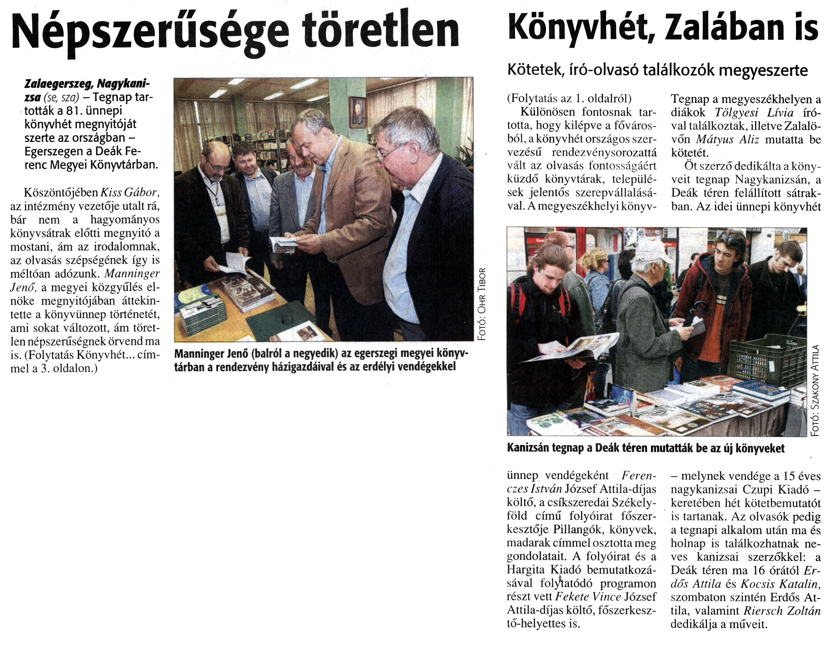 Nyilvános 1204 | 1670 | Zalai Hírlap 2010. június 4. 128. szám 1, 3. oldal - Népszerűsége töretlen - Könyvhét, Zalában is | A cikk szövege: Népszerűsége töretlen Zalaegerszeg, Nagykanizsa (se, sza) - Tegnap tartották a 81. ünnepi könyvhét megnyitóját szerte az országban -Egerszegen a Deák Ferenc Megyei Könyvtárban. Köszöntőjében Kiss Gábor, az intézmény vezetője utalt rá, bár nem a hagyományos könyvsátrak előtti megnyitó a mostani, ám az irodalomnak, az olvasás szépségének így is méltóan adózunk. Manninger Jenő, a megyei közgyűlés elnöke megnyitójában áttekintette a könyvünnep történetét, ami sokat változott, ám töretlen népszerűségnek örvend ma is. (Folytatás Könyvhét... címmel a 3. oldalon.) Manninger Jenő (balról a negyedik) az egerszegi megyei könyvtárban a rendezvény házigazdáival és az erdélyi vendégekkel Könyvhét, Zalában is Kötetek, író-olvasó találkozók megyeszerte (Folytatás az 1. oldalról) Különösen fontosnak tartotta, hogy kilépve a fővárosból, a könyvhét országos szervezésű rendezvénysorozattá vált az olvasás fontosságáért küzdő könyvtárak, települések jelentős szerepvállalásával. A megyeszékhelyi könyv- ünnep vendégeként Ferenczes István József Attila-díjas költő, a csíkszeredai Székelyföld című folyóirat főszerkesztője Pillangók, könyvek, madarak címmel osztotta meg gondolatait. A folyóirat és a Hargita Kiadó bemutatkozásával folytatódó programon részt vett Fekete Vince József Attila-díjas költő, főszerkesztő-helyettes is. Tegnap a megyeszékhelyen a diákok Tölgyesi Lívia íróval találkoztak, illetve Zalalövőn Mátyus Aliz mutatta be kötetét. Öt szerző dedikálta a könyveit tegnap Nagykanizsán, a Deák téren felállított sátrakban. Az idei ünnepi könyvhét — melynek vendége a 15 éves nagykanizsai Czupi Kiadó -keretében hét kötetbemutatót is tartanak. Az olvasók pedig a tegnapi alkalom után ma és holnap is találkozhatnak neves kanizsai szerzőkkel: a Deák téren ma 16 órától Erdős Attila és Kocsis Katalin, szombaton szintén Erdős Attila, valamint Riersch Zoltán dedikálja a műveit. Kanizsán tegnap a Deák téren mutatták be az új könyveket |