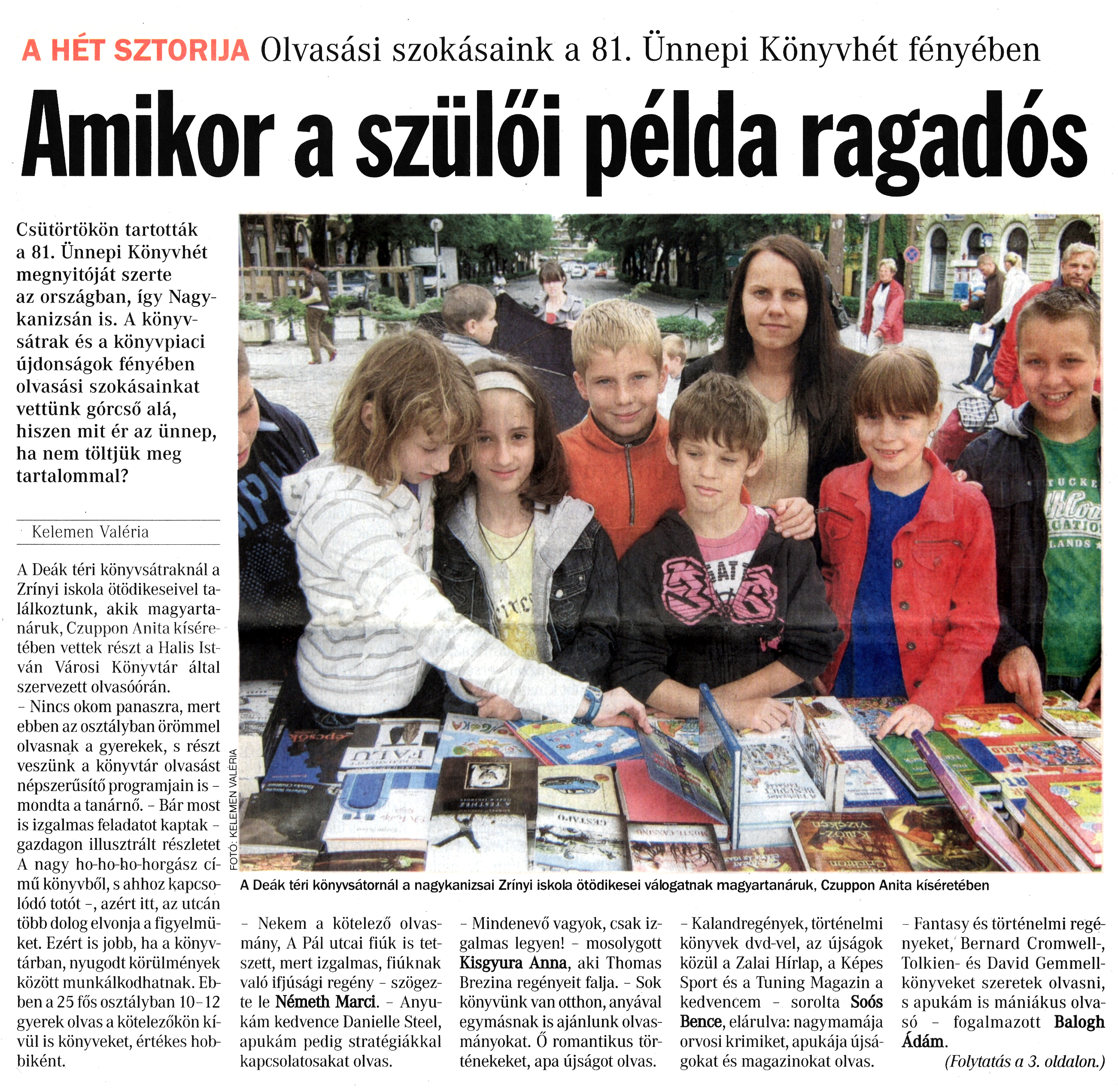 Nyilvános 1152 | 1802 | Vasárnapi Zalai Hírlap 2010. június 6. 22. szám 1. oldal - Amikor a szülői példa ragadós | A cikk szövege: A HÉT SZTORIJA Olvasási szokásaink a 81. Ünnepi Könyvhét fényében Amikor a szülői példa ragadós Csütörtökön tartották a 81. Ünnepi Könyvhét megnyitóját szerte az országban, így Nagykanizsán is. A könyvsátrak és a könyvpiaci újdonságok fényében olvasási szokásainkat vettünk górcső alá, hiszen mit ér az ünnep, ha nem töltjük meg tartalommal? Kelemen Valéria A Deák téri könyvsátraknál a Zrínyi iskola ötödikeseivel találkoztunk, akik magyartanáruk, Czuppon Anita kíséretében vettek részt a Halis István Városi Könyvtár által szervezett olvasóórán. - Nincs okom panaszra, mert ebben az osztályban örömmel olvasnak a gyerekek, s részt veszünk a könyvtár olvasást népszerűsítő programjain is -mondta a tanárnő. - Bár most is izgalmas feladatot kaptak - gazdagon illusztrált részletet A nagy ho-ho-ho-horgász című könyvből, s ahhoz kapcsolódó totót -, azért itt, az utcán több dolog elvonja a figyelmüket. Ezért is jobb, ha a könyvtárban, nyugodt körülmények között munkálkodhatnak. Ebben a 25 fős osztályban 10-12 gyerek olvas a kötelezőkön kívül is könyveket, értékes hobbiként. - Nekem a kötelező olvasmány, A Pál utcai fiúk is tetszett, mert izgalmas, fiúknak való ifjúsági regény - szögezte le Németh Marci. - Anyukám kedvence Danielle Steel, apukám pedig stratégiákkal kapcsolatosakat olvas. - Mindenevő vagyok, csak izgalmas legyen! - mosolygott Kisgyura Anna, aki Thomas Brezina regényeit falja. - Sok könyvünk van otthon, anyával egymásnak is ajánlunk olvasmányokat. Ő romantikus történekeket, apa újságot olvas. - Kalandregények, történelmi könyvek dvd-vel, az újságok közül a Zalai Hírlap, a Képes Sport és a Tuning Magazin a kedvencem - sorolta Soós Bence, elárulva: nagymamája orvosi krimiket, apukája újságokat és magazinokat olvas. - Fantasy és történelmi regényeket, Bernard Cromwell-, Tolkien- és David Gemmell-könyveket szeretek olvasni, s apukám is mániákus olvasó - fogalmazott Balogh Ádám. (Folytatás a 3. oldalon.) A Deák téri könyvsátornál a nagykanizsai Zrínyi iskola ötödikesei válogatnak magyartanáruk, Czuppon Anita kíséretében |