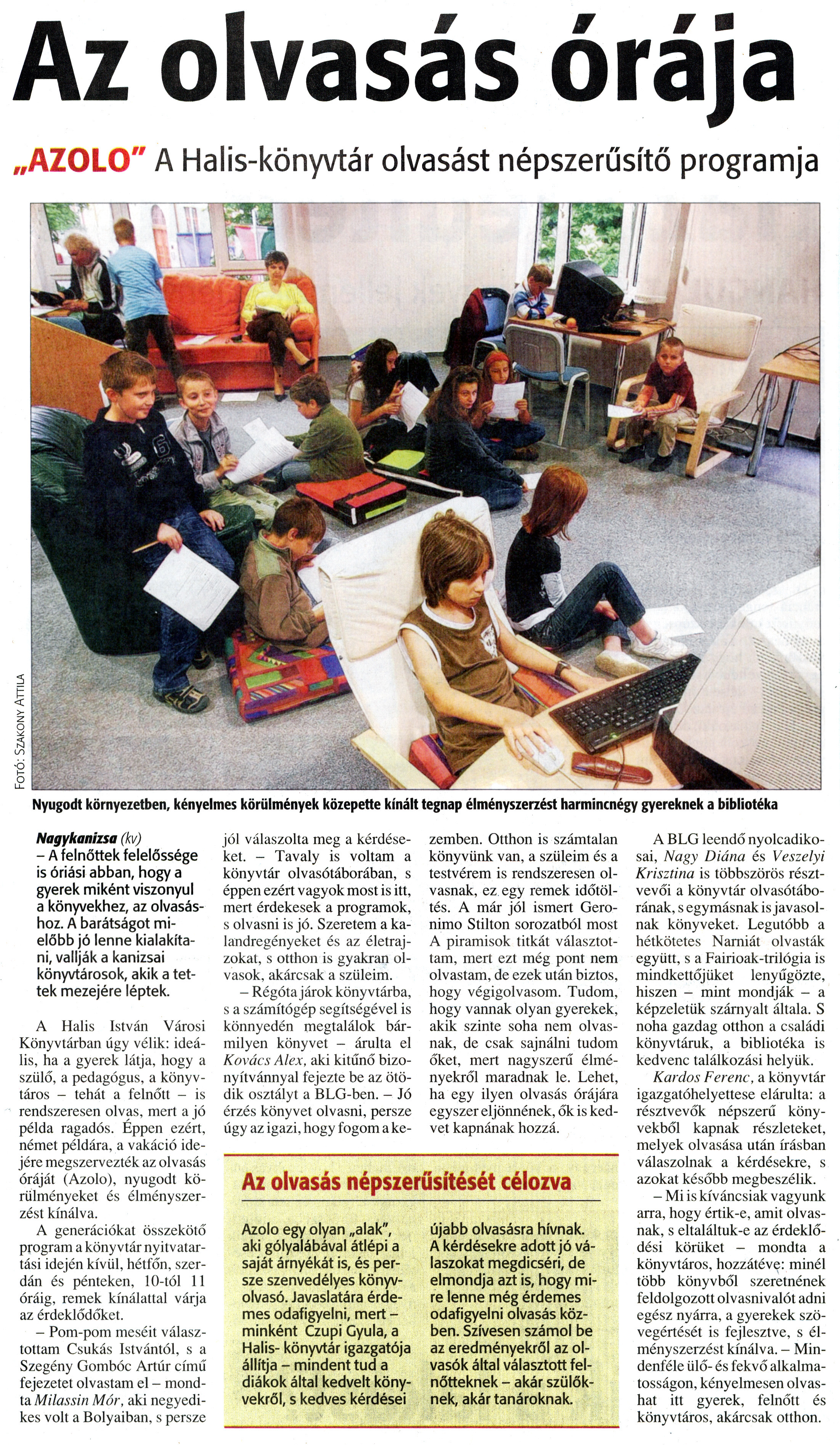 Nyilvános 1473 | 2225 | Zalai Hírlap 2010. június 22. 143. szám 11. oldal - Az olvasás órája | A cikk szövege: Az olvasás órája „AZOLO" A Halis-könyvtár olvasást népszerűsítő programja Nyugodt környezetben, kényelmes körülmények közepette kínált tegnap élményszerzést harmincnégy gyereknek a bibliotéka Nagykanizsa (kv) - A felnőttek felelőssége is óriási abban, hogy a gyerek miként viszonyul a könyvekhez, az olvasáshoz. A barátságot mielőbb jó lenne kialakítani, vallják a kanizsai könyvtárosok, akik a tettek mezejére léptek. A Halis István Városi Könyvtárban úgy vélik: ideális, ha a gyerek látja, hogy a szülő, a pedagógus, a könyvtáros - tehát a felnőtt - is rendszeresen olvas, mert a jó példa ragadós. Éppen ezért, német példára, a vakáció idejére megszervezték az olvasás óráját (Azolo), nyugodt körülményeket és élményszerzést kínálva. A generációkat összekötő program a könyvtár nyitvatartási idején kívül, hétfőn, szerdán és pénteken, 10-tól 11 óráig, remek kínálattal várja az érdeklődőket. - Pom-pom meséit választottam Csukás Istvántól, s a Szegény Gombóc Artúr című fejezetet olvastam el - mondta Milassin Mór, aki negyedikes volt a Bolyaiban, s persze jól válaszolta meg a kérdéseket. - Tavaly is voltam a könyvtár olvasótáborában, s éppen ezért vagyok most is itt, mert érdekesek a programok, s olvasni is jó. Szeretem a kalandregényeket és az életrajzokat, s otthon is gyakran olvasok, akárcsak a szüleim. - Régóta járok könyvtárba, s a számítógép segítségével is könnyedén megtalálok bármilyen könyvet - árulta el Kovács Alex, aki kitűnő bizonyítvánnyal fejezte be az ötödik osztályt a BLG-ben. - Jó érzés könyvet olvasni, persze úgy az igazi, hogy fogom a kezemben. Otthon is számtalan könyvünk van, a szüleim és a testvérem is rendszeresen olvasnak, ez egy remek időtöltés. A már jól ismert Geronimo Stilton sorozatból most A piramisok titkát választottam, mert ezt még pont nem olvastam, de ezek után biztos, hogy végigolvasom. Tudom, hogy vannak olyan gyerekek, akik szinte soha nem olvasnak, de csak sajnálni tudom őket, mert nagyszerű élményekről maradnak le. Lehet, ha egy ilyen olvasás órájára egyszer eljönnének, ők is kedvet kapnának hozzá. A BLG leendő nyolcadikosai, Nagy Diána és Veszelyi Krisztina is többszörös résztvevői a könyvtár olvasótáborának, s egymásnak is javasolnak könyveket. Legutóbb a hétkötetes Narniát olvasták együtt, s a Fairioak-trilógia is mindkettőjüket lenyűgözte, hiszen - mint mondják - a képzeletük szárnyalt általa. S noha gazdag otthon a családi könyvtáruk, a bibliotéka is kedvenc találkozási helyük. Kardos Ferenc, a könyvtár igazgatóhelyettese elárulta: a résztvevők népszerű könyvekből kapnak részleteket, melyek olvasása után írásban válaszolnak a kérdésekre, s azokat később megbeszélik. - Mi is kíváncsiak vagyunk arra, hogy értik-e, amit olvasnak, s eltaláltuk-e az érdeklődési körüket - mondta a könyvtáros, hozzátéve: minél több könyvből szeretnének feldolgozott olvasnivalót adni egész nyárra, a gyerekek szövegértését is fejlesztve, s élményszerzést kínálva. - Mindenféle ülő- és fekvő alkalmatosságon, kényelmesen olvashat itt gyerek, felnőtt és könyvtáros, akárcsak otthon. Az olvasás népszerűsítését célozva Azolo egy olyan „alak", aki gólyalábával átlépi a saját árnyékát is, és persze szenvedélyes könyvolvasó. Javaslatára érdemes odafigyelni, mert -minként Czupi Gyula, a Halis- könyvtár igazgatója állítja - mindent tud a diákok által kedvelt könyvekről, s kedves kérdései újabb olvasásra hívnak. A kérdésekre adott jó válaszokat megdicséri, de elmondja azt is, hogy mire lenne még érdemes odafigyelni olvasás közben. Szívesen számol be az eredményekről az olvasók által választott felnőtteknek - akár szülőknek, akár tanároknak. |