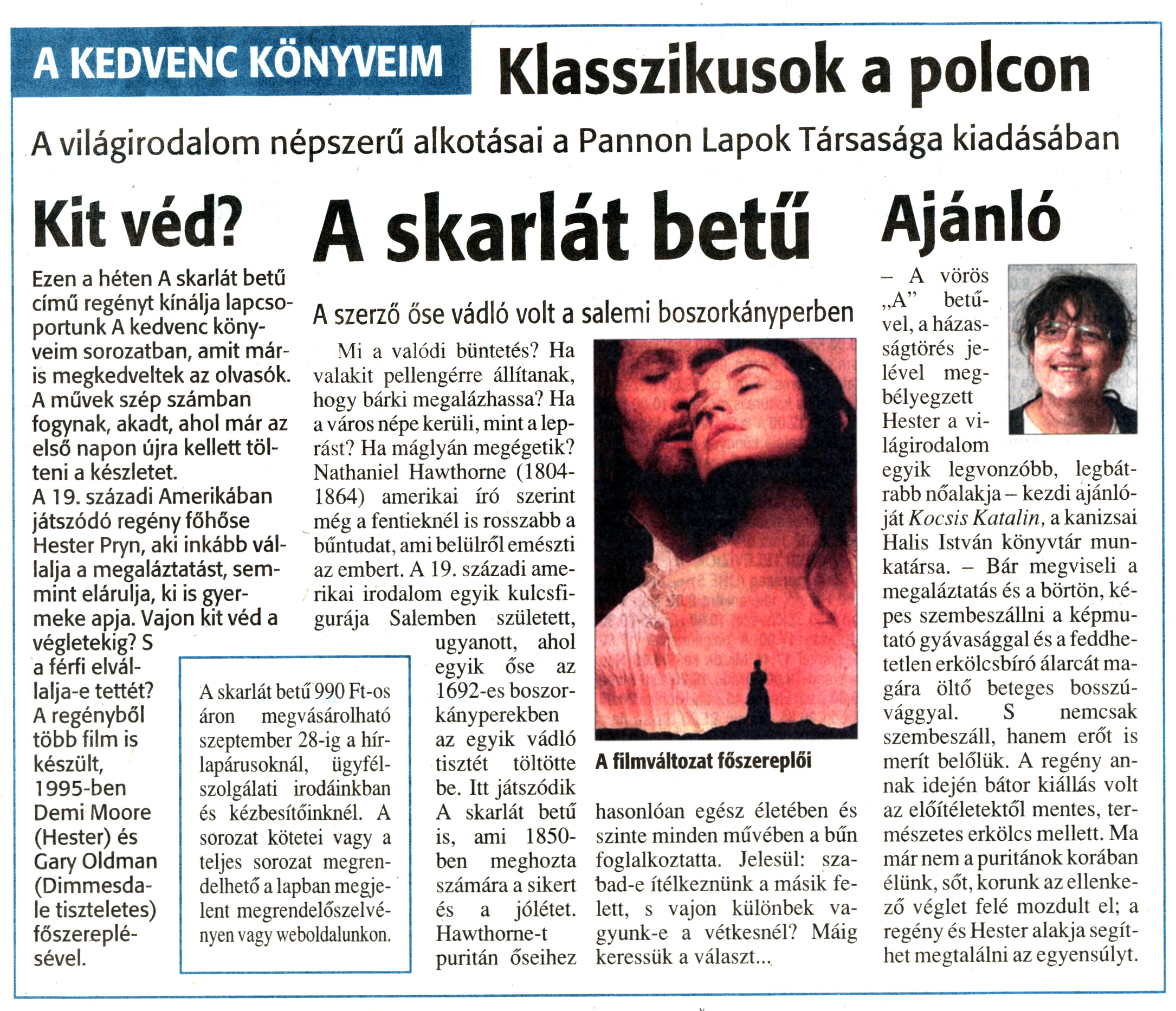 Nyilvános 1275 | 1676 | Zalai Hírlap 2010. szeptember 22. 221. szám 7. oldal - A Klasszikusok a polcon sorozat újabb regényét ajánlja Kocsis Katalin, a Halis István Városi Könyvtár munkatársa | A cikk szövege: A KEDVENC KÖNYVEIM Klasszikusok a polcon A világirodalom népszerű alkotásai a Pannon Lapok Társasága kiadásában Kit véd? Ezen a héten A skarlát betű című regényt kínálja lapcsoportunk A kedvenc könyveim sorozatban, amit máris megkedveltek az olvasók. A művek szép számban fogynak, akadt, ahol már az első napon újra kellett tölteni a készletet. A 19. századi Amerikában játszódó regény főhőse Hester Pryn, aki inkább vállalja a megaláztatást, semmint elárulja, ki is gyermeke apja. Vajon kit véd a végletekig? S a férfi elvállalja-e tettét? A regényből több film is készült, 1995-ben Demi Moore (Hester) és Gary Oldman (Dimmesdale tiszteletes) főszereplésével. A skarlát betű A szerző őse vádló volt a salemi boszorkányperben Mi a valódi büntetés? Ha valakit pellengérre állítanak, hogy bárki megalázhassa? Ha a város népe kerüli, mint a leprást? Ha máglyán megégetik? Nathaniel Hawthorne (1804-1864) amerikai író szerint még a fentieknél is rosszabb a bűntudat, ami belülről emészti az embert. A 19. századi amerikai irodalom egyik kulcsfigurája Salemben született, ugyanott, ahol egyik őse az 1692-es boszorkányperekben az egyik vádló tisztét töltötte be. Itt játszódik A skarlát betű is, ami 1850-ben meghozta számára a sikert és a jólétet. Hawthorne-t puritán őseihez A filmváltozat főszereplői hasonlóan egész életében és szinte minden művében a bűn foglalkoztatta. Jelesül: szabad-e ítélkeznünk a másik felett, s vajon különbek vagyunk-e a vétkesnél? Máig keressük a választ... A skarlát betű 990 Ft-os áron megvásárolható szeptember 28-ig a hírlapárusoknál, ügyfélszolgálati irodáinkban és kézbesítőinknél. A sorozat kötetei vagy a teljes sorozat megrendelhető a lapban megjelent megrendelőszelvényen vagy weboldalunkon. Ajánló - A vörös „A" betűvel, a házasságtörés jelével megbélyegzett Hester a világirodalom egyik legvonzóbb, legbátrabb nőalakja - kezdi ajánlóját Kocsis Katalin, a kanizsai Halis István könyvtár munkatársa. - Bár megviseli a megaláztatás és a börtön, képes szembeszállni a képmutató gyávasággal és a feddhetetlen erkölcsbíró álarcát magára öltő beteges bosszúvággyal. S nemcsak szembeszáll, hanem erőt is merít belőlük. A regény annak idején bátor kiállás volt az előítéletektől mentes, természetes erkölcs mellett. Ma már nem a puritánok korában élünk, sőt, korunk az ellenkező véglet felé mozdult el; a regény és Hester alakja segíthet megtalálni az egyensúlyt. |