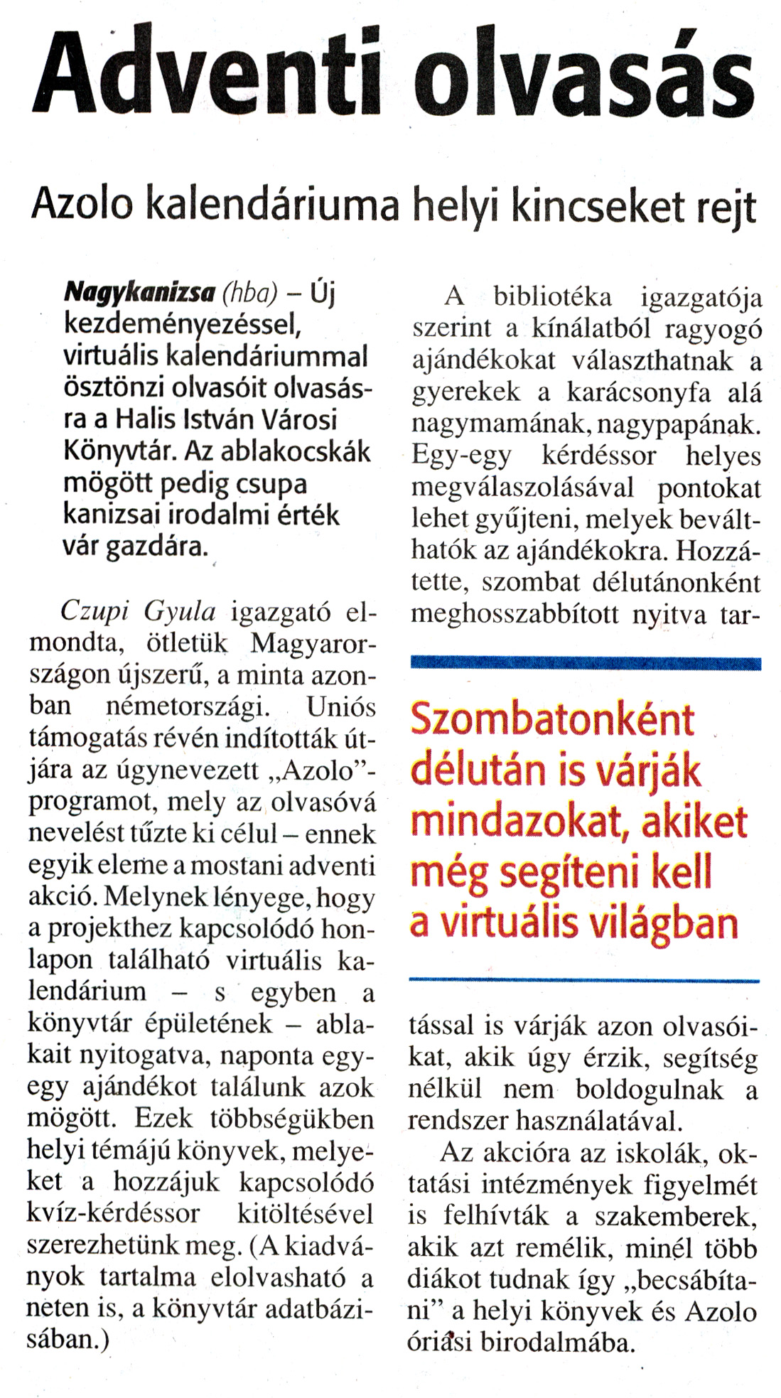 Nyilvános 1908 | 4856 | Zalai Hírlap 2010. december 7. 284. szám 11. oldal - Adventi olvasás | A cikk szövege: Adventi olvasás Azolo kalendáriuma helyi kincseket rejt Nagykanizsa (hba) - Új kezdeményezéssel, virtuális kalendáriummal ösztönzi olvasóit olvasásra a Halis István Városi Könyvtár. Az ablakocskák mögött pedig csupa kanizsai irodalmi érték vár gazdára. Czupi Gyula igazgató elmondta, ötletük Magyarországon újszerű, a minta azonban németországi. Uniós támogatás révén indították útjára az úgynevezett „Azolo"-programot, mely az olvasóvá nevelést tűzte ki célul - ennek egyik eleme a mostani adventi akció. Melynek lényege, hogy a projekthez kapcsolódó honlapon található virtuális kalendárium - s egyben a könyvtár épületének - ablakait nyitogatva, naponta egy-egy ajándékot találunk azok mögött. Ezek többségükben helyi témájú könyvek, melyeket a hozzájuk kapcsolódó kvíz-kérdéssor kitöltésével szerezhetünk meg. (A kiadványok tartalma elolvasható a neten is, a könyvtár adatbázisában.) A bibliotéka igazgatója szerint a kínálatból ragyogó ajándékokat választhatnak a gyerekek a karácsonyfa alá nagymamának, nagypapának. Egy-egy kérdéssor helyes megválaszolásával pontokat lehet gyűjteni, melyek beválthatók az ajándékokra. Hozzátette, szombat délutánonként meghosszabbított nyitva tartással is várják azon olvasóikat, akik úgy érzik, segítség nélkül nem boldogulnak a rendszer használatával. Az akcióra az iskolák, oktatási intézmények figyelmét is felhívták a szakemberek, akik azt remélik, minél több diákot tudnak így „becsábítani" a helyi könyvek és Azolo óriási birodalmába. Szombatonként délután is várják mindazokat, akiket még segíteni kell a virtuális világban |