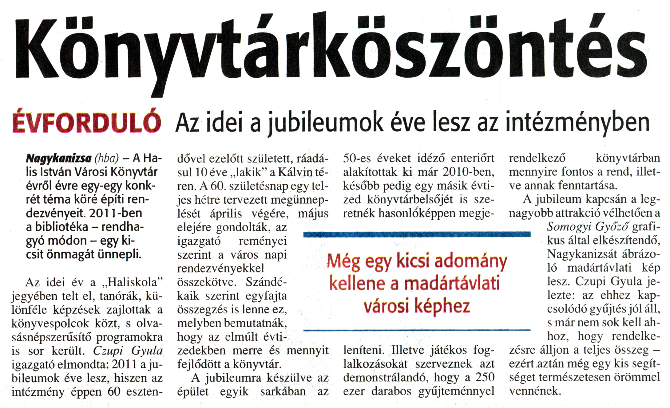 Nyilvános 1965 | 5706 | Zalai Hírlap 2011. január 3. 1. szám 7. oldal - Könyvtárköszöntés | A cikk szövege: Könyvtárköszöntés ÉVFORDULÓ Az idei a jubileumok éve lesz az intézményben Még egy kicsi adomány kellene a madártávlati városi képhez Nagykanizsa (hba) - A Halis István Városi Könyvtár évről évre egy-egy konkrét téma köré építi rendezvényeit. 2011-ben a bibliotéka - rendhagyó módon - egy kicsit önmagát ünnepli. Az idei év a „Haliskola" jegyében telt el, tanórák, különféle képzések zajlottak a könyvespolcok közt, s olvasásnépszerűsítő programokra is sor került. Czupi Gyula igazgató elmondta: 2011 a jubileumok éve lesz, hiszen az intézmény éppen 60 esztendővel ezelőtt született, ráadásul 10 éve „lakik" a Kálvin téren. A 60. születésnap egy teljes hétre tervezett megünneplését április végére, május elejére gondolták, az igazgató reményei szerint a város napi rendezvényekkel összekötve. Szándékaik szerint egyfajta összegzés is lenne ez, melyben bemutatnák, hogy az elmúlt évtizedekben merre és mennyit fejlődött a könyvtár. A jubileumra készülve az épület egyik sarkában az 50-es éveket idéző enteriőrt alakítottak ki már 2010-ben, később pedig egy másik évtized könyvtárbelsőjét is szeretnék hasonlóképpen megjeleníteni. Illetve játékos foglalkozásokat szerveznek azt demonstrálandó, hogy a 250 ezer darabos gyűjteménnyel rendelkező könyvtárban mennyire fontos a rend, illetve annak fenntartása. A jubileum kapcsán a legnagyobb attrakció vélhetően a Somogyi Győző grafikus által elkészítendő, Nagykanizsát ábrázoló madártávlati kép lesz. Czupi Gyula jelezte: az ehhez kapcsolódó gyűjtés jól áll, s már nem sok kell ahhoz, hogy rendelkezésre álljon a teljes összeg - ezért aztán még egy kis segítséget természetesen örömmel vennének. |