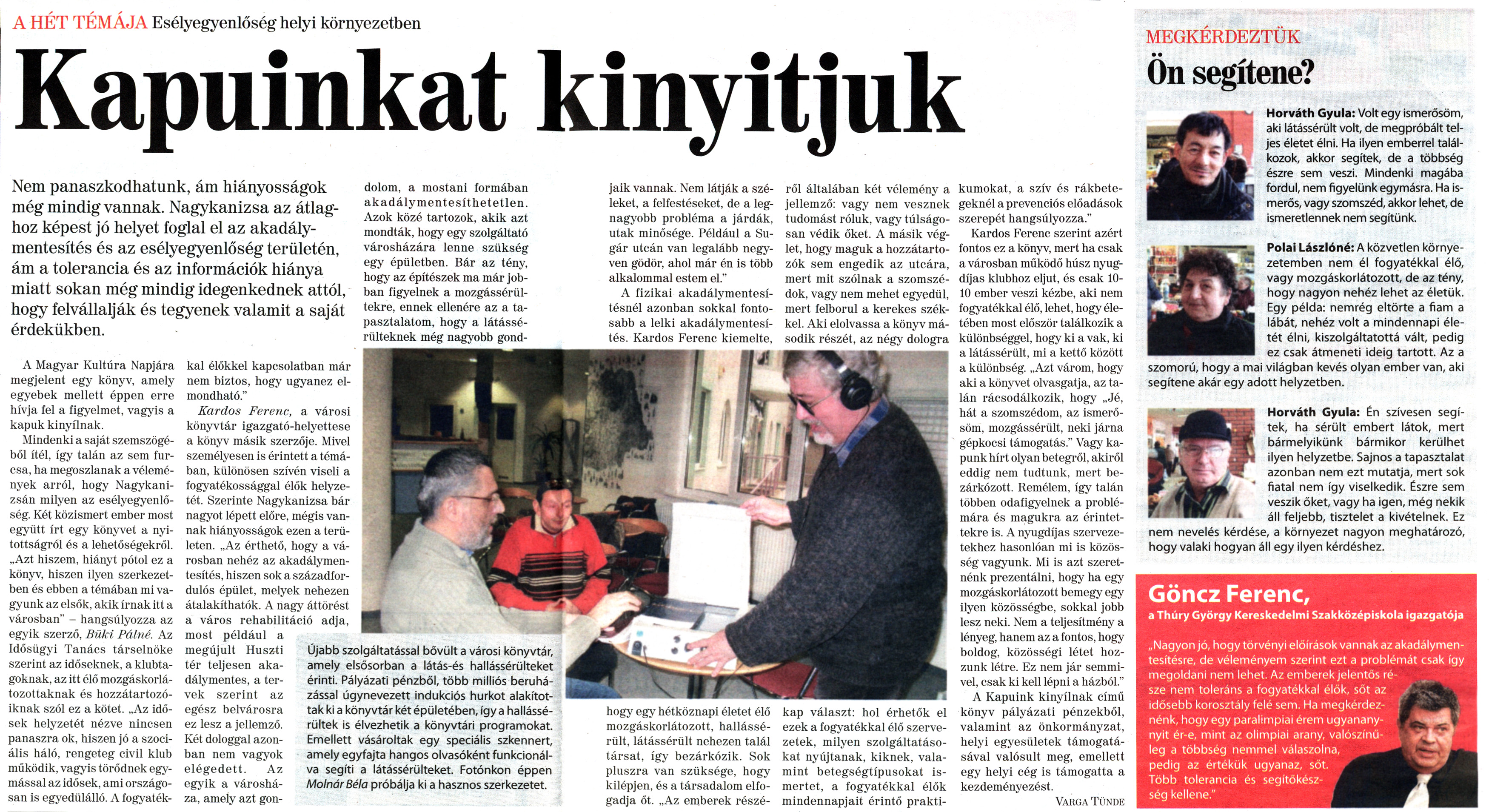 Nyilvános 1991 | 6687 | Nagykanizsai Maraton 2011. január 21. 3. szám 6-7. oldal - Kapuinkat kinyitjuk | A cikk szövege: A HÉT TÉMÁJA Esélyegyenlőség helyi környezetben Kapuinkat kinyitjuk Nem panaszkodhatunk, ám hiányosságok még mindig vannak. Nagykanizsa az átlaghoz képest jó helyet foglal el az akadálymentesítés és az esélyegyenlőség területén, ám a tolerancia és az információk hiánya miatt sokan még mindig idegenkednek attól, hogy felvállalják és tegyenek valamit a saját érdekükben. A Magyar Kultúra Napjára megjelent egy könyv, amely egyebek mellett éppen erre hívja fel a figyelmet, vagyis a kapuk kinyílnak. Mindenki a saját szemszögéből ítél, így talán az sem furcsa, ha megoszlanak a vélemények arról, hogy Nagykanizsán milyen az esélyegyenlőség. Két közismert ember most együtt írt egy könyvet a nyitottságról és a lehetőségekről. „Azt hiszem, hiányt pótol ez a könyv, hiszen ilyen szerkezetben és ebben a témában mi vagyunk az elsők, akik írnak itt a városban" - hangsúlyozza az egyik szerző, Büki Pálné. Az Idősügyi Tanács társelnöke szerint az időseknek, a klubtagoknak, az itt élő mozgáskorlátozottaknak és hozzátartozóiknak szól ez a kötet. „Az idősek helyzetét nézve nincsen panaszra ok. hiszen jó a szociális háló, rengeteg civil klub működik, vagyis törődnek egymással az idősek, ami országosan is egyedülálló. A fogyatékkal élőkkel kapcsolatban már nem biztos, hogy ugyanez elmondható." Kardos Ferenc, a városi könyvtár igazgató-helyettese a könyv másik szerzője. Mivel személyesen is érintett a témában, különösen szívén viseli a fogyatékossággal élők helyzetét. Szerinte Nagykanizsa bár nagyot lépett előre, mégis vannak hiányosságok ezen a területen. „Az érthető, hogy a városban nehéz az akadálymentesítés, hiszen sok a századfordulós épület, melyek nehezen átalakíthatók. A nagy áttörést a város rehabilitáció adja, most például a megújult Huszti tér teljesen akadálymentes, a tervek szerint az egész belvárosra ez lesz a jellemző. Két dologgal azonban nem vagyok elégedett. Az egyik a városháza, amely azt gondolom, a mostani formában akadály mentesít hetet len. Azok közé tartozok, akik azt mondták, hogy egy szolgáltató városházára lenne szükség egy épületben. Bár az tény, hogy az építészek ma már jobban figyelnek a mozgássérültekre, ennek ellenére az a tapasztalatom, hogy a látássérülteknek még nagyobb gondjaik vannak. Nem látják a széleket, a felfestéseket, de a legnagyobb probléma a járdák, utak minősége. Például a Sugár utcán van legalább negyven gödör, ahol már én is több alkalommal estem el." A fizikai akadálymentesítésnél azonban sokkal fontosabb a lelki akadálymentesítés. Kardos Ferenc kiemelte, hogy egy hétköznapi életet élő mozgáskorlátozott, hallássérült, látássérült nehezen talál társat, így bezárkózik. Sok pluszra van szüksége, hogy kilépjen, és a társadalom elfogadja őt. „Az emberek részéről általában két vélemény a jellemző: vagy nem vesznek tudomást róluk, vagy túlságosan védik őket. A másik véglet, hogy maguk a hozzátartozók sem engedik az utcára, mert mit szólnak a szomszédok, vagy nem mehet egyedül, mert felborul a kerekes székkel. Aki elolvassa a könyv második részét, az négy dologra kap választ: hol érhetők el ezek a fogyatékkal élő szervezetek, milyen szolgáltatásokat nyújtanak, kiknek, valamint betegségtípusokat ismertet, a fogyatékkal élők mindennapjait érintő praktikumokat, a szív és rákbetegeknél a prevenciós előadások szerepét hangsúlyozza." Kardos Ferenc szerint azért fontos ez a könyv, mert ha csak a városban működő húsz nyugdíjas klubhoz eljut, és csak 10-10 ember veszi kézbe, aki nem fogyatékkal élő, lehet, hogy életében most először találkozik a különbséggel, hogy ki a vak, ki a látássérült, mi a kettő között a különbség. „Azt várom, hogy aki a könyvet olvasgatja, az talán rácsodálkozik, hogy „Jé, hát a szomszédom, az ismerősöm, mozgássérült, neki járna gépkocsi támogatás." Vagy kapunk hírt olyan betegről, akiről eddig nem tudtunk, mert bezárkózott. Remélem, így talán többen odafigyelnek a problémára és magukra az érintettekre is. A nyugdíjas szervezetekhez hasonlóan mi is közösség vagyunk. Mi is azt szeretnénk prezentálni, hogy ha egy mozgáskorlátozott bemegy egy ilyen közösségbe, sokkal jobb lesz neki. Nem a teljesítmény a lényeg, hanem az a fontos, hogy boldog, közösségi létet hozzunk létre. Ez nem jár semmivel, csak ki kell lépni a házból." A Kapuink kinyílnak című könyv pályázati pénzekből, valamint az önkormányzat, helyi egyesületek támogatásával valósult meg, emellett egy helyi cég is támogatta a kezdeményezést. Varga Tünde Újabb szolgáltatással bővült a városi könyvtár, amely elsősorban a látás-és hallássérülteket érinti. Pályázati pénzből, több milliós beruházással úgynevezett indukciós hurkot alakítottak kl a könyvtár két épületében, így a hallássérültek is élvezhetik a könyvtári programokat. Emellett vásároltak egy speciális szkennert, amely egyfajta hangos olvasóként funkcionálva segíti a látássérülteket. Fotónkon éppen Molnár Béla próbálja kl a hasznos szerkezetet. MEGKÉRDEZTÜK Ön segítene? Horváth Gyula: Volt egy Ismerősöm, aki látássérült volt, de megpróbált teljes életet élni. Ha ilyen emberrel találkozok, akkor segítek, de a többség észre sem veszi. Mindenki magába fordul, nem figyelünk egymásra. Ha ismerős, vagy szomszéd, akkor lehet, de ismeretlennek nem segítünk. Polai Lászlóné: A közvetlen környezetemben nem él fogyatékkal élő, vagy mozgáskorlátozott, de az tény, hogy nagyon nehéz lehet az életük. Egy példa: nemrég 
