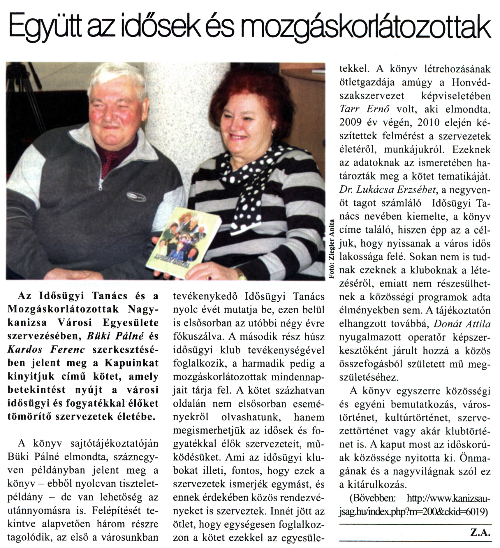 Nyilvános 2541 | 7768 | Kanizsa 2011. január 20. 2. szám 5. oldal - Együtt az idősek és mozgáskorlátozottak | A cikk szövege: Együtt az idősek és mozgáskorlátozottak Az Idősügyi Tanács és a Mozgáskorlátozottak Nagykanizsa Városi Egyesülete szervezésében, Büki Pálné és Kardos Ferenc szerkesztésében jelent meg a Kapuinkat kinyitjuk című kötet, amely betekintést nyújt a városi idősügyi és fogyatékkal élőket tömörítő szervezetek életébe. A könyv sajtótájékoztatóján Büki Pálné elmondta, száznegyven példányban jelent meg a könyv - ebből nyolcvan tiszteletpéldány - de van lehetőség az utánnyomásra is. Felépítését tekintve alapvetően három részre tagolódik, az első a városunkban tevékenykedő Idősügyi Tanács nyolc évét mutatja be, ezen belül is elsősorban az utóbbi négy évre fókuszálva. A második rész húsz idősügyi klub tevékenységével foglalkozik, a harmadik pedig a mozgáskorlátozottak mindennapjait tárja fel. A kötet százhatvan oldalán nem elsősorban eseményekről olvashatunk, hanem megismerhetjük az idősek és fogyatékkal élők szervezeteit, működésüket. Ami az idősügyi klubokat illeti, fontos, hogy ezek a szervezetek ismerjék egymást, és ennek érdekében közös rendezvényeket is szerveztek. Innét jött az ötlet, hogy egységesen foglalkozzon a kötet ezekkel az egyesületekkel. A könyv létrehozásának ötletgazdája amúgy a Honvédszakszervezet képviseletében Tarr Ernő volt, aki elmondta, 2009 év végén, 2010 elején készítettek felmérést a szervezetek életéről, munkájukról. Ezeknek az adatoknak az ismeretében határozták meg a kötet tematikáját. Dr. Lukácsa Erzsébet, a negyvenöt tagot számláló Idősügyi Tanács nevében kiemelte, a könyv címe találó, hiszen épp az a céljuk, hogy nyissanak a város idős lakossága felé. Sokan nem is tudnak ezeknek a kluboknak a létezéséről, emiatt nem részesülhetnek a közösségi programok adta élményekben sem. A tájékoztatón elhangzott továbbá, Donát Attila nyugalmazott operatőr képszerkesztőként járult hozzá a közös összefogásból született mű megszületéséhez. A könyv egyszerre közösségi és egyéni bemutatkozás, várostörténet, kultúrtörténet, szervezettörténet vagy akár klubtörténet is. A kaput most az időskorúak közössége nyitotta ki. Önmagának és a nagyvilágnak szól ez a kitárulkozás. (Bővebben: http://www.kanizsaujsag.hu/index.php?m=200&ckid=6019) Z.A. Fotó: Ziegler Anita |