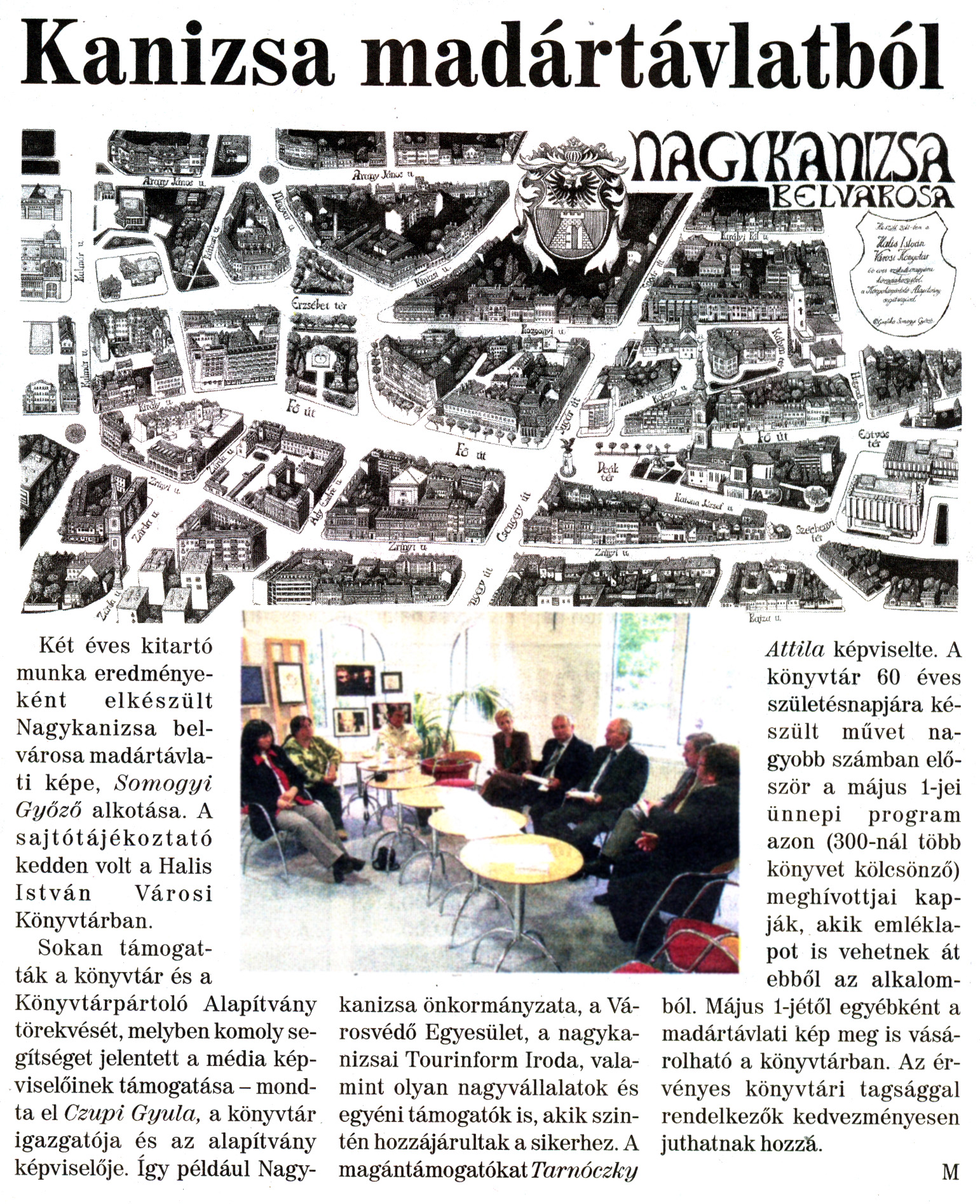 Nyilvános 2126 | 7302 | Nagykanizsai Maraton 2011. április 29. 17. szám 2. oldal - Kanizsa madártávlatból | A cikk szövege: Kanizsa madártávlatból Két éves kitartó munka eredményeként elkészült Nagykanizsa belvárosa madártávlati képe, Somogyi Győző alkotása. A sajtótájékoztató kedden volt a Halis István Városi Könyvtárban. Sokan támogatták a könyvtár és a Könyvtárpártoló Alapítvány törekvését, melyben komoly segítséget jelentett a média képviselőinek támogatása - mondta el Czupi Gyula, a könyvtár igazgatója és az alapítvány képviselője. Így például Nagy- kanizsa önkormányzata, a Városvédő Egyesület, a nagykanizsai Tourinform Iroda, valamint olyan nagyvállalatok és egyéni támogatók is, akik szintén hozzájárultak a sikerhez. A magántámogatókat Tarnóczky Attila képviselte. A könyvtár 60 éves születésnapjára készült művet nagyobb számban először a május 1-jei ünnepi program azon (300-nál több könyvet kölcsönző) meghívottjai kapják, akik emléklapot is vehetnek át ebből az alkalomból. Május 1-jétől egyébként a madártávlati kép meg is vásárolható a könyvtárban. Az érvényes könyvtári tagsággal rendelkezők kedvezményesen juthatnak hozzá. M |