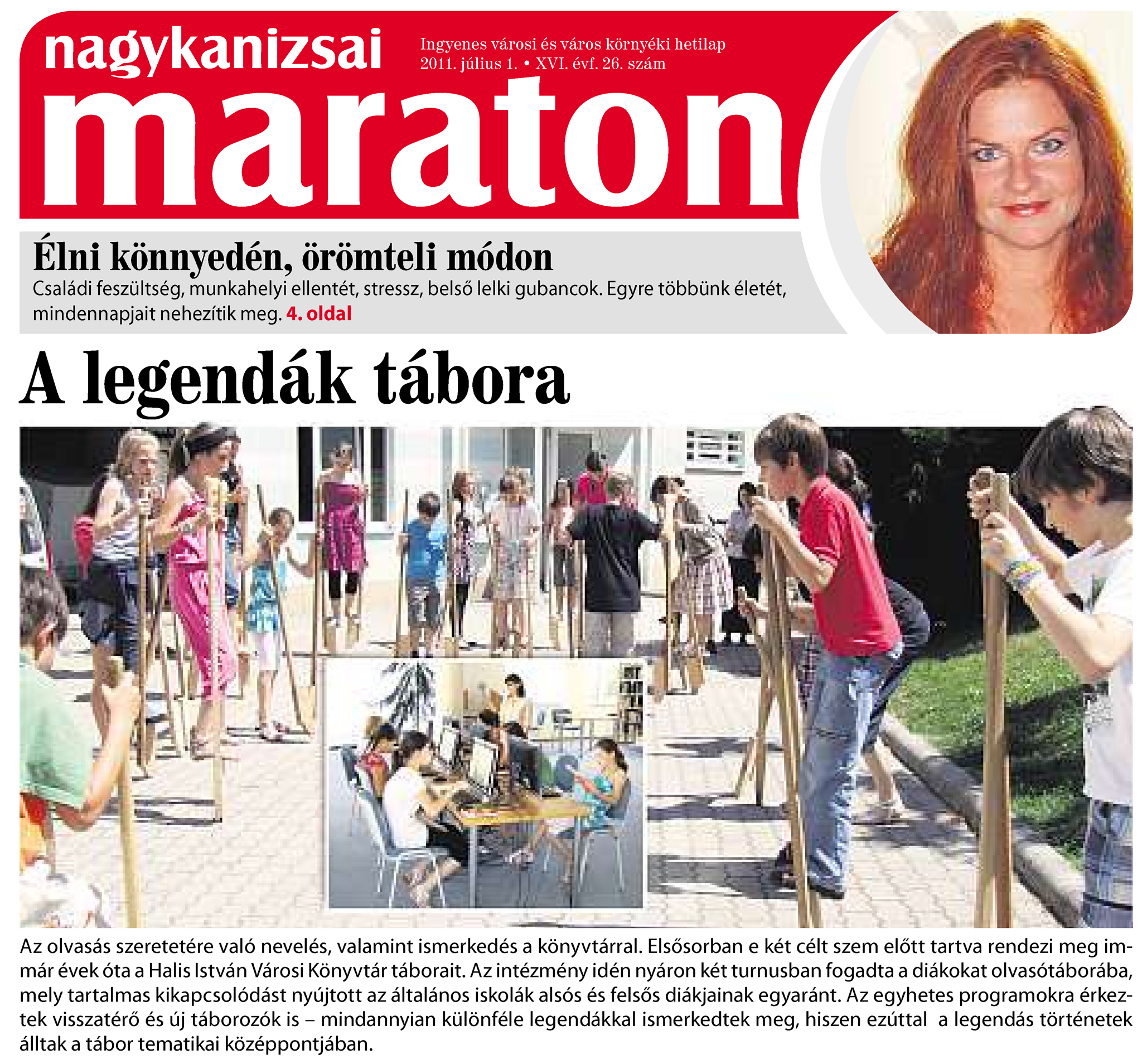 Nyilvános 2210 | 7894 | Nagykanizsai Maraton 2011. július 1. 26. szám 1. oldal - A legendák tábora | A legendák tábora Az olvasás szeretetére való nevelés, valamint ismerkedés a könyvtárral. Elsősorban e két célt szem előtt tartva rendezi meg immár évek óta a Halis István Városi Könyvtár táborait. Az intézmény idén nyáron két turnusban fogadta a diákokat olvasótáborába, mely tartalmas kikapcsolódást nyújtott az általános iskolák alsós és felsős diákjainak egyaránt. Az egyhetes programokra érkeztek visszatérő és új táborozók is – mindannyian különféle legendákkal ismerkedtek meg, hiszen ezúttal a legendás történetek álltak a tábor tematikai középpontjában. |