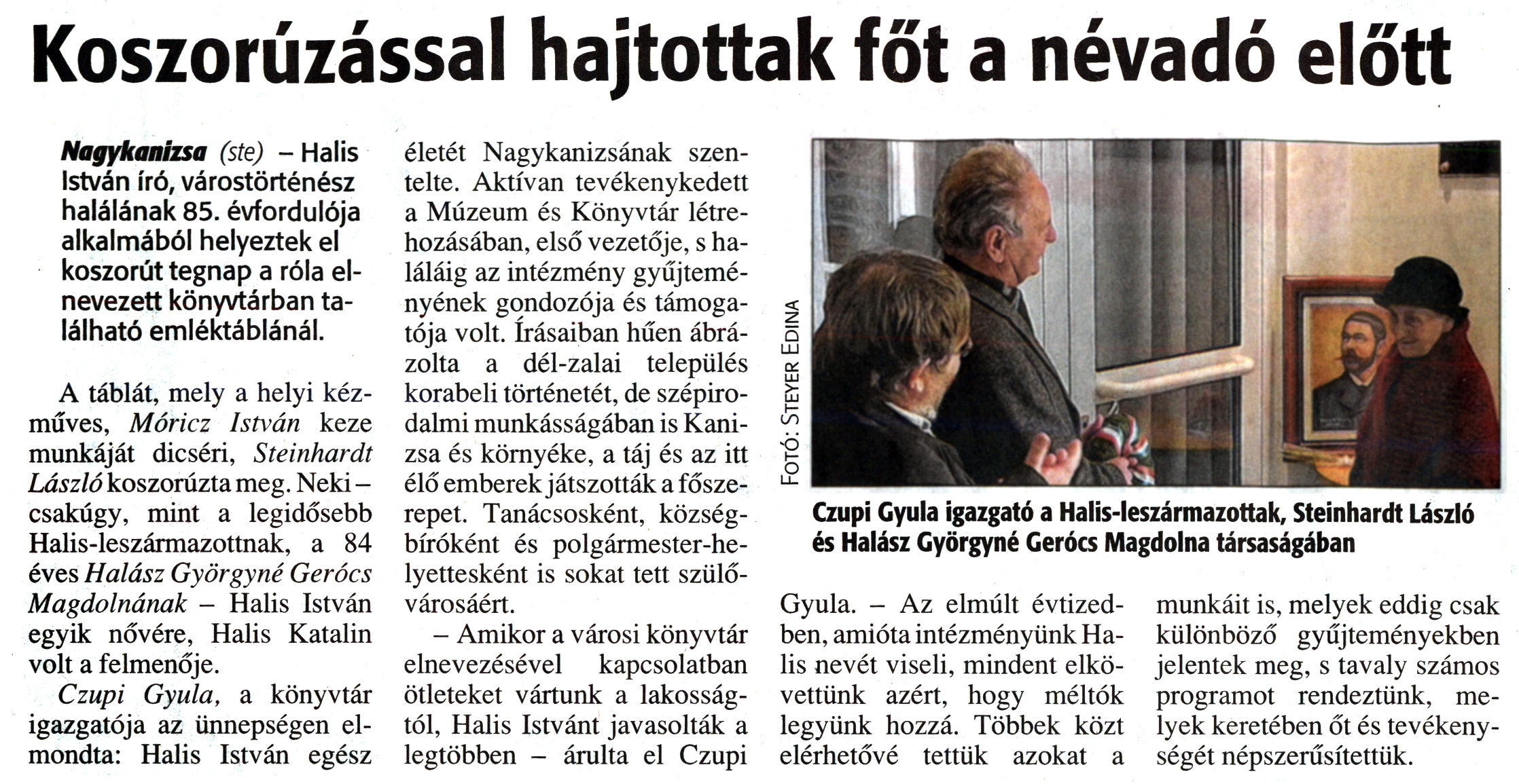 Nyilvános 1885 | 4329 | Zalai Hírlap 2012. február 24. 47. szám 4. oldal - Koszorúzással hajtottak főt a névadó előtt | Koszorúzással hajtottak főt a névadó előtt Nagykanizsa (ste) - Halis István író, várostörténész halálának 85. évfordulója alkalmából helyeztek el koszorút tegnap a róla elnevezett könyvtárban található emléktáblánál. A táblát, mely a helyi kézműves, Móricz István keze munkáját dicséri, Steinhardt László koszorúzta meg. Neki -csakúgy, mint a legidősebb Halis-leszármazottnak, a 84 éves Halász Györgyné Gerócs Magdolnának - Halis István egyik nővére, Halis Katalin volt a felmenője. Czupi Gyula, a könyvtár igazgatója az ünnepségen elmondta: Halis István egész életét Nagykanizsának szentelte. Aktívan tevékenykedett a Múzeum és Könyvtár létrehozásában, első vezetője, s haláláig az intézmény gyűjteményének gondozója és támogatója volt. Írásaiban hűen ábrázolta a dél-zalai település korabeli történetét, de szépirodalmi munkásságában is Kanizsa és környéke, a táj és az itt élő emberek játszották a főszerepet. Tanácsosként, községbíróként és polgármester-helyettesként is sokat tett szülővárosáért. - Amikor a városi könyvtár elnevezésével kapcsolatban ötleteket vártunk a lakosságtól, Halis Istvánt javasolták a legtöbben - árulta el Czupi Gyula. - Az elmúlt évtizedben, amióta intézményünk Halis nevét viseli, mindent elkövettünk azért, hogy méltók legyünk hozzá. Többek közt elérhetővé tettük azokat a munkáit is, melyek eddig csak különböző gyűjteményekben jelentek meg, s tavaly számos programot rendeztünk, melyek keretében őt és tevékenységét népszerűsítettük. Czupi Gyula igazgató a Halis-leszármazottak, Steinhardt László és Halász Györgyné Gerócs Magdolna társaságában Fotó: Steyer Edina |