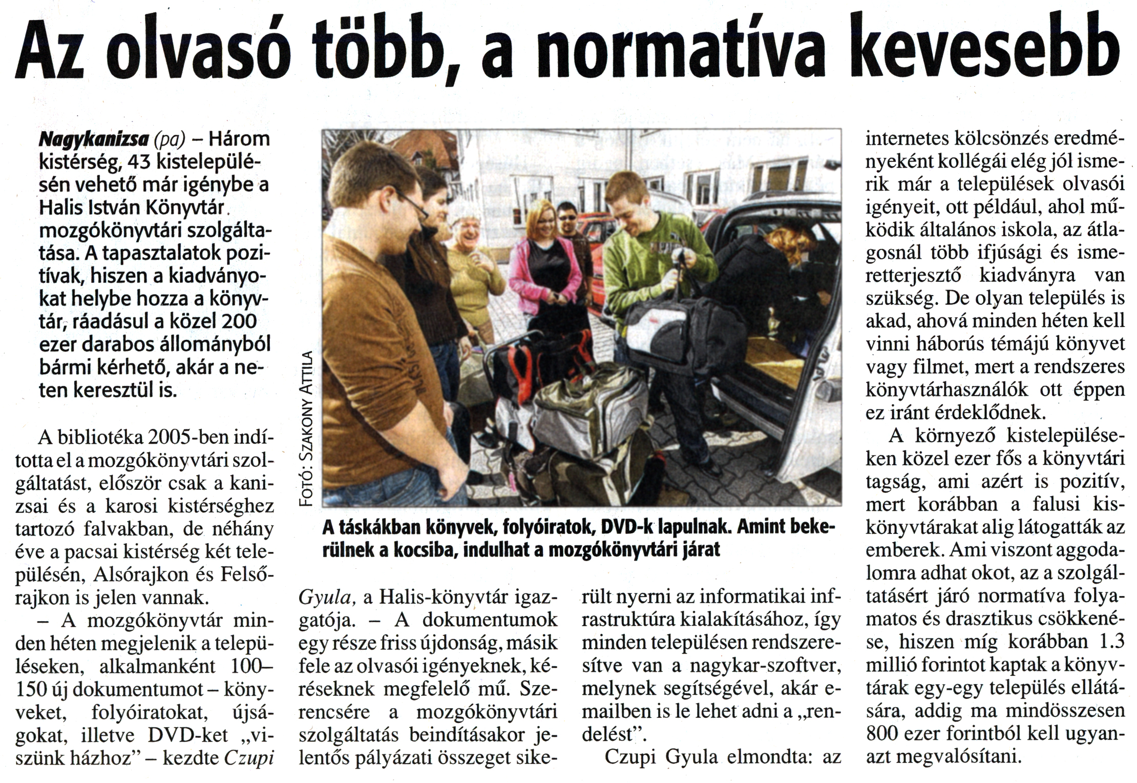 Nyilvános 1857 | 4255 | Zalai Hírlap 2012. március 20. 67. szám 4. oldal - Az olvasó több, a normatíva kevesebb | Az olvasó több, a normatíva kevesebb A táskákban könyvek, folyóiratok, DVD-k lapulnak. Amint bekerülnek a kocsiba, indulhat a mozgókönyvtári járat Nagykanizsa (pa) - Három kistérség, 43 kistelepülésén vehető már igénybe a Halis István Könyvtár mozgókönyvtári szolgáltatása. A tapasztalatok pozitívak, hiszen a kiadványokat helybe hozza a könyvtár, ráadásul a közel 200 ezer darabos állományból bármi kérhető, akár a ne-ten keresztül is. A bibliotéka 2005-ben indította el a mozgókönyvtári szolgáltatást, először csak a kanizsai és a karosi kistérséghez tartozó falvakban, de néhány éve a pacsai kistérség két településén, Alsórajkon és Felsőrajkon is jelen vannak. - A mozgókönyvtár minden héten megjelenik a településeken, alkalmanként 100-150 új dokumentumot - könyveket, folyóiratokat, újságokat, illetve DVD-ket „viszünk házhoz" - kezdte Czupi Fotó: Szakony Attila Gyula, a Halis-könyvtár igazgatója. - A dokumentumok egy része friss újdonság, másik fele az olvasói igényeknek, kéréseknek megfelelő mű. Szerencsére a mozgókönyvtári szolgáltatás beindításakor jelentős pályázati összeget sike- rült nyerni az informatikai infrastruktúra kialakításához, így minden településen rendszeresítve van a nagykar-szoftver, melynek segítségével, akár e-mailben is le lehet adni a „rendelést". Czupi Gyula elmondta: az internetes kölcsönzés eredményeként kollégái elég jól ismerik már a települések olvasói igényeit, ott például, ahol működik általános iskola, az átlagosnál több ifjúsági és ismeretterjesztő kiadványra van szükség. De olyan település is akad, ahová minden héten kell vinni háborús témájú könyvet vagy filmet, mert a rendszeres könyvtárhasználók ott éppen ez iránt érdeklődnek. A környező kistelepüléseken közel ezer fős a könyvtári tagság, ami azért is pozitív, mert korábban a falusi kiskönyvtárakat alig látogatták az emberek. Ami viszont aggodalomra adhat okot, az a szolgáltatásért járó normatíva folyamatos és drasztikus csökkenése, hiszen míg korábban 1.3 millió forintot kaptak a könyvtárak egy-egy település ellátására, addig ma mindösszesen 800 ezer forintból kell ugyanazt megvalósítani. |