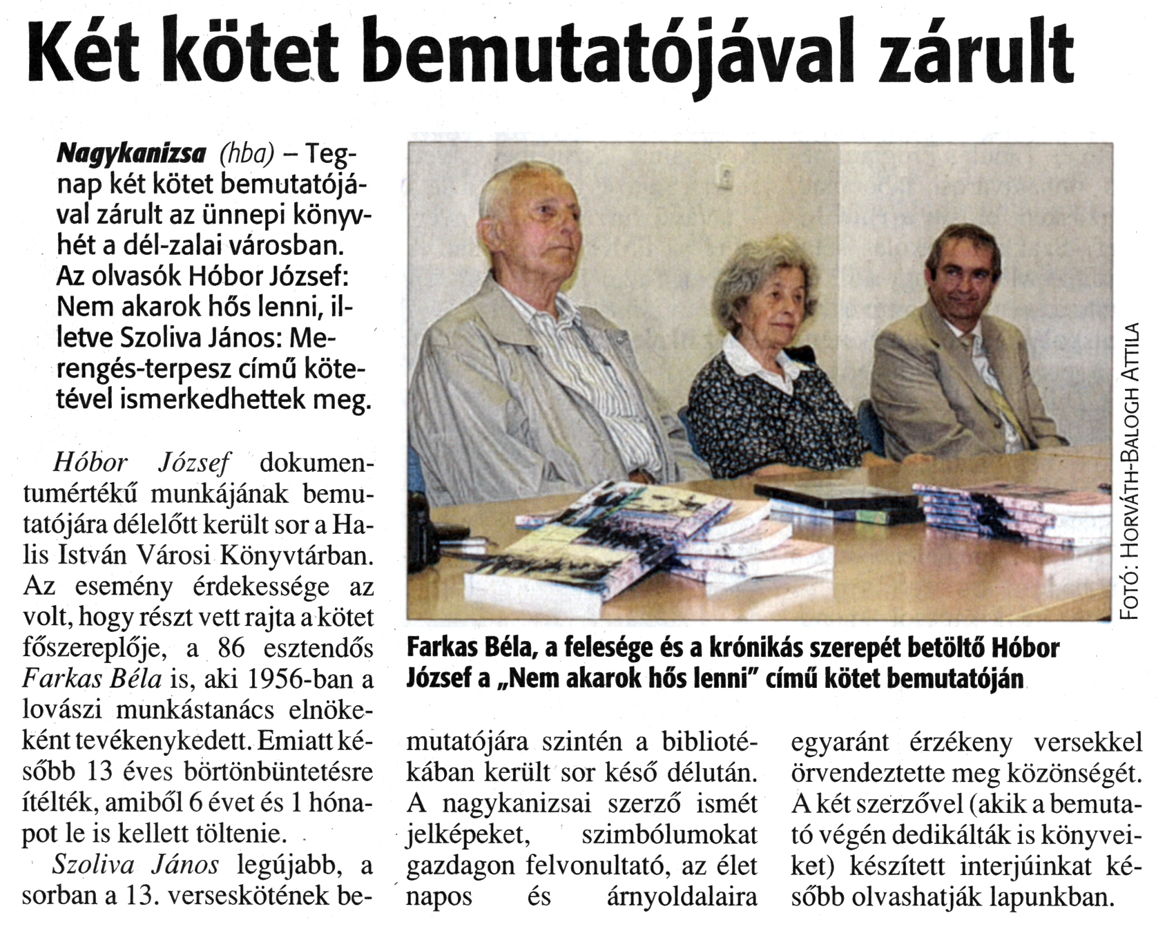 Nyilvános 1694 | 3521 | Zalai Hírlap 2012. június 9. 134. szám 5. oldal - Két kötet bemutatójával zárult | Két kötet bemutatójával zárult Farkas Béla, a felesége és a krónikás szerepét betöltő Hóbor József a „Nem akarok hős lenni" című kötet bemutatóján Fotó: Horváth-Balogh Attila Nagykanizsa (hba) - Tegnap két kötet bemutatójával zárult az ünnepi könyvhét a dél-zalai városban. Az olvasók Hóbor József: Nem akarok hős lenni, illetve Szoliva János: Merengés-terpesz című kötetével ismerkedhettek meg. Hóbor József dokumentumértékű munkájának bemutatójára délelőtt került sor a Halis István Városi Könyvtárban. Az esemény érdekessége az volt, hogy részt vett rajta a kötet főszereplője, a 86 esztendős Farkas Béla is, aki 1956-ban a lovászi munkástanács elnökeként tevékenykedett. Emiatt később 13 éves börtönbüntetésre ítélték, amiből 6 évet és 1 hónapot le is kellett töltenie. Szoliva János legújabb, a sorban a 13. verseskötének be- mutatójára szintén a bibliotékában került sor késő délután. A nagykanizsai szerző ismét jelképeket, szimbólumokat gazdagon felvonultató, az élet napos és árnyoldalaira egyaránt érzékeny versekkel örvendeztette meg közönségét. A két szerzővel (akik a bemutató végén dedikálták is könyveiket) készített interjúinkat később olvashatják lapunkban. |