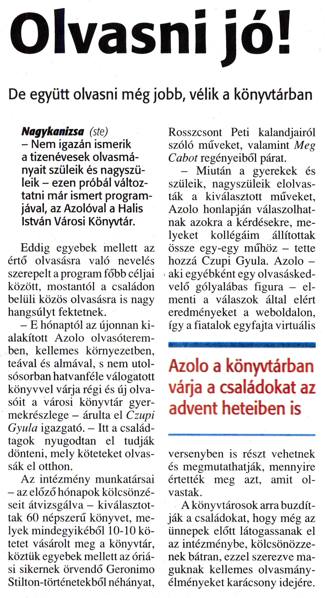 Nyilvános 1781 | 4492 | Zalai Hírlap 2012. december 6. 285. szám 11. oldal - Olvasni jó | Olvasni jó! De együtt olvasni még jobb, vélik a könyvtárban Azolo a könyvtárban várja a családokat az advent heteiben is Nagykanizsa (ste) - Nem igazán ismerik a tizenévesek olvasmányait szüleik és nagyszüleik - ezen próbál változtatni már ismert programjával, az Azolóval a Halis István Városi Könyvtár. Eddig egyebek mellett az értő olvasásra való nevelés szerepelt a program főbb céljai között, mostantól a családon belüli közös olvasásra is nagy hangsúlyt fektetnek. - E hónaptól az újonnan kialakított Azolo olvasóteremben, kellemes környezetben, teával és almával, s nem utolsósorban hatvanféle válogatott könyvvel várja régi és új olvasóit a városi könyvtár gyermekrészlege - árulta el Czupi Gyula igazgató. - Itt a családtagok nyugodtan el tudják dönteni, mely köteteket olvassák el otthon. Az intézmény munkatársai - az előző hónapok kölcsönzéseit átvizsgálva - kiválasztottak 60 népszerű könyvet, melyek mindegyikéből 10-10 kötetet vásárolt meg a könyvtár, köztük egyebek mellett az óriási sikernek örvendő Geronimo Stilton-történetekből néhányat, Rosszcsont Peti kalandjairól szóló műveket, valamint Meg Cabot regényeiből párat. - Miután a gyerekek és szüleik, nagyszüleik elolvasták a kiválasztott műveket, Azolo honlapján válaszolhatnak azokra a kérdésekre, melyeket kollégáim állítottak össze egy-egy műhöz - tette hozzá Czupi Gyula. Azolo -aki egyébként egy olvasáskedvelő gólyalábas figura - elmenti a válaszok által elért eredményeket a weboldalon, így a fiatalok egyfajta virtuális versenyben is részt vehetnek és megmutathatják, mennyire értették meg azt, amit olvastak. A könyvtárosok arra buzdítják a családokat, hogy még az ünnepek előtt látogassanak el az intézménybe, kölcsönözzenek bátran, ezzel szerezve maguknak kellemes olvasmányélményeket karácsony idejére. |