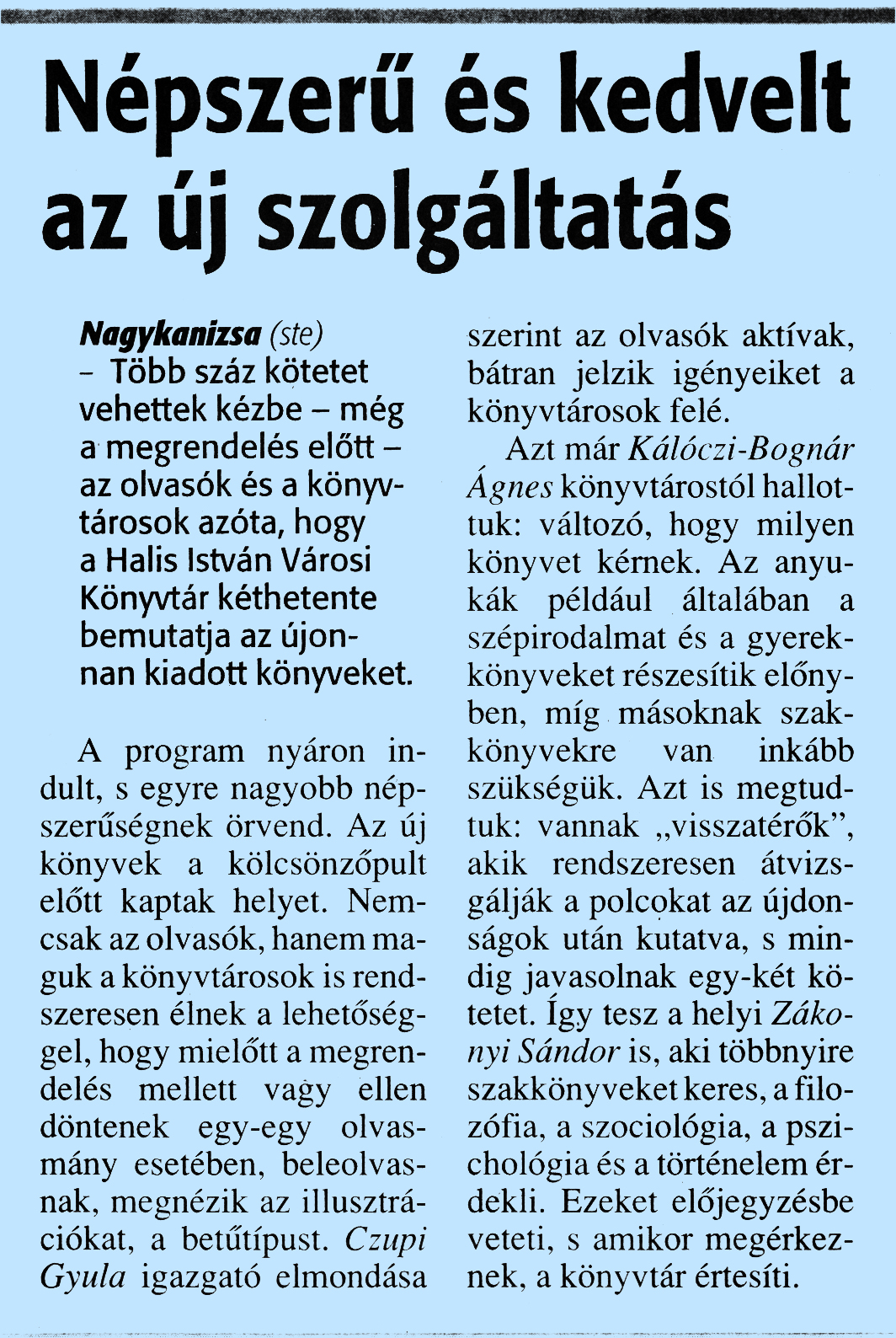 Nyilvános 1746 | 3913 | Zalai Hírlap 2012. november 22. 273. szám 11. oldal - Népszerű és kedvelt az új szolgáltatás | Népszerű és kedvelt az új szolgáltatás Nagykanizsa (ste) - Több száz kötetet vehettek kézbe - még a megrendelés előtt -az olvasók és a könyvtárosok azóta, hogy a Halis István Városi Könyvtár kéthetente bemutatja az újonnan kiadott könyveket. A program nyáron indult, s egyre nagyobb népszerűségnek örvend. Az új könyvek a kölcsönzőpult előtt kaptak helyet. Nemcsak az olvasók, hanem maguk a könyvtárosok is rendszeresen élnek a lehetőséggel, hogy mielőtt a megrendelés mellett vagy ellen döntenek egy-egy olvasmány esetében, beleolvasnak, megnézik az illusztrációkat, a betűtípust. Czupi Gyula igazgató elmondása szerint az olvasók aktívak, bátran jelzik igényeiket a könyvtárosok felé. Azt már Kálóczi-Bognár Ágnes könyvtárostól hallottuk: változó, hogy milyen könyvet kérnek. Az anyukák például általában a szépirodalmat és a gyerekkönyveket részesítik előnyben, míg másoknak szakkönyvekre van inkább szükségük. Azt is megtudtuk: vannak „visszatérők", akik rendszeresen átvizsgálják a polcokat az újdonságok után kutatva, s mindig javasolnak egy-két kötetet. Így tesz a helyi Zákonyi Sándor is, aki többnyire szakkönyveket keres, a filozófia, a szociológia, a pszichológia és a történelem érdekli. Ezeket előjegyzésbe veteti, s amikor megérkeznek, a könyvtár értesíti. |