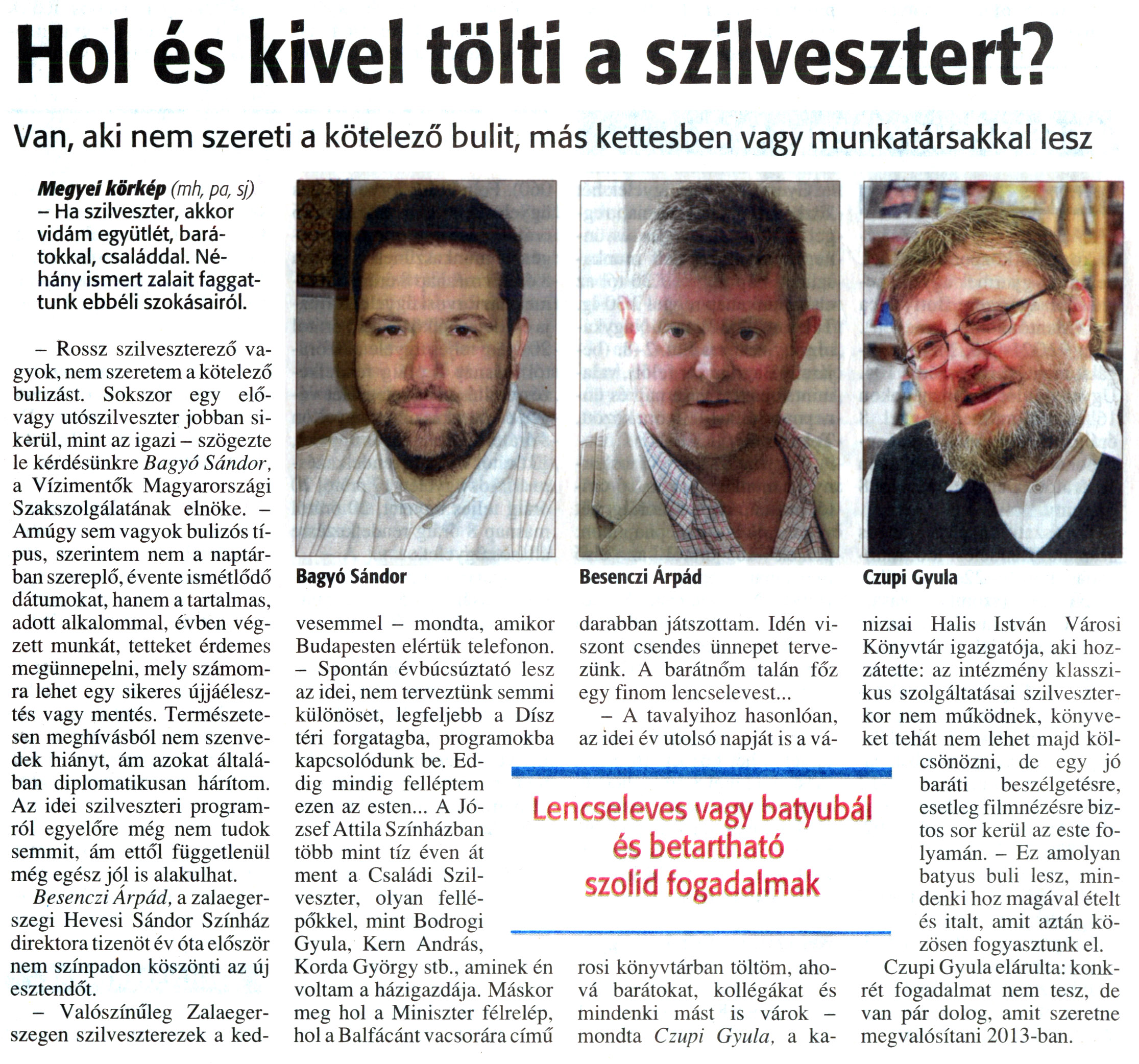 Nyilvános 1933 | 4771 | Zalai Hírlap 2012. december 31. 304. szám 3. oldal - Hol és kivel tölti a szilvesztert | Hol és kivel tölti a szilvesztert? Van, aki nem szereti a kötelező bulit, más kettesben vagy munkatársakkal lesz Lencseleves vagy batyubál és betartható szolid fogadalmak Bagyó Sándor Besenczi Árpád Czupi Gyula Megyei körkép (mh, pa, sj) - Ha szilveszter, akkor vidám együtlét, barátokkal, családdal. Néhány ismert zalait faggattunk ebbéli szokásairól. - Rossz szilveszterező vagyok, nem szeretem a kötelező bulizást. Sokszor egy elővagy utószilveszter jobban sikerül, mint az igazi - szögezte le kérdésünkre Bagyó Sándor, a Vízimentők Magyarországi Szakszolgálatának elnöke. -Amúgy sem vagyok bulizós típus, szerintem nem a naptárban szereplő, évente ismétlődő dátumokat, hanem a tartalmas, adott alkalommal, évben végzett munkát, tetteket érdemes megünnepelni, mely számomra lehet egy sikeres újjáélesztés vagy mentés. Természetesen meghívásból nem szenvedek hiányt, ám azokat általában diplomatikusan hárítom. Az idei szilveszteri programról egyelőre még nem tudok semmit, ám ettől függetlenül még egész jól is alakulhat. Besenczi Árpád, a zalaegerszegi Hevesi Sándor Színház direktora tizenöt év óta először nem színpadon köszönti az új esztendőt. - Valószínűleg Zalaegerszegen szilveszterezek a kedvesemmel - mondta, amikor Budapesten elértük telefonon. - Spontán évbúcsúztató lesz az idei, nem terveztünk semmi különöset, legfeljebb a Dísz téri forgatagba, programokba kapcsolódunk be. Eddig mindig felléptem ezen az esten... A József Attila Színházban több mint tíz éven át ment a Családi Szilveszter, olyan fellépőkkel, mint Bodrogi Gyula, Kern András, Korda György stb., aminek én voltam a házigazdája. Máskor meg hol a Miniszter félrelép, hol a Balfácánt vacsorára című darabban játszottam. Idén viszont csendes ünnepet tervezünk. A barátnőm talán főz egy finom lencselevest... - A tavalyihoz hasonlóan, az idei év utolsó napját is a városi könyvtárban töltöm, ahová barátokat, kollégákat és mindenki mást is várok -mondta Czupi Gyula, a kanizsai Halis István Városi Könyvtár igazgatója, aki hozzátette: az intézmény klasszikus szolgáltatásai szilveszterkor nem működnek, könyveket tehát nem lehet majd kölcsönözni, de egy jó baráti beszélgetésre, esetleg filmnézésre biztos sor kerül az este folyamán. - Ez amolyan batyus buli lesz, mindenki hoz magával ételt és italt, amit aztán közösen fogyasztunk el. Czupi Gyula elárulta: konkrét fogadalmat nem tesz, de van pár dolog, amit szeretne megvalósítani 2013-ban. |