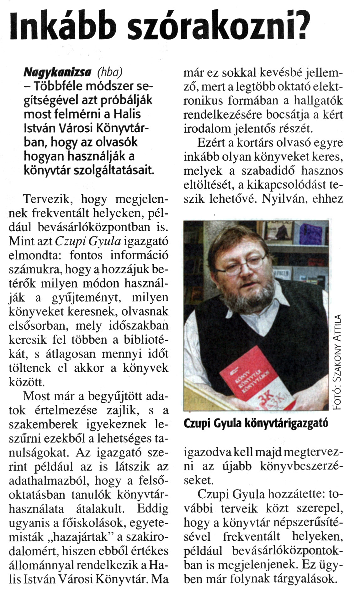 Nyilvános 1748 | 3860 | Zalai Hírlap 2013. január 14. 11. szám 3. oldal - Inkább szórakozni | Inkább szórakozni? Nagykanizsa (hba) - Többféle módszer segítségével azt próbálják most felmérni a Halis István Városi Könyvtárban, hogy az olvasók hogyan használják a könyvtár szolgáltatásait. Tervezik, hogy megjelennek frekventált helyeken, például bevásárlóközpontban is. Mint azt Czupi Gyula igazgató elmondta: fontos információ számukra, hogy a hozzájuk betérők milyen módon használják a gyűjteményt, milyen könyveket keresnek, olvasnak elsősorban, mely időszakban keresik fel többen a bibliotékát, s átlagosan mennyi időt töltenek el akkor a könyvek között. Most már a begyűjtött adatok értelmezése zajlik, s a szakemberek igyekeznek leszűrni ezekből a lehetséges tanulságokat. Az igazgató szerint például az is látszik az adathalmazból, hogy a felsőoktatásban tanulók könyvtárhasználata átalakult. Eddig ugyanis a főiskolások, egyetemisták „hazajártak" a szakirodalomért, hiszen ebből értékes állománnyal rendelkezik a Halis István Városi Könyvtár. Ma már ez sokkal kevésbé jellemző, mert a legtöbb oktató elektronikus formában a hallgatók rendelkezésére bocsátja a kért irodalom jelentős részét. Ezért a kortárs olvasó egyre inkább olyan könyveket keres, melyek a szabadidő hasznos eltöltését, a kikapcsolódást teszik lehetővé. Nyilván, ehhez igazodva kell majd megtervezni az újabb könyvbeszerzéseket. Czupi Gyula hozzátette: további terveik közt szerepel, hogy a könyvtár népszerűsítésével frekventált helyeken, például bevásárlóközpontokban is megjelenjenek. Ez ügyben már folynak tárgyalások. Czupi Gyula könyvtárigazgató Fotó: Szakony Attila |