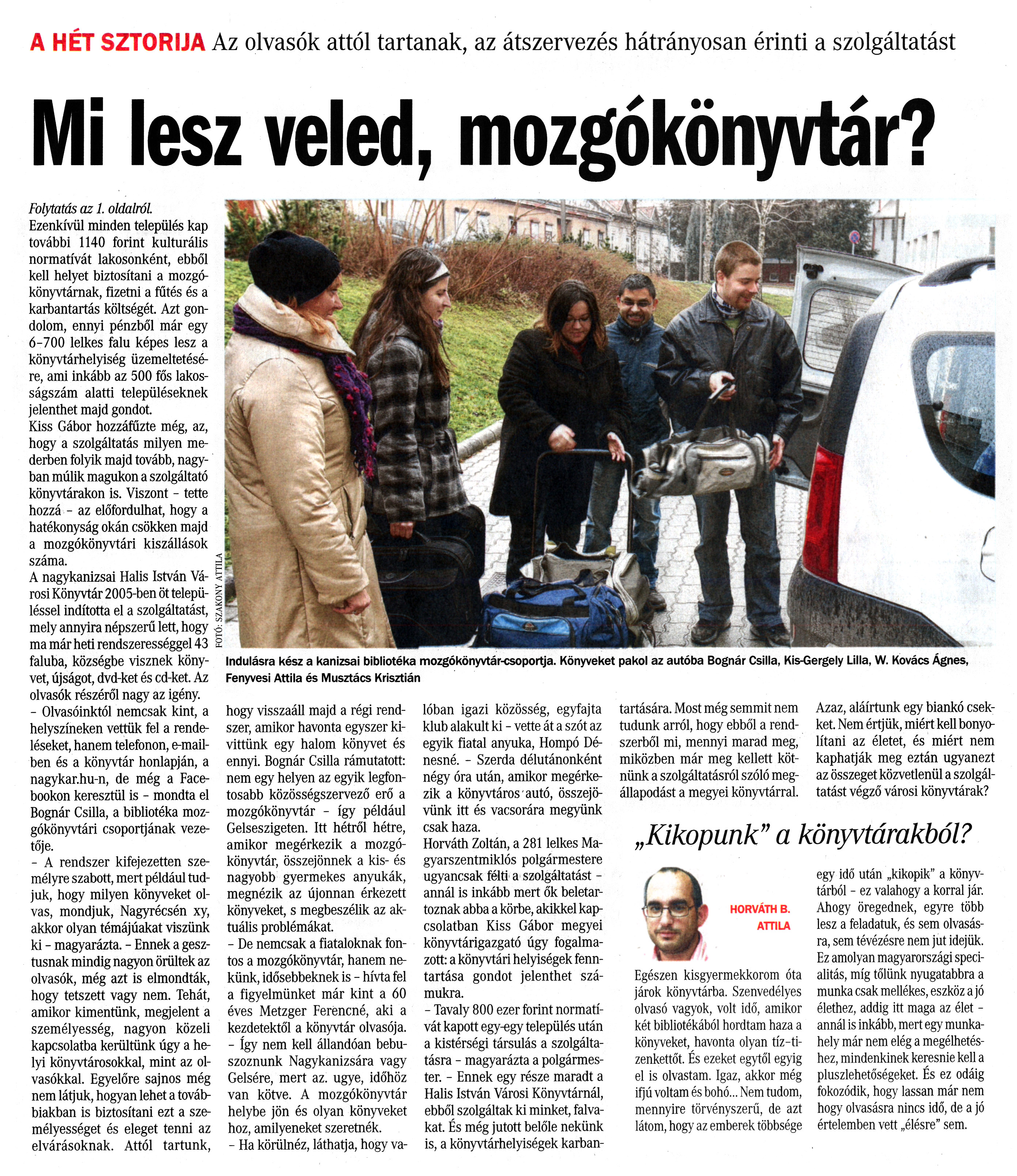 Nyilvános 1733 | 4921 | Vasárnapi Zalai Hírlap 2013. január 13. 2. szám 3. oldal - Mi lesz veled, mozgókönyvtár? | A HÉT SZTORIJA Az olvasók attól tartanak, az átszervezés hátrányosan érinti a szolgáltatást Mi lesz veled, mozgókönyvtár? FOTÓ: SZAKONY ATTILA Indulásra kész a kanizsai bibliotéka mozgókönyvtár-csoportja. Könyveket pakol az autóba Bognár Csilla, Kis-Gergely Lilla, W. Kovács Ágnes, Fenyvesi Attila és Musztács Krisztián Folytatás az 1. oldalról. Ezenkívül minden település kap további 1140 forint kulturális normatívát lakosonként, ebből kell helyet biztosítani a mozgókönyvtárnak, fizetni a fűtés és a karbantartás költségét. Azt gondolom, ennyi pénzből már egy 6-700 lelkes falu képes lesz a könyvtárhelyiség üzemeltetésére, ami inkább az 500 fős lakosságszám alatti településeknek jelenthet majd gondot. Kiss Gábor hozzáfűzte még, az, hogy a szolgáltatás milyen mederben folyik majd tovább, nagyban múlik magukon a szolgáltató könyvtárakon is. Viszont - tette hozzá - az előfordulhat, hogy a hatékonyság okán csökken majd a mozgókönyvtári kiszállások száma. A nagykanizsai Halis István Városi Könyvtár 2005-ben öt településsel indította el a szolgáltatást, mely annyira népszerű lett, hogy ma már heti rendszerességgel 43 faluba, községbe visznek könyvet, újságot, dvd-ket és cd-ket. Az olvasók részéről nagy az igény. - Olvasóinktól nemcsak kint, a helyszíneken vettük fel a rendeléseket, hanem telefonon, e-mail-ben és a könyvtár honlapján, a nagykar.hu-n, de még a Facebookon keresztül is - mondta el Bognár Csilla, a bibliotéka mozgókönyvtári csoportjának vezetője. - A rendszer kifejezetten személyre szabott, mert például tudjuk, hogy milyen könyveket olvas, mondjuk, Nagyrécsén xy, akkor olyan témájúakat viszünk ki - magyarázta. - Ennek a gesztusnak mindig nagyon örültek az olvasók, még azt is elmondták, hogy tetszett vagy nem. Tehát, amikor kimentünk, megjelent a személyesség, nagyon közeli kapcsolatba kerültünk úgy a helyi könyvtárosokkal, mint az olvasókkal. Egyelőre sajnos még nem látjuk, hogyan lehet a továbbiakban is biztosítani ezt a személyességet és eleget tenni az elvárásoknak. Attól tartunk, hogy visszaáll majd a régi rendszer, amikor havonta egyszer kivittünk egy halom könyvet és ennyi. Bognár Csilla rámutatott: nem egy helyen az egyik legfontosabb közösségszervező erő a mozgókönyvtár - így például Gelseszigeten. Itt hétről hétre, amikor megérkezik a mozgókönyvtár, összejönnek a kis- és nagyobb gyermekes anyukák, megnézik az újonnan érkezett könyveket, s megbeszélik az aktuális problémákat. - De nemcsak a fiataloknak fontos a mozgókönyvtár, hanem nekünk, idősebbeknek is - hívta fel a figyelmünket már kint a 60 éves Metzger Ferencné, aki a kezdetektől a könyvtár olvasója. - Így nem kell állandóan bebuszoznunk Nagykanizsára vagy Gelsére, mert az. ugye, időhöz van kötve. A mozgókönyvtár helybe jön és olyan könyveket hoz, amilyeneket szeretnék. - Ha körülnéz, láthatja, hogy valóban igazi közösség, egyfajta klub alakult ki - vette át a szót az egyik fiatal anyuka, Hompó Dé-nesné. - Szerda délutánonként négy óra után, amikor megérkezik a könyvtáros autó, összejövünk itt és vacsorára megyünk csak haza. Horváth Zoltán, a 281 lelkes Magyarszentmiklós polgármestere ugyancsak félti a szolgáltatást -annál is inkább mert ők beletartoznak abba a körbe, akikkel kapcsolatban Kiss Gábor megyei könyvtárigazgató úgy fogalmazott: a könyvtári helyiségek fenntartása gondot jelenthet számukra. - Tavaly 800 ezer forint normatívát kapott egy-egy település után a kistérségi társulás a szolgáltatásra - magyarázta a polgármester. - Ennek egy része maradt a Halis István Városi Könyvtárnál, ebből szolgáltak ki minket, falvakat. És még jutott belőle nekünk is, a könyvtárhelyiségek karbantartására. Most még semmit nem tudunk arról, hogy ebből a rendszerből mi, mennyi marad meg, miközben már meg kellett kötnünk a szolgáltatásról szóló megállapodást a megyei könyvtárral. Azaz, aláírtunk egy biankó csekket. Nem értjük, miért kell bonyolítani az életet, és miért nem kaphatják meg eztán ugyanezt az összeget közvetlenül a szolgáltatást végző városi könyvtárak? „Kikopunk" a könyvtárakból? HORVÁTH B. ATTILA Egészen kisgyermekkorom óta járok könyvtárba. Szenvedélyes olvasó vagyok, volt idő, amikor két bibliotékából hordtam haza a könyveket, havonta olyan tíz-tizenkettőt. És ezeket egytől egyig el is olvastam. Igaz, akkor még ifjú voltam és bohó... Nem tudom, mennyire törvényszerű, de azt látom, hogy az emberek többsége egy idő után „kikopik" a könyvtárból - ez valahogy a korral jár. Ahogy öregednek, egyre több lesz a feladatuk, és sem olvasásra, sem tévézésre nem jut idejük. Ez amolyan magyarországi specialitás, míg tőlünk nyugatabbra a munka csak mellékes, eszköz a jó élethez, addig itt maga az élet -annál is inkább, mert egy munkahely már nem elég a megélhetéshez, mindenkinek keresnie kell a pluszlehetőségeket. És ez odáig fokozódik, hogy lassan már nem hogy olvasásra nincs idő, de a jó értelemben vett „élésre" sem. |