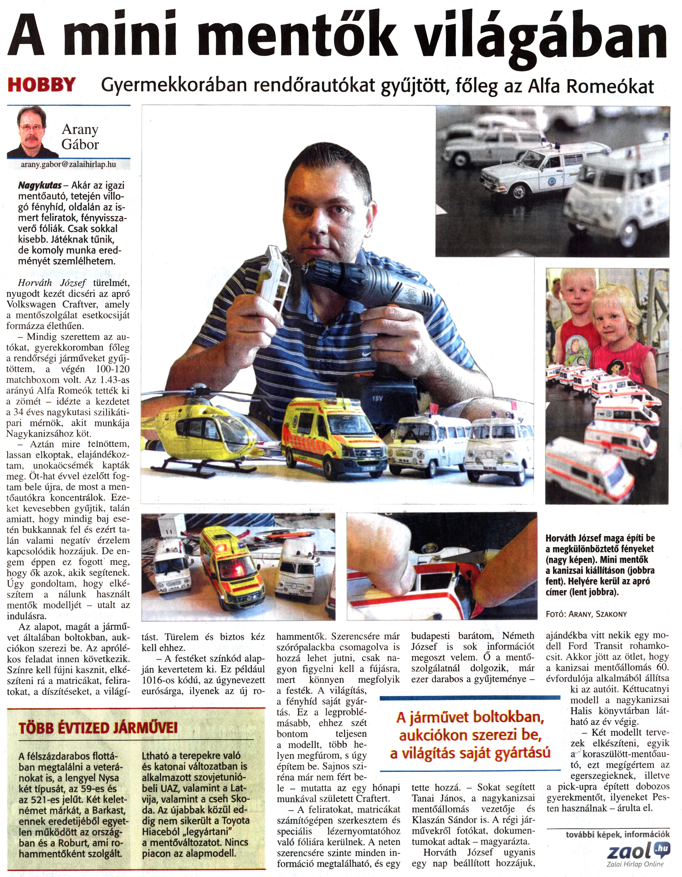 Nyilvános 1794 | 4693 | Zalai Hírlap 2013. július 19. 167. szám 8. oldal - A mini mentők világában | A cikk internetes változata a következő link alatt tekinthető meg: http://zaol.hu/loero/a-mini-mentok-vilagaban-1553058 A mini mentők világában HOBBY Gyermekkorában rendőrautókat gyűjtött, főleg az Alfa Romeókat Nagykutas- Akár az igazi mentőautó, tetején villogó fényhíd, oldalán az ismert feliratok, fényvisszaverő fóliák. Csak sokkal kisebb. Játéknak tűnik, de komoly munka eredményét szemlélhetem. Horváth József türelmét, nyugodt kezét dicséri az apró Volkswagen Craftver, amely a mentőszolgálat esetkocsiját formázza élethűen. - Mindig szerettem az autókat, gyerekkoromban főleg a rendőrségi járműveket gyűjtöttem, a végén 100-120 matchboxom volt. Az 1.43-as arányú Alfa Romeók tették ki a zömét - idézte a kezdetet a 34 éves nagykutasi szilikátipari mérnök, akit munkája Nagykanizsához köt. - Aztán mire felnőttem, lassan elkoptak, elajándékoztam, unokaöcsémék kapták meg. Öt-hat évvel ezelőtt fogtam bele újra, de most a mentőautókra koncentrálok. Ezeket kevesebben gyűjtik, talán amiatt, hogy mindig baj esetén bukkannak fel és ezért talán valami negatív érzelem kapcsolódik hozzájuk. De engem éppen ez fogott meg, hogy ők azok, akik segítenek. Úgy gondoltam, hogy elkészítem a nálunk használt mentők modelljét - utalt az indulásra. Az alapot, magát a járművet általában boltokban, aukciókon szerezi be. Az aprólékos feladat innen következik. Színre kell fújni kasznit, elkészíteni rá a matricákat, feliratokat, a díszítéseket, a világítást. Türelem és biztos kéz kell ehhez. - A festéket színkód alapján kevertetem ki. Ez például 1016-os kódú, az úgynevezett eurósárga, ilyenek az új rohammentők. Szerencsére már szórópalackba csomagolva is hozzá lehet jutni, csak nagyon figyelni kell a fújásra, mert könnyen megfolyik a festék. A világítás, a fényhíd saját gyártás. Ez a legproblémásabb, ehhez szét bontom teljesen a modellt, több helyen megfúrom, s úgy építem be. Sajnos sziréna már nem fért bele - mutatta az egy hónapi munkával született Craftert. - A feliratokat, matricákat számítógépen szerkesztem és speciális lézernyomtatóhoz való fóliára kerülnek. A neten szerencsére szinte minden információ megtalálható, és egy budapesti barátom, Németh József is sok információt megoszt velem. Ő a mentőszolgálatnál dolgozik, már ezer darabos a gyűjteménye - tette hozzá. - Sokat segített Tanai János, a nagykanizsai mentőállomás vezetője és Klaszán Sándor is. A régi járművekről fotókat, dokumentumokat adtak - magyarázta. Horváth József ugyanis egy nap beállított hozzájuk, ajándékba vitt nekik egy modell Ford Transit rohamkocsit. Akkor jött az ötlet, hogy a kanizsai mentőállomás 60. évfordulója alkalmából állítsa ki az autóit. Kéttucatnyi modell a nagykanizsai Halis könyvtárban látható az év végig. - Két modellt tervezek elkészíteni, egyik a koraszülött-mentőautó, ezt megígértem az egerszegieknek, illetve a pickupra épített dobozos gyerekmentőt, ilyeneket Pesten használnak - árulta el. Arany Gábor arany.gabor@zalaihirlap.hu TÖBB ÉVTIZED JÁRMŰVEI A félszázdarabos flottában megtalálni a veteránokat is, a lengyel Nysa két típusát, az 59-es és az 521-es jelűt. Két keletnémet márkát, a Barkast, ennek eredetijéből egyetlen működött az országban és a Roburt, ami rohammentőként szolgált. Látható a terepekre való és katonai változatban is alkalmazott szovjetunióbeli UAZ, valamint a Lat-vija, valamint a cseh Skoda. Az újabbak közül eddig nem sikerült a Toyota Hiaceból „legyártani" a mentőváltozatot. Nincs piacon az alapmodell. Fotó: Arany, Szakony A járművet boltokban, aukciókon szerezi be, a világítás saját gyártású további képek, információk zaol.hu Zalai Hírlap Online Horváth József maga építi be a megkülönböztető fényeket (nagy képen). Mini mentők a kanizsai kiállításon (jobbra fent). Helyére kerül az apró címer (lent jobbra). |