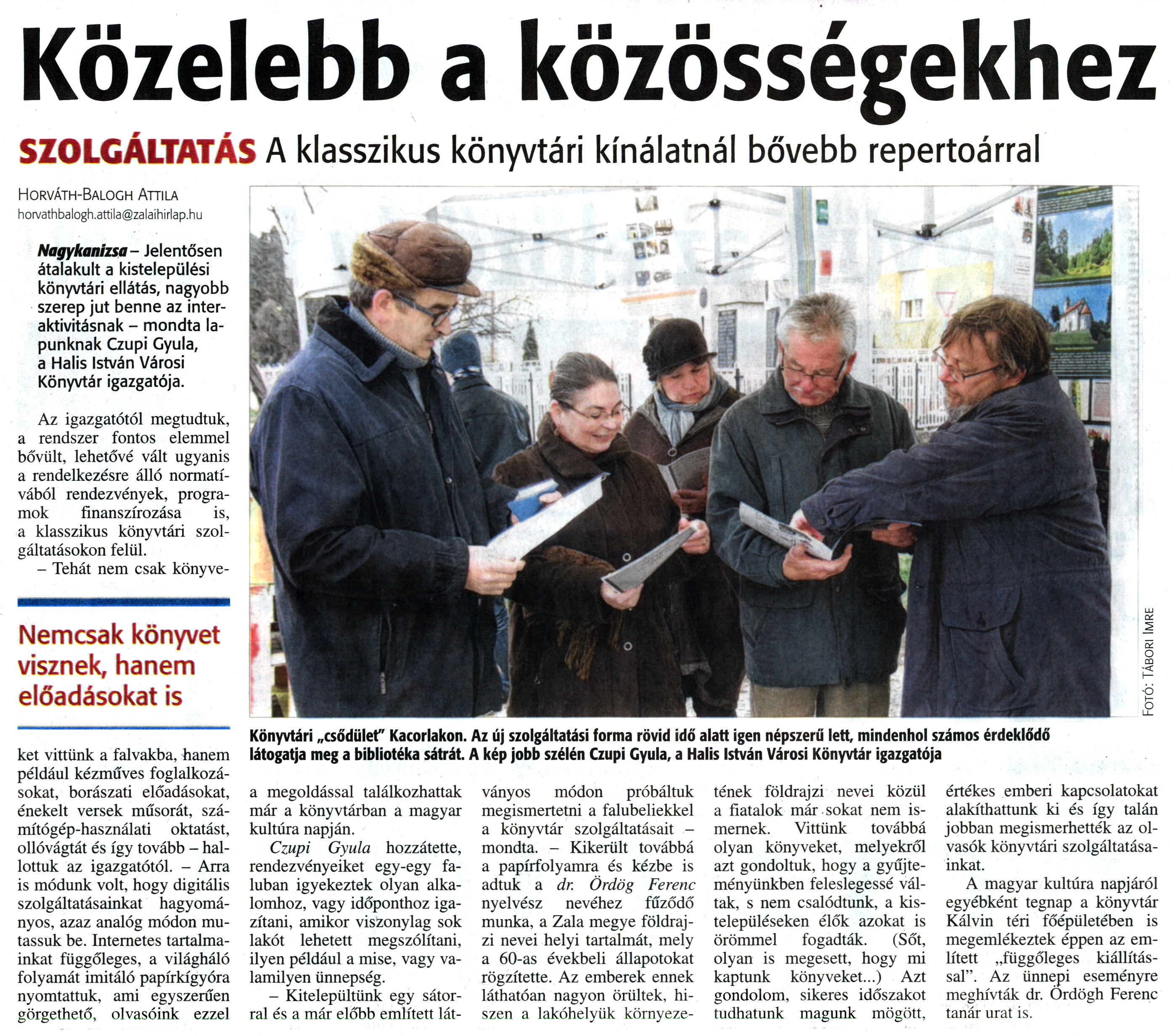 Nyilvános 2211 | 5273 | Zalai Hírlap 2014. január 23. 19. szám 11. oldal - Közelebb a közösségekhez | Közelebb a közösségekhez SZOLGÁLTATÁSA klasszikus könyvtári kínálatnál bővebb repertoárral Nemcsak könyvet visznek, hanem előadásokat is Horváth-Balogh Attila horvathbalogh.attila@zalaihirlap.hu Nagykanizsa - Jelentősen átalakult a kistelepülési könyvtári ellátás, nagyobb szerep jut benne az interaktivitásnak - mondta lapunknak Czupi Gyula, a Halis István Városi Könyvtár igazgatója. Az igazgatótól megtudtuk, a rendszer fontos elemmel bővült, lehetővé vált ugyanis a rendelkezésre álló normatívából rendezvények, programok finanszírozása is, a klasszikus könyvtári szolgáltatásokon felül. - Tehát nem csak könyveket vittünk a falvakba, hanem például kézműves foglalkozásokat, borászati előadásokat, énekelt versek műsorát, számítógép-használati oktatást, ollóvágtát és így tovább - hallottuk az igazgatótól. - Arra is módunk volt, hogy digitális szolgáltatásainkat hagyományos, azaz analóg módon mutassuk be. Internetes tartalmainkat függőleges, a világháló folyamát imitáló papírkígyóra nyomtattuk, ami egyszerűen görgethető, olvasóink ezzel a megoldással találkozhattak már a könyvtárban a magyar kultúra napján. Czupi Gyula hozzátette, rendezvényeiket egy-egy faluban igyekeztek olyan alkalomhoz, vagy időponthoz igazítani, amikor viszonylag sok lakót lehetett megszólítani, ilyen például a mise, vagy valamilyen ünnepség. - Kitelepültünk egy sátorral és a már előbb említett lát- ványos módon próbáltuk megismertetni a falubeliekkel a könyvtár szolgáltatásait -mondta. - Kikerült továbbá a papírfolyamra és kézbe is adtuk a dr. Ördög Ferenc nyelvész nevéhez fűződő munka, a Zala megye földrajzi nevei helyi tartalmát, mely a 60-as évekbeli állapotokat rögzítette. Az emberek ennek láthatóan nagyon örültek, hiszen a lakóhelyük környezetének földrajzi nevei közül a fiatalok már sokat nem ismernek. Vittünk továbbá olyan könyveket, melyekről azt gondoltuk, hogy a gyűjteményünkben feleslegessé váltak, s nem csalódtunk, a kistelepüléseken élők azokat is örömmel fogadták. (Sőt, olyan is megesett, hogy mi kaptunk könyveket...) Azt gondolom, sikeres időszakot tudhatunk magunk mögött. értékes emberi kapcsolatokat alakíthattunk ki és így talán jobban megismerhették az olvasók könyvtári szolgáltatásainkat. A magyar kultúra napjáról egyébként tegnap a könyvtár Kálvin téri főépületében is megemlékeztek éppen az említett „függőleges kiállítással". Az ünnepi eseményre meghívták dr. Ördög Ferenc tanár urat is. Könyvtári „csődület" Kacorlakon. Az új szolgáltatási forma rövid idő alatt igen népszerű lett, mindenhol számos érdeklődő látogatja meg a bibliotéka sátrát. A kép jobb szélén Czupi Gyula, a Halis István Városi Könyvtár igazgatója Fotó: Tábori Imre |