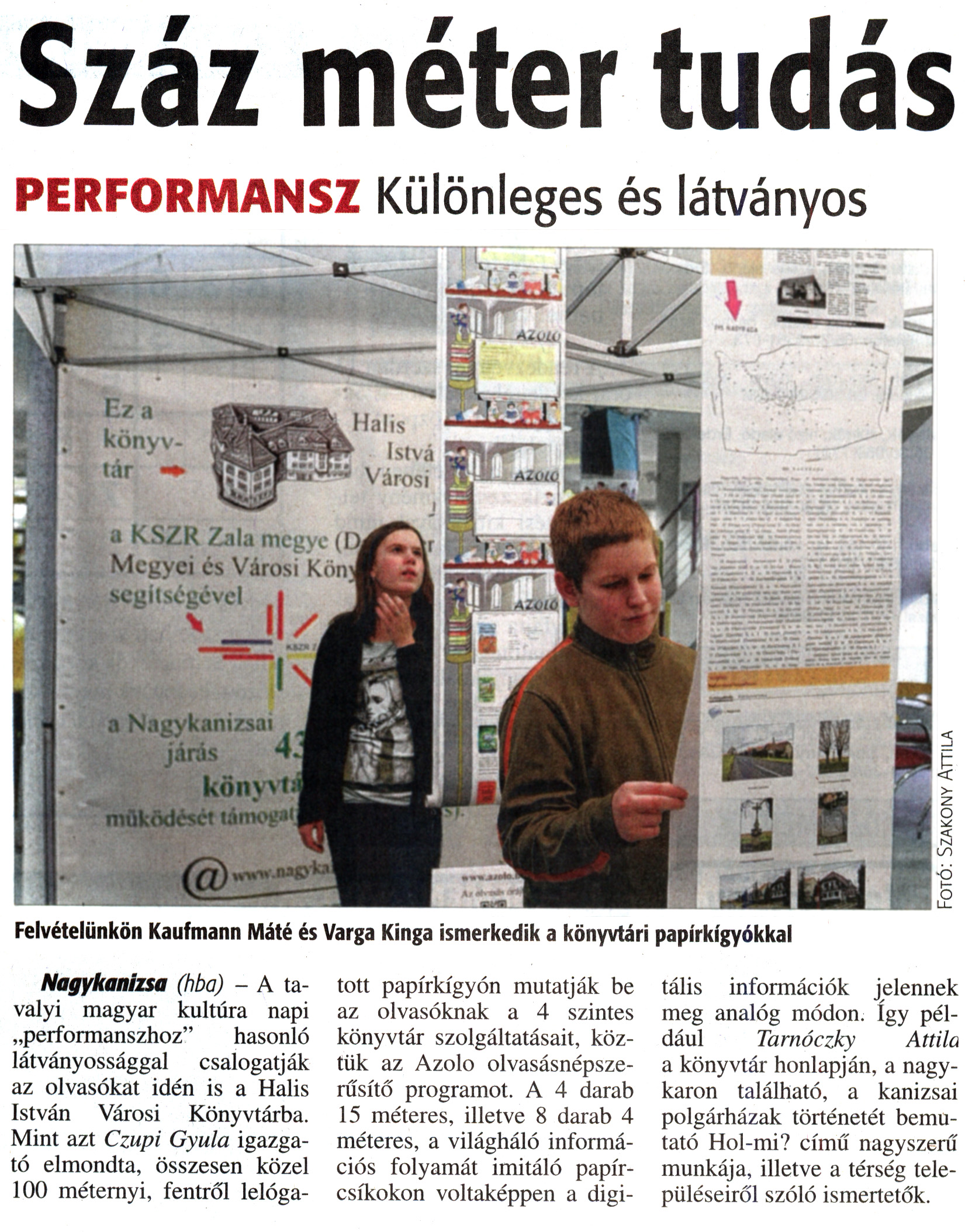 Nyilvános 1935 | 3803 | Zalai Hírlap 2014. január 24. 20. szám 20. oldal - Száz méter tudás | Száz méter tudás PERFORMANSZ Különleges és látványos Felvételünkön Kaufmann Máté és Varga Kinga ismerkedik a könyvtári papírkígyókkal Fotó: Szakony Attila Nagykanizsa (hba) - A tavalyi magyar kultúra napi „performanszhoz" hasonló látványossággal csalogatják az olvasókat idén is a Halis István Városi Könyvtárba. Mint azt Czupi Gyula igazgató elmondta, összesen közel 100 méternyi, fentről lelógatott papírkígyón mutatják be az olvasóknak a 4 szintes könyvtár szolgáltatásait, köztük az Azolo olvasásnépszerűsítő programot. A 4 darab 15 méteres, illetve 8 darab 4 méteres, a világháló információs folyamát imitáló papírcsíkokon voltaképpen a digitális információk jelennek meg analóg módon. Így például Tarnóczky Attila a könyvtár honlapján, a nagykaron található, a kanizsai polgárházak történetét bemutató Hol-mi? című nagyszerű munkája, illetve a térség településeiről szóló ismertetők. |
