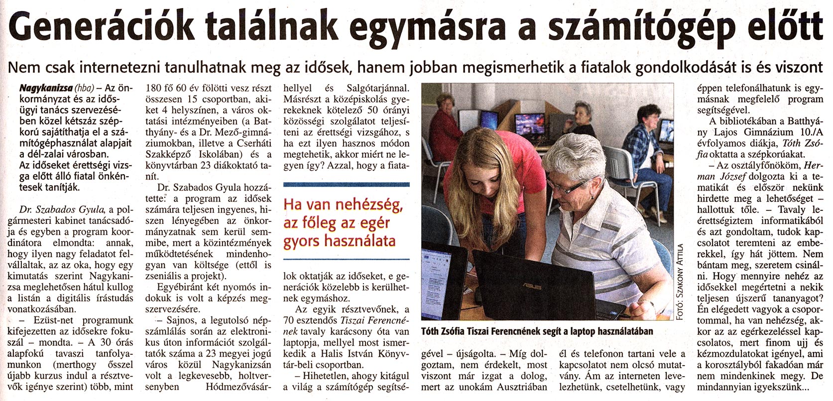 Nyilvános 1986 | 3738 | Zalai Hírlap 2014 04 16 089sz 05old - Generációk találnak egymásra a számítógép előtt | A cikk szövege: Generációk találnak egymásra a számítógép eló'tt Nem csak internetezni tanulhatnak meg az idősek, hanem jobban megismerhetik a fiatalok gondolkodását is és viszont Nagykanizsa (hba) - Az önkormányzat és az idősügyi tanács szervezésében közel kétszáz szépkorú sajátíthatja el a számítógéphasználat alapjait a dél-zalai városban. Az időseket érettségi vizsga előtt álló fiatal önkéntesek tanítják. Dr. Szabados Gyula, a polgármesteri kabinet tanácsadója és egyben a program koordinátora elmondta; annak, hogy ilyen nagy feladatot felvállaltak, az az oka, hogy egy kimutatás szerint Nagykanizsa meglehetősen hátul kuilog a listán a digitális írástudás vonatkozásában. - Eziist-nei programunk kifejezetten az idősekre fókuszál - mondta. - A 30 órás alapfokú tavaszi tanfolyamunkon (merthogy ősszel újabb kurzus indul a résztvevők igénye szerint) több, mint 180 fő 60 év fölötti vesz részt összesen 15 csoportban, akiket 4 helyszínen, a város oktatási intézményeiben (a Batthyány- és a Dr. Mező-gimnáziumokban, illetve a Cserháti Szakképző Iskolában) és a könyvtárban 23 diákoktató ta- Dr. Szabados Gyula hozzátette:' a program az idősek számára teljesen ingyenes, hiszen lényegében az Önkormányzatnak sem kerül semmibe, mert a közintézmények működtetésének mindenhogyan van költsége (ettől is zseniális a projekt). Egyébiránt két nyomós indokuk is volt a képzés megszervezésére. - Sajnos, a legutolsó népszámlálás során az elektronikus úton információt szolgáltatók száma a 23 megyei jogú város közül Nagykanizsán volt a legkevesebb, holtversenyben Hódmezővásár- hellyel és Salgótarjánnal. Másrészt a középiskolás gyerekeknek kötelező 50 órányi közösségi szolgálatot teljesíteni az érettségi vizsgához, s ha ezt ilyen hasznos módon megtehetik, akkor miért ne legyen így? Azzal, hogy a fiata- Ha van nehézség, az főleg az egér gyors használata lok oktatják az időseket, e generációk közelebb is kerülhetnek egymáshoz. Az egyik résztvevőnek, a 70 esztendős Tiszai Ferencné-nek tavaly karácsony óta van laptopja, mellyel most ismerkedik a Haiis István Könyv-tár-beli csoportban. - Hihetetlen, ahogy kitágul a világ a számítógép segítse- Tóth Zsófia Tiszai Ferencnének segít a laptop használatában gével - újságolta. - Míg dolgoztam, nem érdekelt, most viszont már izgat a dolog, mert az unokám Ausztriában él és telefonon tartani vele a kapcsolatot nem olcsó mutatvány. Ám az interneten levelezhetünk, csetelhetünk, vagy éppen telefonálhatunk is egymásnak megfelelő program segítségével. A bibliotékában a Batthyány Lajos Gimnázium 10./A évfolyamos diákja, Tóth Zsó-fia oktatta a szépicorúakat. - Az osztályfőnököm, Hermán József dolgozta ki a tematikát és először nekünk hirdette meg a lehetőséget -hallottuk tőle. - Tavaly leérettségiztem informatikából és azt gondoltam, tudok kapcsolatot teremteni az emberekkel, így hát jöttem. Nem bántam meg, szeretem csinálni. Hogy mennyire nehéz az idősekkel megértetni a nekik teljesen újszerű tananyagot? Én elégedett vagyok a csoportommal, ha van nehézség, akkor az az egérkezeléssel kapcsolatos, mert finom ujj és kézmozdulatokat igényel, ami a korosztályból fakadóan már nem mindenkinek megy. De mindannyian igyekszünk... |