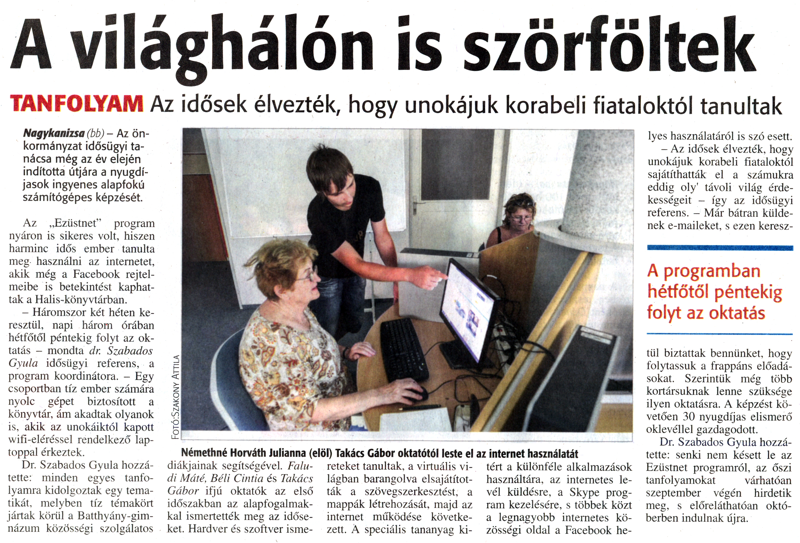 Nyilvános 1953 | 3644 | Zalai Hírlap 2014. szeptember 4. 206. szám 4. oldal | A világhálón is szörföltek TANFOLYAM Az idősek élvezték, hogy unokájuk korabeli fiataloktól tanultak Nagykanizsa (bb) - Az önkormányzat idősügyi tanácsa még az év elején indította útjára a nyugdíjasok ingyenes alapfokú számítógépes képzését. Az „Ezüstnet" program nyáron is sikeres volt, hiszen harminc idős ember tanulta meg használni az internetet, akik még a Facebook rejtelmeibe is betekintést kaphattak a Halis-könyvtárban. - Háromszor két héten keresztül, napi három órában hétfőtől péntekig folyt az oktatás - mondta dr. Szabados Gyula idősügyi referens, a program koordinátora. - Egy csoportban tíz ember számára nyolc gépet biztosított a könyvtár, ám akadtak olyanok is, akik az unokáiktól kapott wifi-eléréssel rendelkező laptoppal érkeztek. Dr. Szabados Gyula hozzátette: minden egyes tanfolyamra kidolgoztak egy tematikát, melyben tíz témakört jártak körül a Batthyány-gimnázum közösségi szolgálatos diákjainak segítségével. Faludi Máté, Béli Cintia és Takács Gábor ifjú oktatók az első időszakban az alapfogalmakkal ismertették meg az időseket. Hardver és szoftver ismereteket tanultak, a virtuális világban barangolva elsajátították a szövegszerkesztést, a mappák létrehozását, majd az internet működése következett. A speciális tananyag kitért a különféle alkalmazások használatára, az internetes levél küldésre, a Skype program kezelésére, s többek közt a legnagyobb internetes közösségi oldal a Facebook helyes használatáról is szó esett. - Az idősek élvezték, hogy unokájuk korabeli fiataloktól sajátíthatták el a számukra eddig oly\' távoli világ érdekességeit - így az idősügyi referens. - Már bátran küldenek e-maileket, s ezen keresztül biztattak bennünket, hogy folytassuk a frappáns előadásokat. Szerintük még több kortársuknak lenne szüksége ilyen oktatásra. A képzést követően 30 nyugdíjas elismerő oklevéllel gazdagodott. Dr. Szabados Gyula hozzátette: senki nem késett le az Ezüstnet programról, az őszi tanfolyamokat várhatóan szeptember végén hirdetik meg, s előreláthatóan októberben indulnak újra. Némethné Horváth Julianna (elöl) Takács Gábor oktatótól leste el az internet használatát A programban hétfőtől péntekig folyt az oktatás |