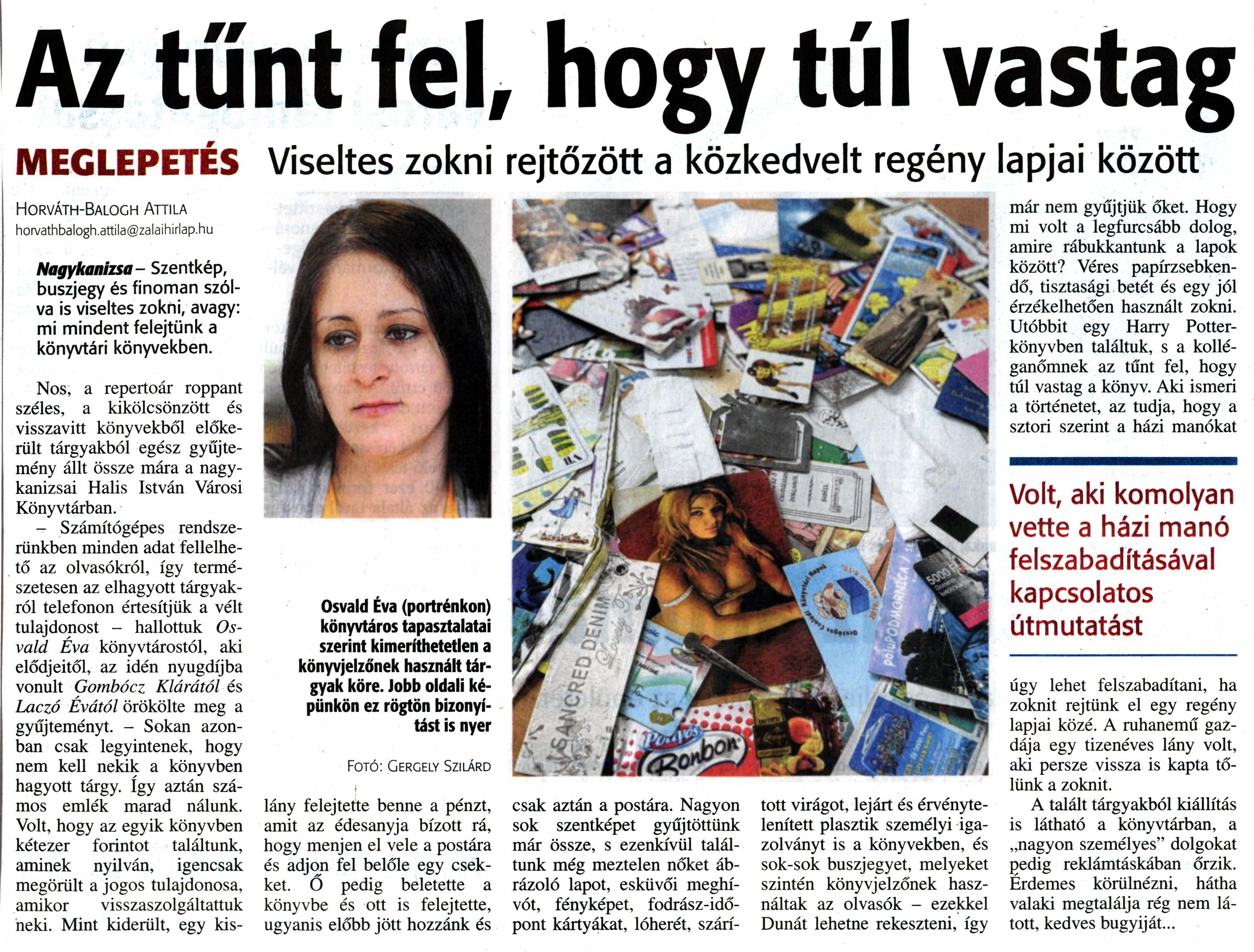 Nyilvános 1592 | 3391 | Zalai Hírlap 2015. május 6. 105. szám 3. oldal | Az tűnt fel, hogy túl vastag MEGLEPETÉS Viseltes zokni rejtőzött a közkedvelt regény lapjai között Horváth-Balogh Attila horvathbalogh.attila@zalaihirlap.hu Nagykanizsa- Szentkép, buszjegy és finoman szólva is viseltes zokni, avagy: mi mindent felejtünk a könyvtári könyvekben. Nos, a repertoár roppant széles, a kikölcsönzött és visszavitt könyvekből előkerült tárgyakból egész gyűjtemény állt össze mára a nagykanizsai Halis István Városi Könyvtárban. - Számítógépes rendszerünkben minden adat fellelhető az olvasókról, így természetesen az elhagyott tárgyakról telefonon értesítjük a vélt tulajdonost - hallottuk Os-vald Éva könyvtárostól, aki elődjeitől, az idén nyugdíjba vonult Gombócz Klárától és Laczó Évától örökölte meg a gyűjteményt. - Sokan azonban csak legyintenek, hogy nem kell nekik a könyvben hagyott tárgy. így aztán számos emlék marad nálunk. Volt, hogy az egyik könyvben kétezer forintot találtunk, aminek nyilván, igencsak megörült a jogos tulajdonosa, amikor visszaszolgáltattuk neki. Mint kiderült, egy kis- lány felejtette benne a pénzt, amit az édesanyja bízott rá, hogy menjen el vele a postára és adjon fel belőle egy csekket. O pedig beletette a könyvbe és ott is felejtette, ugyanis előbb jött hozzánk és csak aztán a postára. Nagyon sok szentképet gyűjtöttünk már össze, s ezenkívül találtunk még meztelen nőket ábrázoló lapot, esküvői meghívót, fényképet, fodrász-idő-pont kártyákat, lóherét, szárí- tott virágot, lejárt és érvénytelenített plasztik személyi igazolványt is a könyvekben, és sok-sok buszjegyet, melyeket szintén könyvjelzőnek használtak az olvasók - ezekkel Dunát lehetne rekeszteni, így már nem gyűjtjük őket. Hogy mi volt a legfurcsább dolog, amire rábukkantunk a lapok között? Véres papírzsebkendő, tisztasági betét és egy jól érzékelhetően használt zokni. Utóbbit egy Harry Potter-könyvben találtuk, s a kolléganőmnek az tűnt fel, hogy túl vastag a könyv. Aki ismeri a történetet, az tudja, hogy a sztori szerint a házi manókat Volt, aki komolyan vette a házi manó felszabadításával kapcsolatos útmutatást úgy lehet felszabadítani, ha zoknit rejtünk el egy regény lapjai közé. A ruhanemű gazdája egy tizenéves lány volt, aki persze vissza is kapta tőlünk a zoknit. A talált tárgyakból kiállítás is látható a könyvtárban, a „nagyon személyes" dolgokat pedig reklámtáskában őrzik. Érdemes körülnézni, hátha valaki megtalálja rég nem látott, kedves bugyiját... |