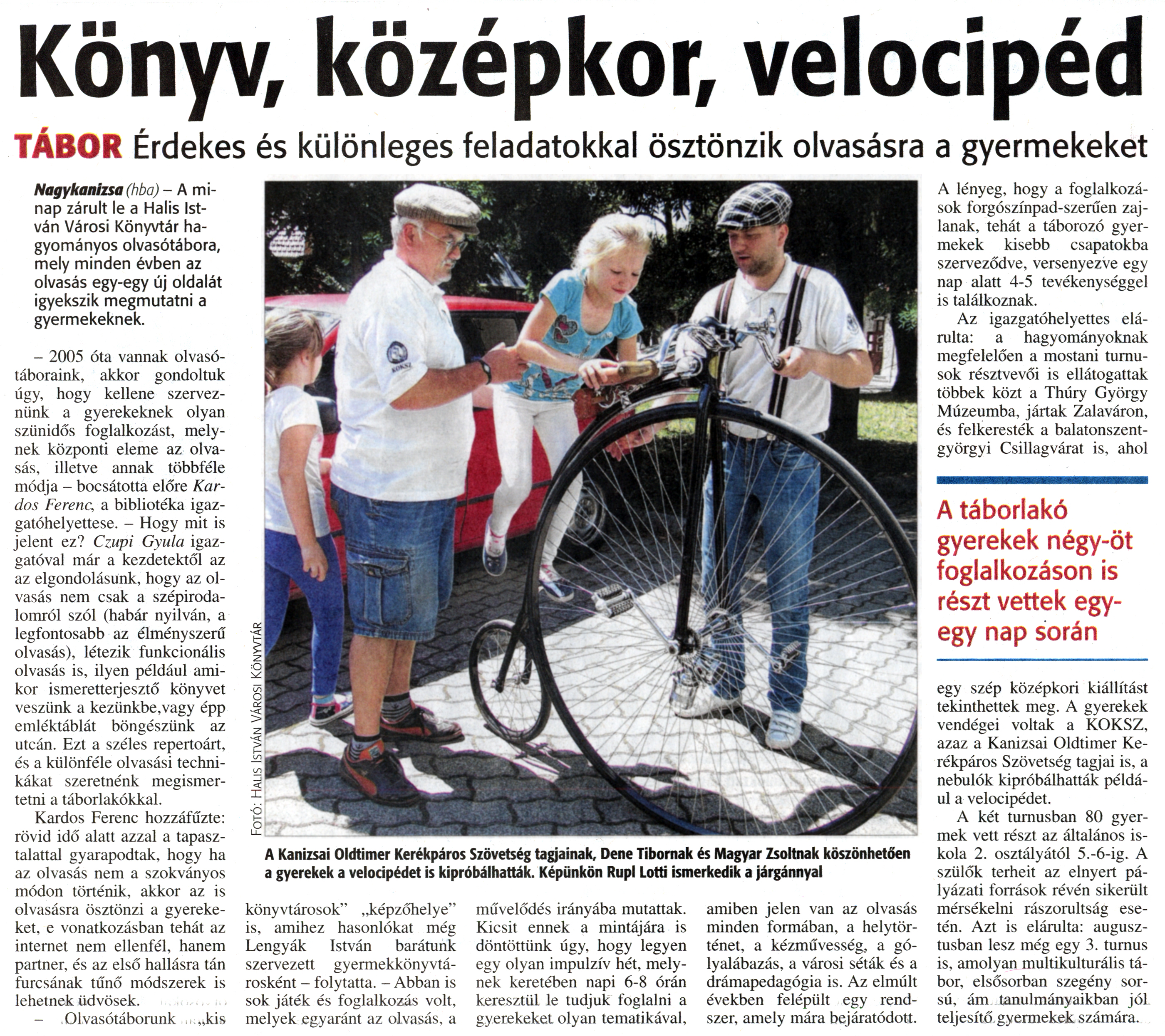 Nyilvános 1577 | 3597 | Zalai Hírlap 2015. július 2. 153. szám 4. oldal | Könyv, középkor, velocipéd TÁBOR Érdekes és különleges feladatokkal ösztönzik olvasásra a gyermekeket A Kanizsai Oldtimer Kerékpáros Szövetség tagjainak, Dene Tibornak és Magyar Zsoltnak köszönhetően a gyerekek a velocipédet is kipróbálhatták. Képünkön Rupl Lotti ismerkedik a járgánnyal Nagykanizsa (hba) - A minap zárult le a Halis István Városi Könyvtár hagyományos olvasótábora, mely minden évben az olvasás egy-egy új oldalát igyekszik megmutatni a gyermekeknek. - 2005 óta vannak olvasótáboraink, akkor gondoltuk úgy, hogy kellene szerveznünk a gyerekeknek olyan szünidős foglalkozást, melynek központi eleme az olvasás, illetve annak többféle módja - bocsátotta előre Kardos Ferenc, a bibliotéka igazgatóhelyettese. - Hogy mit is jelent ez? Czupi Gyula igazgatóval már a kezdetektől az az elgondolásunk, hogy az olvasás nem csak a szépirodalomról szól (habár nyilván, a legfontosabb az élményszerű olvasás), létezik funkcionális olvasás is, ilyen például amikor ismeretteijesztő könyvet veszünk a kezünkbe,vagy épp emléktáblát böngészünk az utcán. Ezt a széles repertoárt, és a különféle olvasási technikákat szeretnénk megismertetni a táborlakókkal. Kardos Ferenc hozzáfűzte: rövid idő alatt azzal a tapasztalattal gyarapodtak, hogy ha az olvasás nem a szokványos módon történik, akkor az is olvasásra ösztönzi a gyerekeket, e vonatkozásban tehát az internet nem ellenfél, hanem partner, és az első hallásra tán furcsának tűnő módszerek is lehetnek üdvösek. - Olvasótáborunk „kis könyvtárosok" „képzőhelye" is, amihez hasonlókat még Lengyák István barátunk szervezett gyermekkönyvtárosként - folytatta. - Abban is sok játék és foglalkozás volt, melyek egyaránt az olvasás, a művelődés irányába mutattak. Kicsit ennek a mintájára is döntöttünk úgy, hogy legyen egy olyan impulzív hét, melynek keretében napi 6-8 órán keresztül le tudjuk foglalni a gyerekeket olyan tematikával, amiben jelen van az olvasás minden formában, a helytörténet, a kézművesség, a gólyalábazás, a városi séták és a drámapedagógia is. Az elmúlt években felépült egy rendszer, amely mára bejáratódott. A lényeg, hogy a foglalkozások forgószínpad-szerűen zajlanak, tehát a táborozó gyermekek kisebb csapatokba szerveződve, versenyezve egy nap alatt 4-5 tevékenységgel is találkoznak. Az igazgatóhelyettes elárulta: a hagyományoknak megfelelően a mostani turnusok résztvevői is ellátogattak többek közt a Thúry György Múzeumba, jártak Zalaváron, és felkeresték a balatonszentgyörgyi Csillagvárat is, ahol egy szép középkori kiállítást tekinthettek meg. A gyerekek vendégei voltak a KOKSZ, azaz a Kanizsai Oldtimer Kerékpáros Szövetség tagjai is, a nebulók kipróbálhatták például a velocipédet. A két turnusban 80 gyermek vett részt az általános iskola 2. osztályától 5.-6-ig. A szülők terheit az elnyert pályázati források révén sikerült mérsékelni rászorultság esetén. Azt is elárulta: augusztusban lesz még egy 3. turnus is, amolyan multikulturális tábor, elsősorban szegény sorsú, ám tanulmányaikban jól teljesítő gyermekek számára. A táborlakó gyerekek négy-öt foglalkozáson is részt vettek egy-egy nap során |