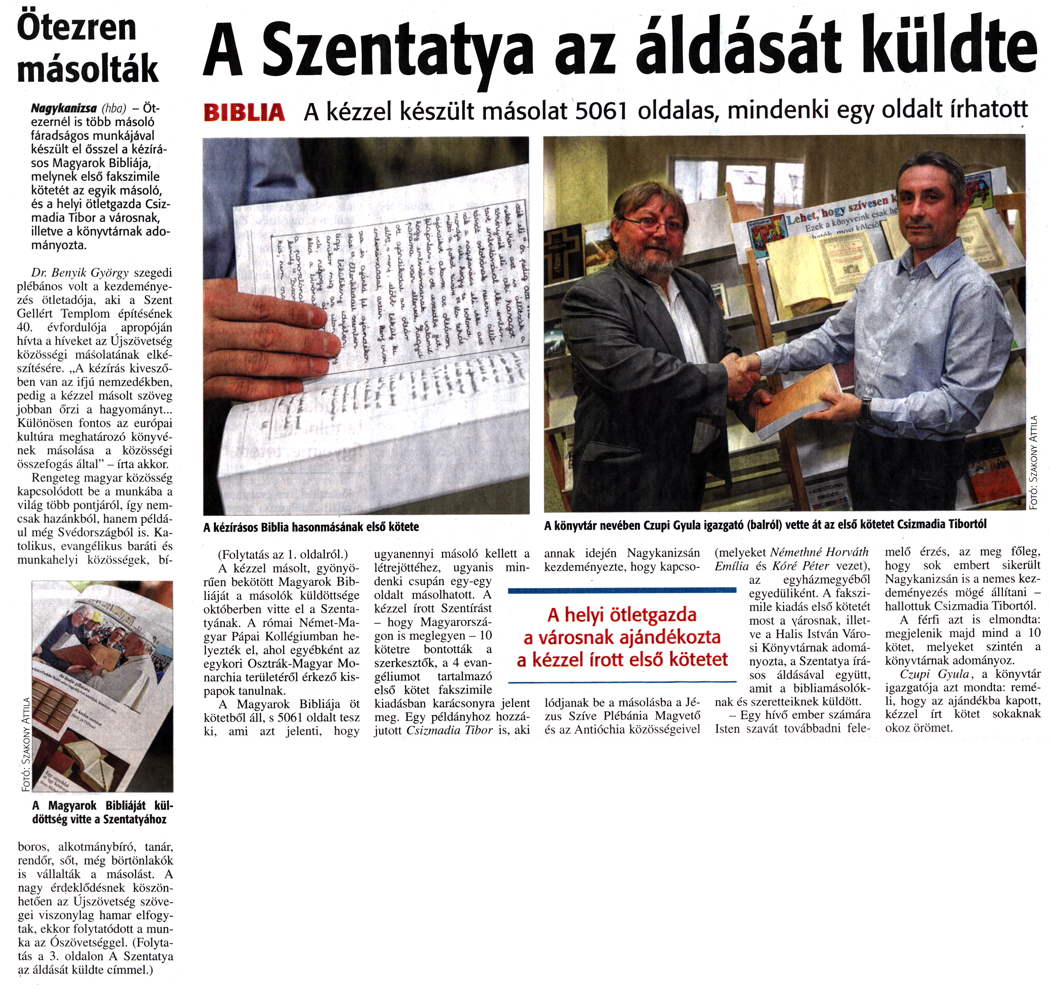 Nyilvános 1766 | 3612 | Zalai Hírlap 2016. január 6. 4. szám 1, 3. oldal - Ötezren másolták - A Szentatya az áldását küldte | Ötezren másolták Nagykanizsa (hba) - Ötezernél is több másoló fáradságos munkájával készült el ősszel a kézírásos Magyarok Bibliája, melynek első fakszimile kötetét az egyik másoló, és a helyi ötletgazda Csizmadia Tibor a városnak, illetve a könyvtárnak adományozta. Dr. Benyik György szegedi plébános volt a kezdeményezés ötletadója, aki a Szent Gellért Templom építésének 40. évfordulója apropóján hívta a híveket az Újszövetség közösségi másolatának elkészítésére. „A kézírás kiveszőben van az ifjú nemzedékben, pedig a kézzel másolt szöveg jobban őrzi a hagyományt... Különösen fontos az európai kultúra meghatározó könyvének másolása a közösségi összefogás által" - írta akkor. Rengeteg magyar közösség kapcsolódott be a munkába a világ több pontjáról, így nemcsak hazánkból, hanem például még Svédországból is. Katolikus, evangélikus baráti és munkahelyi közösségek, bíboros, alkotmánybíró, tanár, rendőr, sőt, még börtönlakók is vállalták a másolást. A nagy érdeklődésnek köszönhetően az Újszövetség szövegei viszonylag hamar elfogytak, ekkor folytatódott a munka az Ószövetséggel. (Folytatás a 3. oldalon A Szentatya az áldását küldte címmel.) A Szentatya az áldását küldte BIBLIA A kézzel készült másolat 5061 oldalas, mindenki egy oldalt írhatott A kézírásos Biblia hasonmásának első kötete A könyvtár nevében Czupi Gyula igazgató (balról) vette át az első kötetet Csizmadia Tibortól (Folytatás az 1. oldalról.) A kézzel másolt, gyönyörűen bekötött Magyarok Bibliáját a másolók küldöttsége októberben vitte el a Szentatyának. A római Német-Magyar Pápai Kollégiumban helyezték el, ahol egyébként az egykori Osztrák-Magyar Monarchia területéről érkező kispapok tanulnak. A Magyarok Bibliája öt kötetből áll, s 5061 oldalt tesz ki, ami azt jelenti, hogy ugyanennyi másoló kellett a létrejöttéhez, ugyanis mindenki csupán egy-egy oldalt másolhatott. A kézzel írott Szentírást - hogy Magyarországon is meglegyen - 10 kötetre bontották a szerkesztők, a 4 evangéliumot tartalmazó első kötet fakszimile kiadásban karácsonyra jelent meg. Egy példányhoz hozzájutott Csizmadia Tibor is, aki annak idején Nagykanizsán kezdeményezte, hogy kapcsolódjanak be a másolásba a Jézus Szíve Plébánia Magvető és az Antióchia közösségeivel (melyeket Némethné Horváth Emília és Kóré Péter vezet), az egyházmegyéből egyedüliként. A fakszimile kiadás első kötetét most a városnak, illetve a Halis István Városi Könyvtárnak adományozta, a Szentatya írásos áldásával együtt, amit a bibliamásolóknak és szeretteiknek küldött. - Egy hívő ember számára Isten szavát továbbadni felemelő érzés, az meg főleg, hogy sok embert sikerült Nagykanizsán is a nemes kezdeményezés mögé állítani - hallottuk Csizmadia Tibortól. A férfi azt is elmondta: megjelenik majd mind a 10 kötet, melyeket szintén a könyvtárnak adományoz. Czupi Gyula, a könyvtár igazgatója azt mondta: reméli, hogy az ajándékba kapott, kézzel írt kötet sokaknak okoz örömet. |
