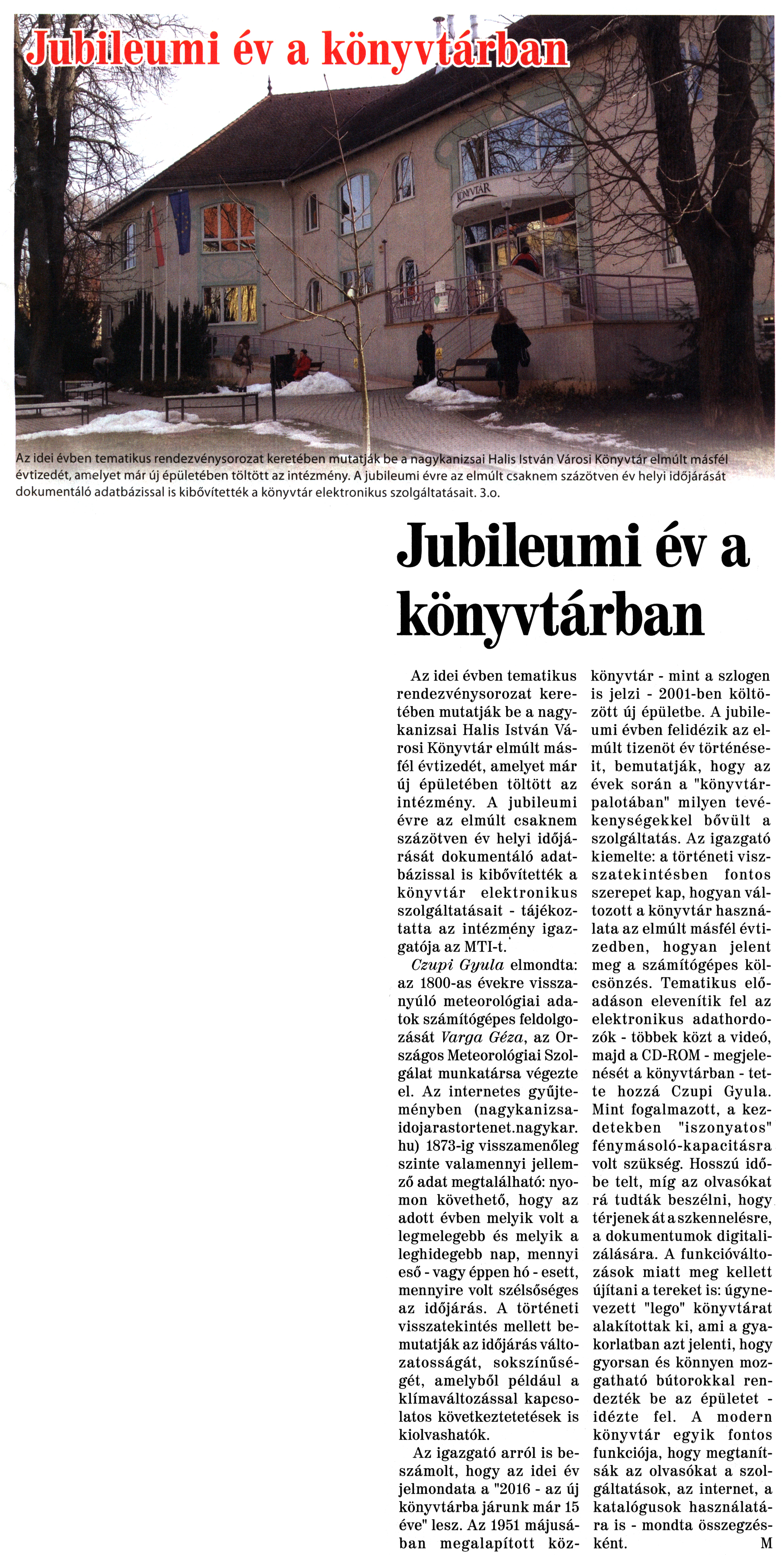 Nyilvános 1881 | 3775 | Nagykanizsai Maraton 2016. január 15. 2. szám 1, 3. oldal | Jubileumi év a könyvtárban Az idei évben tematikus rendezvénysorozat keretében mutatják be a nagykanizsai Halis István Városi Könyvtár elmúlt másfél évtizedét, amelyet már új épületében töltött az intézmény. A jubileumi évre az elmúlt csaknem százötven év helyi időjárását dokumentáló adatbázissal is kibővítették a könyvtár elektronikus szolgáltatásait. 3.o. Jubileumi év a könyvtárban Az idei évben tematikus rendezvénysorozat keretében mutatják be a nagykanizsai Halis István Városi Könyvtár elmúlt másfél évtizedét, amelyet már új épületében töltött az intézmény. A jubileumi évre az elmúlt csaknem százötven év helyi időjárását dokumentáló adatbázissal is kibővítették a könyvtár elektronikus szolgáltatásait - tájékoztatta az intézmény igazgatója az MTI-t. Czupi Gyula elmondta: az 1800-as évekre visszanyúló meteorológiai adatok számítógépes feldolgozását Varga Géza, az Országos Meteorológiai Szolgálat munkatársa végezte el. Az internetes gyűjteményben (nagykanizsaidojarastortenet.nagykar.hu) 1873-ig visszamenőleg szinte valamennyi jellemző adat megtalálható: nyomon követhető, hogy az adott évben melyik volt a legmelegebb és melyik a leghidegebb nap, mennyi eső - vagy éppen hó - esett, mennyire volt szélsőséges az időjárás. A történeti visszatekintés mellett bemutatják az időjárás változatosságát, sokszínűségét, amelyből például a klímaváltozással kapcsolatos következtetetések is kiolvashatók. Az igazgató arról is beszámolt, hogy az idei év jelmondata a "2016 - az új könyvtárba járunk már 15 éve" lesz. Az 1951 májusában megalapított közkönyvtár - mint a szlogen is jelzi - 2001-ben költözött új épületbe. A jubileumi évben felidézik az elmúlt tizenöt év történéseit, bemutatják, hogy az évek során a "könyvtárpalotában" milyen tevékenységekkel bővült a szolgáltatás. Az igazgató kiemelte: a történeti visszatekintésben fontos szerepet kap, hogyan változott a könyvtár használata az elmúlt másfél évtizedben, hogyan jelent meg a számítógépes kölcsönzés. Tematikus előadáson elevenítik fel az elektronikus adathordozók - többek közt a videó, majd a CD-ROM - megjelenését a könyvtárban - tette hozzá Czupi Gyula. Mint fogalmazott, a kezdetekben "iszonyatos" fénymásoló-kapacitásra volt szükség. Hosszú időbe telt, míg az olvasókat rá tudták beszélni, hogy térjenek át a szkennelésre, a dokumentumok digitalizálására. A funkcióváltozások miatt meg kellett újítani a tereket is: úgynevezett "lego" könyvtárat alakítottak ki, ami a gyakorlatban azt jelenti, hogy gyorsan és könnyen mozgatható bútorokkal rendezték be az épületet -idézte fel. A modern könyvtár egyik fontos funkciója, hogy megtanítsák az olvasókat a szolgáltatások, az internet, a katalógusok használatára is - mondta összegzésként. M |