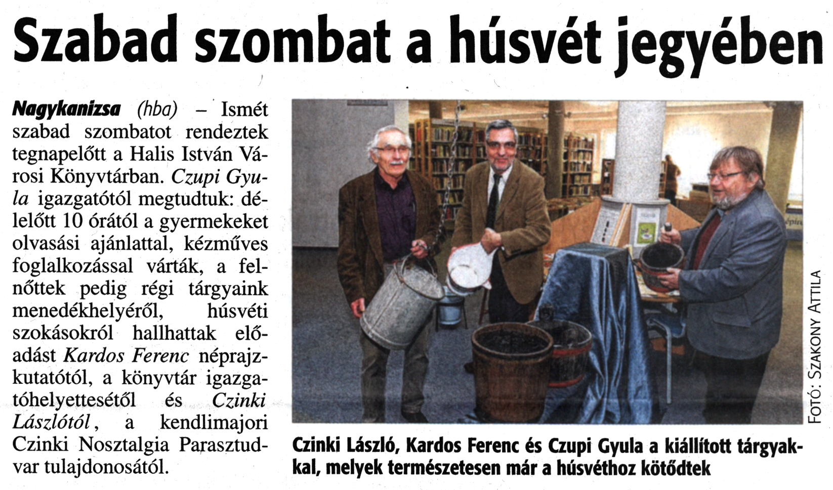 Nyilvános 1769 | 3544 | Zalai Hírlap 2016. március 21. 67. szám 4. oldal | Szabad szombat a húsvét jegyében Nagykanizsa (hba) - Ismét szabad szombatot rendeztek tegnapelőtt a Halis István Városi Könyvtárban. Czupi Gyula igazgatótól megtudtuk: délelőtt 10 órától a gyermekeket olvasási ajánlattal, kézműves foglalkozással várták, a felnőttek pedig régi tárgyaink menedékhelyéről, húsvéti szokásokról hallhattak előadást Kardos Ferenc néprajzkutatótól, a könyvtár igazgatóhelyettesétől és Czinki Lászlótól, a kendlimajori Czinki Nosztalgia Parasztudvar tulajdonosától. Czinki László, Kardos Ferenc és Czupi Gyula a kiállított tárgyakkal, melyek természetesen már a húsvéthoz kötődtek |