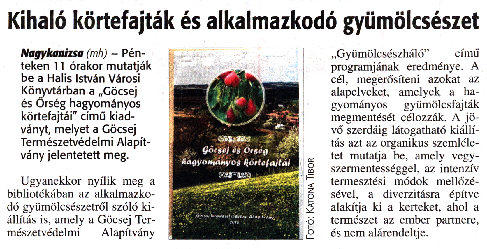 Nyilvános 1799 | 3444 | Zalai Hírlap 2016. június 22. 145. szám 7. oldal | Kihaló körtefajták és alkalmazkodó gyümölcsészet Nagykanizsa (mh) - Pénteken 11 órakor mutatják be a Halis István Városi Könyvtárban a „Göcsej és Őrség hagyományos körtefajtái" című kiadványt, melyet a Göcsej Természetvédelmi Alapítvány jelentetett meg. Ugyanekkor nyílik meg a bibliotékában az alkalmazkodó gyümölcsészetről szóló kiállítás is, amely a Göcsej Természetvédelmi Alapítvány „Gyümölcsészháló" című programjának eredménye. A cél, megerősíteni azokat az alapelveket, amelyek a hagyományos gyümölcsfajták megmentését célozzák. A jövő szerdáig látogatható kiállítás azt az organikus szemléletet mutatja be, amely vegyszermentességgel, az intenzív termesztési módok mellőzésével, a diverzitásra építve alakítja ki a kerteket, ahol a természet az ember partnere, és nem alárendeltje. |