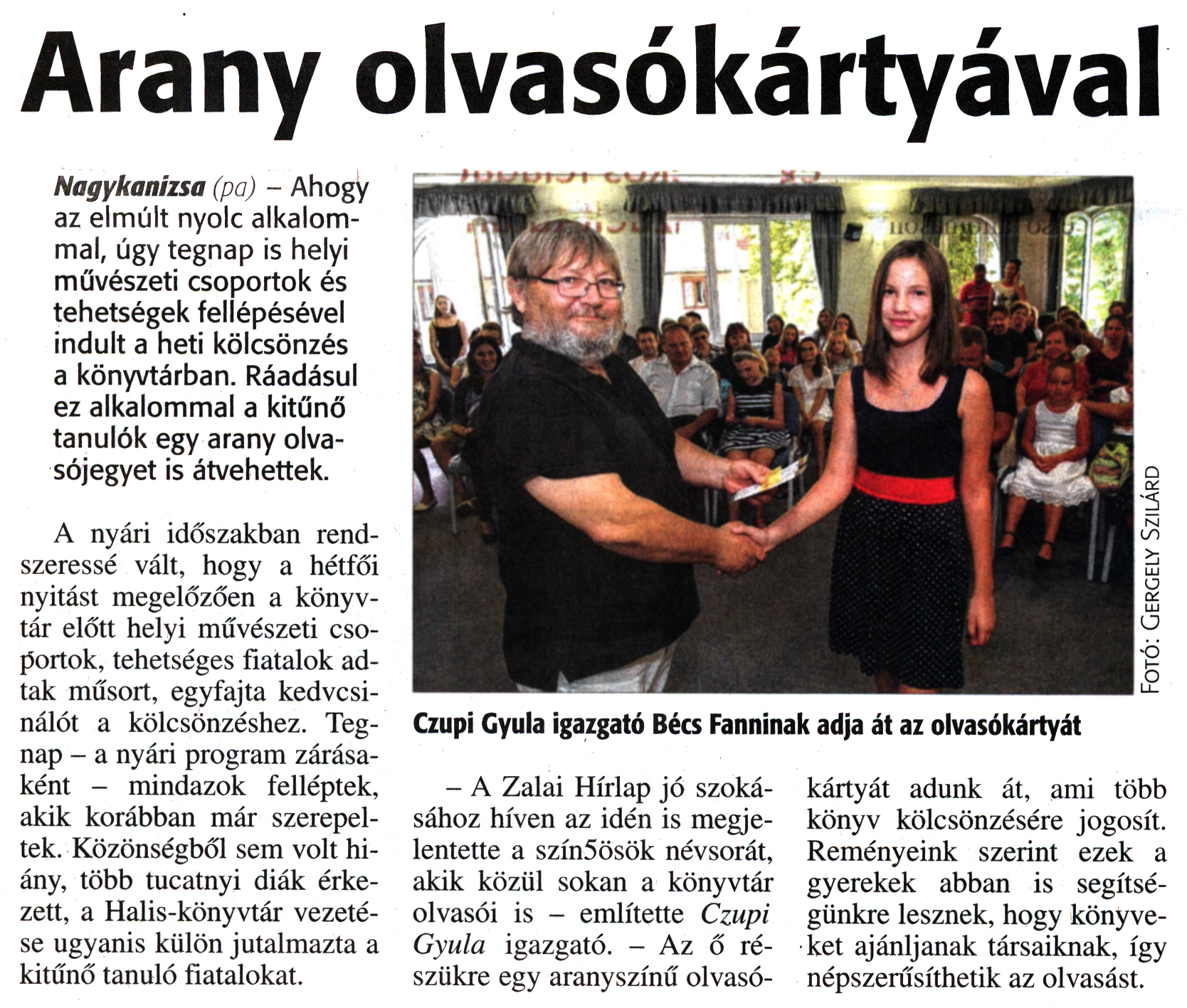 Nyilvános 1635 | 2902 | Zalai Hírlap 2016. augusztus 30. 203. szám 3. oldal | Arany olvasókártyával Nagykanizsa (pa) - Ahogy az elmúlt nyolc alkalommal, úgy tegnap is helyi művészeti csoportok és tehetségek fellépésével indult a heti kölcsönzés a könyvtárban. Ráadásul ez alkalommal a kitűnő tanulók egy arany olvasójegyet is átvehettek. A nyári időszakban rendszeressé vált, hogy a hétfői nyitást megelőzően a könyvtár előtt helyi művészeti csoportok, tehetséges fiatalok adtak műsort, egyfajta kedvcsinálót a kölcsönzéshez. Tegnap - a nyári program zárásaként - mindazok felléptek, akik korábban már szerepeltek. Közönségből sem volt hiány, több tucatnyi diák érkezett, a Halis-könyvtár vezetése ugyanis külön jutalmazta a kitűnő tanuló fiatalokat. Czupi Gyula igazgató Bécs Fanninak adja át az olvasókártyát - A Zalai Hírlap jó szokásához híven az idén is megjelentette a szín5ösök névsorát, akik közül sokan a könyvtár olvasói is - említette Czupi Gyula igazgató. - Az ő részükre egy aranyszínű olvasókártyát adunk át, ami több könyv kölcsönzésére jogosít. Reményeink szerint ezek a gyerekek abban is segítségünkre lesznek, hogy könyveket ajánljanak társaiknak, így népszerűsíthetik az olvasást. |