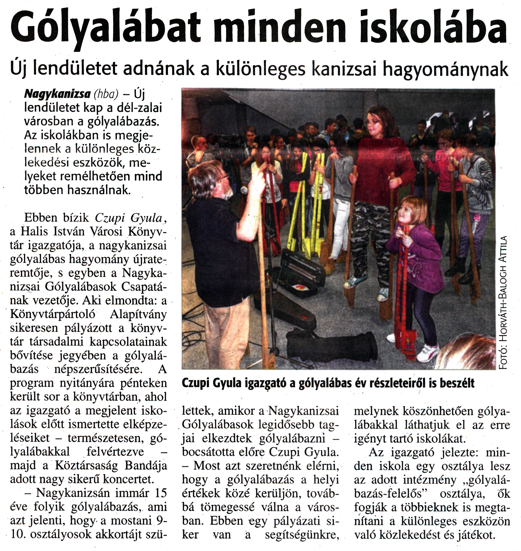 Nyilvános 1802 | 3728 | Zalai Hírlap 2016. november 29. 280. szám 2. oldal - Gólyalábat minden iskolába | Új lendületet adnának a különleges kanizsai hagyománynak Nagykanizsa (hba) - Új lendületet kap a dél-zalai városban a gólyalábazás. Az iskolákban is megjelennek a különleges közlekedési eszközök, melyeket remélhetően mind többen használnak. Ebben bízik Czupi Gyula, a Halis István Városi Könyvtár igazgatója, a nagykanizsai gólyalábas hagyomány újrateremtője, s egyben a Nagykanizsai Gólyalábasok Csapatának vezetője. Aki elmondta: a Könyvtárpártoló Alapítvány sikeresen pályázott a könyvtár társadalmi kapcsolatainak bővítése jegyében a gólyalábazás népszerűsítésére. A program nyitányára pénteken került sor a könyvtárban, ahol az igazgató a megjelent iskolások előtt ismertette elképzeléseiket - természetesen, gólyalábakkal felvértezve - majd a Köztársaság Bandája adott nagy sikerű koncertet. - Nagykanizsán immár 15 éve folyik gólyalábazás, ami azt jelenti, hogy a mostani 9-10. osztályosok akkortájt születtek, amikor a Nagykanizsai Gólyalábasok legidősebb tagjai elkezdtek gólyalábazni -bocsátotta előre Czupi Gyula. - Most azt szeretnénk elérni, hogy a gólyalábazás a helyi értékek közé kerüljön, továbbá tömegessé válna a városban. Ebben egy pályázati siker van a segítségünkre, melynek köszönhetően gólyalábakkal láthatjuk el az erre igényt tartó iskolákat. Az igazgató jelezte: minden iskola egy osztálya lesz az adott intézmény „gólyalábazás-felelős" osztálya, ők fogják a többieknek is megtanítani a különleges eszközön való közlekedést és játékot. Gólyalábat minden iskolába Fotó: Horváth-Balogh Attila |