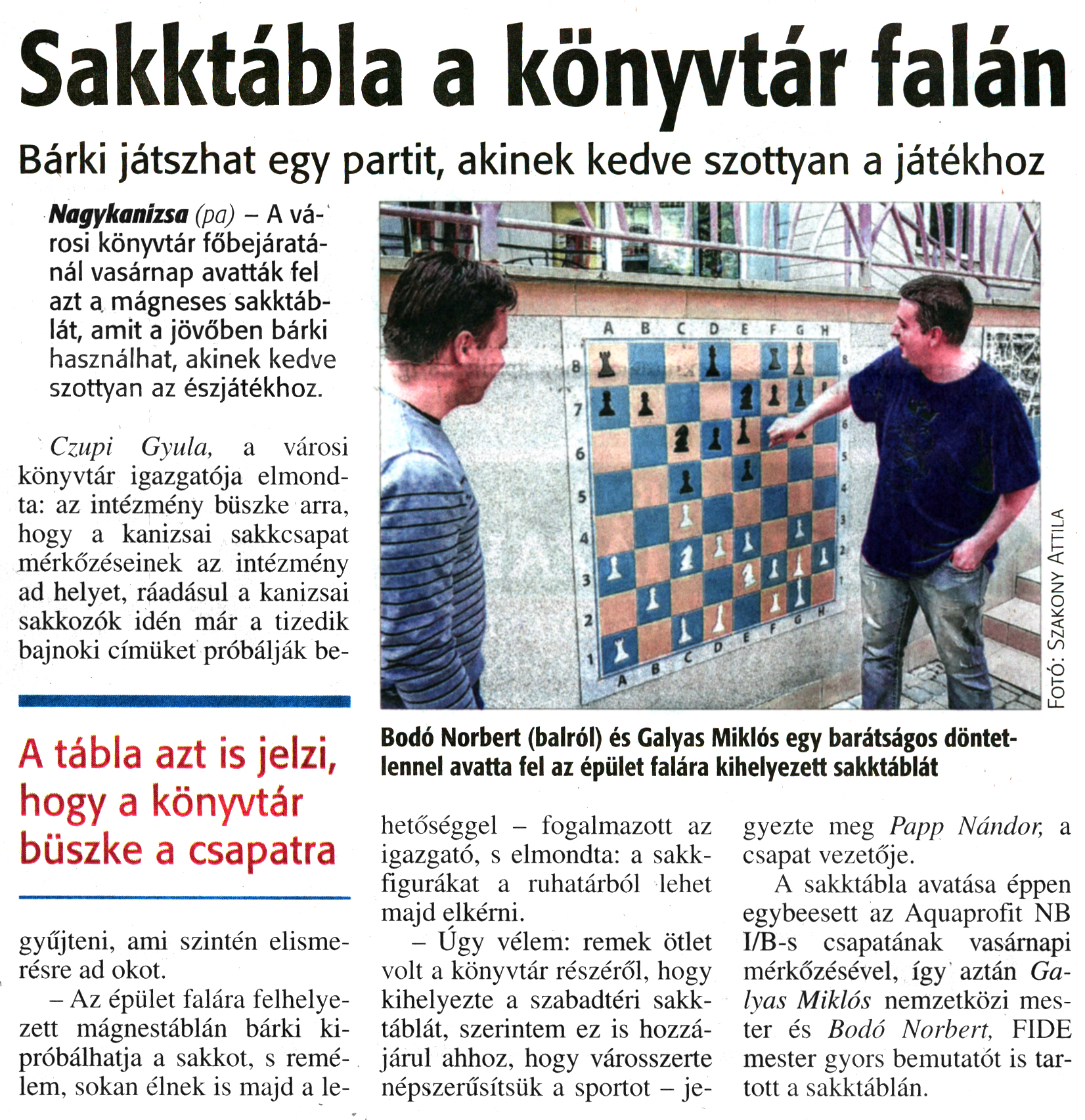 Nyilvános 1815 | 4026 | Zalai Hírlap 2017. április 11. 85. szám 3. oldal | Sakktábla a könyvtár falán Bárki játszhat egy partit, akinek kedve szottyan a játékhoz Bodó Norbert (balról) és Galyas Miklós egy barátságos döntetlennel avatta fel az épület falára kihelyezett sakktáblát Nagykanizsa (pa) - A városi könyvtár főbejáratánál vasárnap avatták fel azt a mágneses sakktáblát, amit a jövőben bárki használhat, akinek kedve szottyan az észjátékhoz. Czupi Gyula, a városi könyvtár igazgatója elmondta: az intézmény büszke arra, hogy a kanizsai sakkcsapat mérkőzéseinek az intézmény ad helyet, ráadásul a kanizsai sakkozók idén már a tizedik bajnoki címüket próbálják begyűjteni, ami szintén elismerésre ad okot. - Az épület falára felhelyezett mágnestáblán bárki kipróbálhatja a sakkot, s remélem, sokan élnek is majd a lehetőséggel - fogalmazott az igazgató, s elmondta: a sakk-figurákat a ruhatárból lehet majd elkérni. - Úgy vélem: remek ötlet volt a könyvtár részéről, hogy kihelyezte a szabadtéri sakktáblát, szerintem ez is hozzájárul ahhoz, hogy városszerte népszerűsítsük a sportot - jegyezte meg Papp Nándor, a csapat vezetője. A sakktábla avatása éppen egybeesett az Aquaprofit NB l/B-s csapatának vasárnapi mérkőzésével, így aztán Galyas Miklós nemzetközi mester és Bodó Norbert, FIDE mester gyors bemutatót is tartott a sakktáblán. Fotó: Szakony Attila |