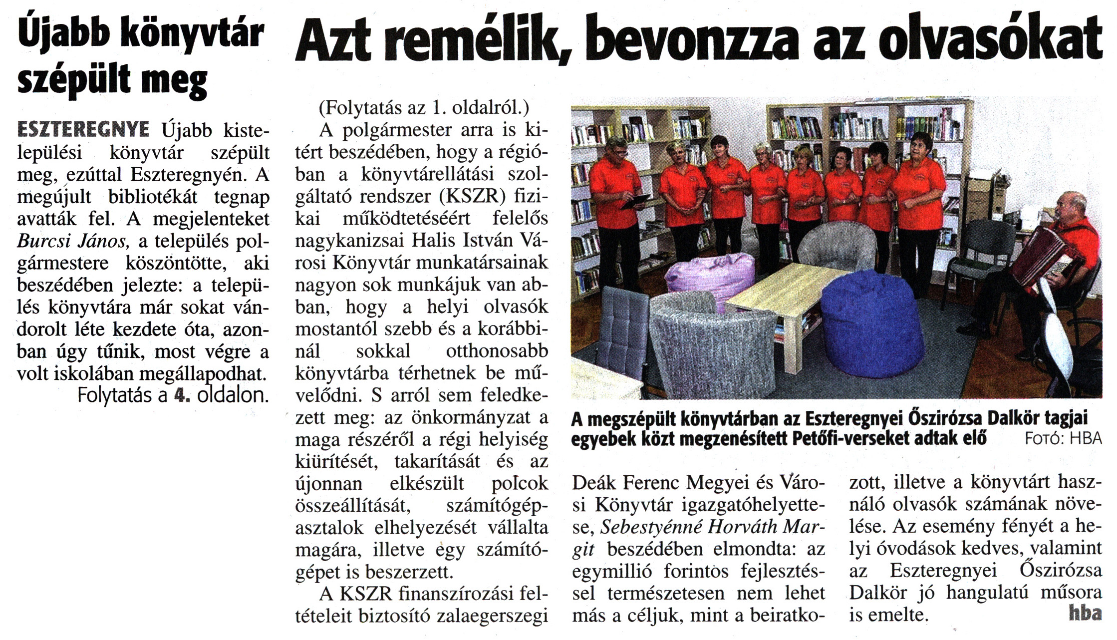 Nyilvános 1738 | 3213 | Zalai Hírlap 2017. november 11. 263. szám 1, 4. oldal | Újabb könyvtár szépült meg ESZTEREGNYE Újabb kistelepülési könyvtár szépült meg, ezúttal Eszteregnyén. A megújult bibliotékát tegnap avatták fel. A megjelenteket Burcsi János, a település polgármestere köszöntötte, aki beszédében jelezte: a település könyvtára már sokat vándorolt léte kezdete óta, azonban úgy tűnik, most végre a volt iskolában megállapodhat. Folytatás a 4. oldalon. Azt remelik, bevonzza az olvasókat A megszépült könyvtárban az Eszteregnyei Őszirózsa Dalkör tagjai egyebek közt megzenésített Petőfi-verseket adtak elő Fotó: hba (Folytatás az 1. oldalról.) A polgármester arra is kitért beszédében, hogy a régióban a könyvtárellátási szolgáltató rendszer (KSZR) fizikai működtetéséért felelős nagykanizsai Halis István Városi Könyvtár munkatársainak nagyon sok munkájuk van abban, hogy a helyi olvasók mostantól szebb és a korábbinál sokkal otthonosabb könyvtárba térhetnek be művelődni. S arról sem feledkezett meg: az önkormányzat a maga részéről a régi helyiség kiürítését, takarítását és az újonnan elkészült polcok összeállítását, számítógépasztalok elhelyezését vállalta magára, illetve egy számítógépet is beszerzett. A KSZR finanszírozási feltételeit biztosító zalaegerszegi Deák Ferenc Megyei és Városi Könyvtár igazgatóhelyettese, Sebestyénné Horváth Margit beszédében elmondta: az egymillió forintos fejlesztéssel természetesen nem lehet más a céljuk, mint a beiratkozott, illetve a könyvtárt használó olvasók számának növelése. Az esemény fényét a helyi óvodások kedves, valamint az Eszteregnyei Őszirózsa Dalkör jó hangulatú műsora is emelte. hba |