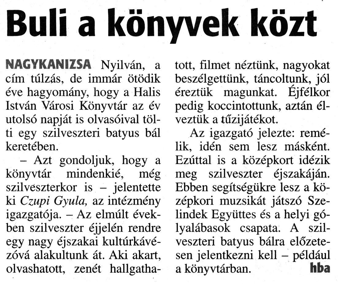 Nyilvános 1666 | 3016 | Zalai Hírlap 2017. december 27. 300. szám 3. oldal | Buli a könyvek közt NAGYKANIZSA Nyilván, a cím túlzás, de immár ötödik éve hagyomány, hogy a Halis István Városi Könyvtár az év utolsó napját is olvasóival tölti egy szilveszteri batyus bál keretében. - Azt gondoljuk, hogy a könyvtár mindenkié, még szilveszterkor is - jelentette ki Czupi Gyula, az intézmény igazgatója. - Az elmúlt években szilveszter éjjelén rendre egy nagy éjszakai kultúrkávézóvá alakultunk át. Aki akart, olvashatott, zenét hallgathatott, filmet néztünk, nagyokat beszélgettünk, táncoltunk, jól éreztük magunkat. Éjfélkor pedig koccintottunk, aztán élveztük a tűzijátékot. Az igazgató jelezte: remélik, idén sem lesz másként. Ezúttal is a középkort idézik meg szilveszter éjszakáján. Ebben segítségükre lesz a középkori muzsikát játszó Szelindek Együttes és a helyi gólyalábasok csapata. A szilveszteri batyus bálra előzetesen jelentkezni kell - például a könyvtárban. hba |