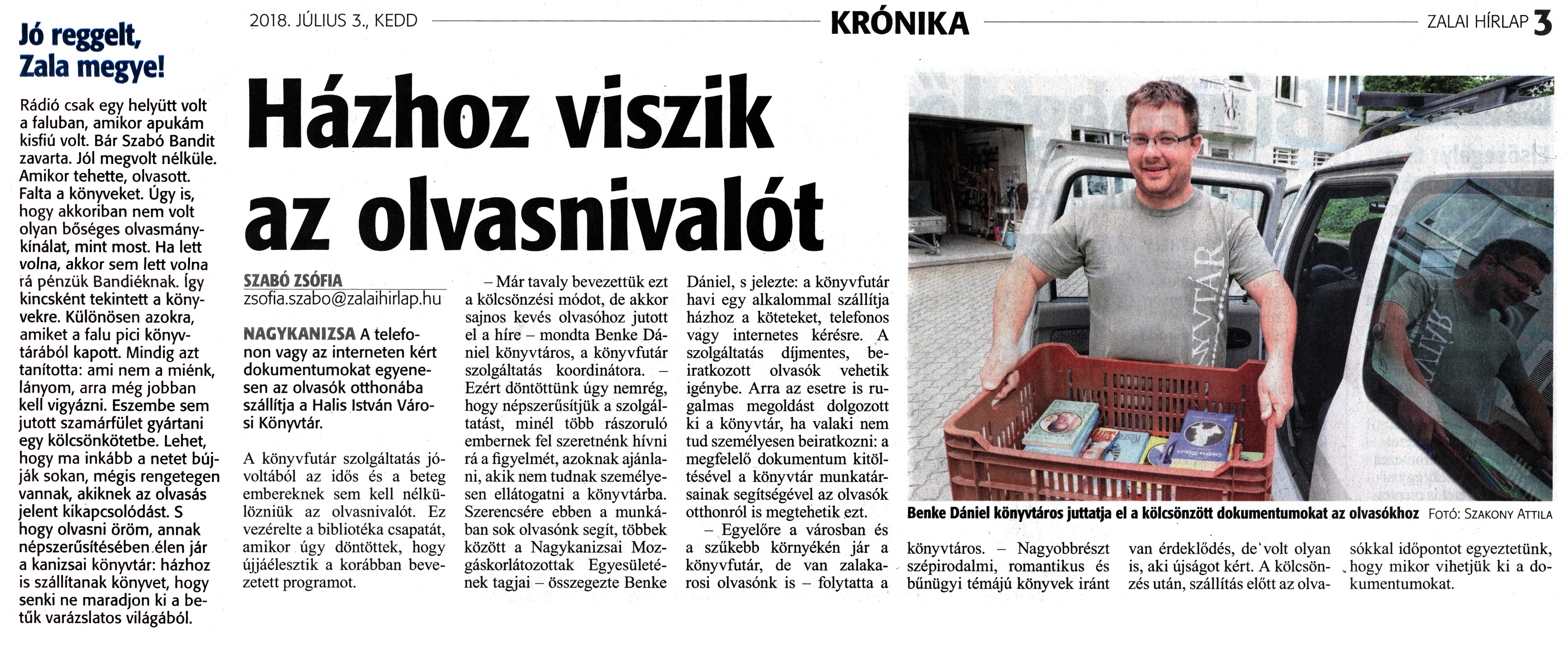 Nyilvános 1816 | 3044 | Zalai Hírlap 2018. július 3. 152. szám 1, 3. oldal | Jó reggelt Zala megyei Rádió csak egy helyütt volt a faluban, amikor apukám kisfiú volt. Bár Szabó Bandit zavarta. Jól megvolt nélküle. Amikor tehette, olvasott. Falta a könyveket. Úgy is, hogy akkoriban nem volt olyan bőséges olvasmánykínálat, mint most. Ha lett volna, akkor sem lett volna rá pénzük Bandiéknak. Így kincsként tekintett a könyvekre. Különösen azokra, amiket a falu pici könyvtárából kapott. Mindig azt tanította: ami nem a miénk, lányom, arra még jobban kell vigyázni. Eszembe sem jutott szamárfület gyártani egy kölcsönkötetbe. Lehet, hogy ma inkább a netet bújják sokan, mégis rengetegen vannak, akiknek az olvasás jelent kikapcsolódást. S hogy olvasni öröm, annak népszerűsítésében élen jár a kanizsai könyvtár: házhoz is szállítanak könyvet, hogy senki ne maradjon ki a betűk varázslatos világából. 2018. JÚLIUS 3., KEDD KRÓNIKA ZALAI HÍRLAP 3 Házhoz viszik az olvasnivalót SZABÓ ZSÓFIA_ zsofia.szabo@zalaihirlap.hu NAGYKANIZSA A telefonon vagy az interneten kért dokumentumokat egyenesen az olvasók otthonába szállítja a Halis István Városi Könyvtár. A könyvfutár szolgáltatás jóvoltából az idős és a beteg embereknek sem kell nélkülözniük az olvasnivalót. Ez vezérelte a bibliotéka csapatát, amikor úgy döntöttek, hogy újjáélesztik a korábban bevezetett programot. - Már tavaly bevezettük ezt a kölcsönzési módot, de akkor sajnos kevés olvasóhoz jutott el a híre - mondta Benke Dániel könyvtáros, a könyvfutár szolgáltatás koordinátora. - Ezért döntöttünk úgy nemrég, hogy népszerűsítjük a szolgáltatást, minél több rászoruló embernek fel szeretnénk hívni rá a figyelmét, azoknak ajánlani, akik nem tudnak személyesen ellátogatni a könyvtárba. Szerencsére ebben a munkában sok olvasónk segít, többek között a Nagykanizsai Mozgáskorlátozottak Egyesületének tagjai - összegezte Benke Dániel, s jelezte: a könyvfutár havi egy alkalommal szállítja házhoz a köteteket, telefonos vagy internetes kérésre. A szolgáltatás díjmentes, beiratkozott olvasók vehetik igénybe. Arra az esetre is rugalmas megoldást dolgozott ki a könyvtár, ha valaki nem tud személyesen beiratkozni: a megfelelő dokumentum kitöltésével a könyvtár munkatársainak segítségével az olvasók otthonról is megtehetik ezt. - Egyelőre a városban és a szűkebb környékén jár a könyvfutár, de van zalaka-rosi olvasónk is - folytatta a könyvtáros. - Nagyobbrészt szépirodalmi, romantikus és bűnügyi témájú könyvek iránt van érdeklődés, de volt olyan is, aki újságot kért. A kölcsönzés után, szállítás előtt az olvasókkal időpontot egyeztetünk, hogy mikor vihetjük ki a dokumentumokat. Benke Dániel könyvtáros juttatja el a kölcsönzött dokumentumokat az olvasókhoz Fotó: Szakony Attila |