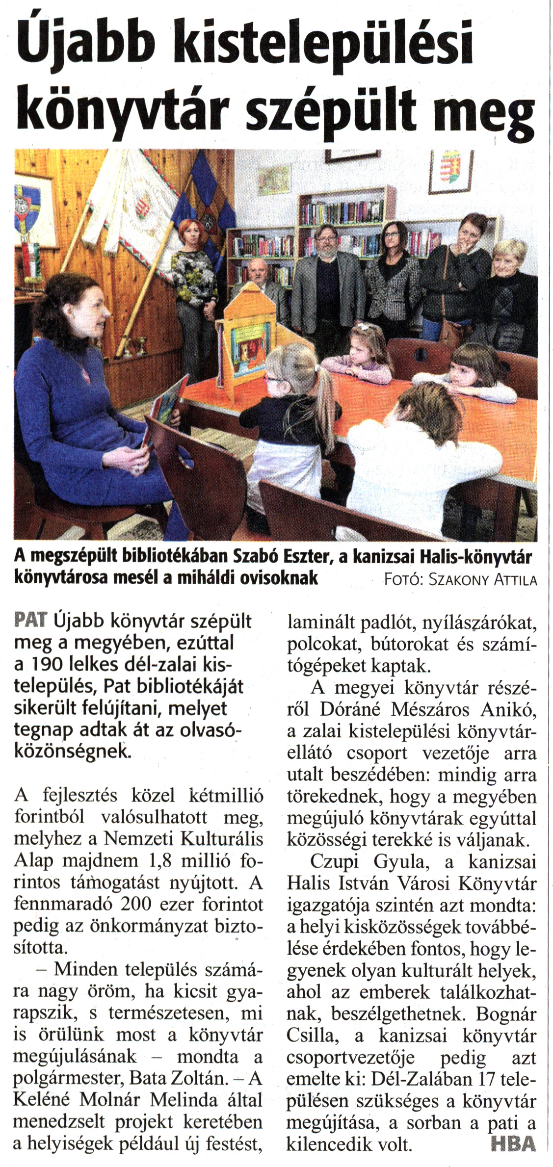 Nyilvános 1678 | 2850 | Zalai Hírlap 2018. december 1. 279. szám 16. oldal | Újabb kistelepülési könyvtár szépült meg A megszépült bibliotékában Szabó Eszter, a kanizsai Halis-könyvtár könyvtárosa mesél a miháldi ovisoknak Fotó: Szakony Attila PAT Újabb könyvtár szépült meg a megyében, ezúttal a 190 lelkes dél-zalai kistelepülés, Pat bibliotékáját sikerült felújítani, melyet tegnap adtak át az olvasóközönségnek. A fejlesztés közel kétmillió forintból valósulhatott meg, melyhez a Nemzeti Kulturális Alap majdnem 1,8 millió forintos támogatást nyújtott. A fennmaradó 200 ezer forintot pedig az önkormányzat biztosította. - Minden település számára nagy öröm, ha kicsit gyarapszik, s természetesen, mi is örülünk most a könyvtár megújulásának - mondta a polgármester, Bata Zoltán. - A Keléné Molnár Melinda által menedzselt projekt keretében a helyiségek például új festést, laminált padlót, nyílászárókat, polcokat, bútorokat és számítógépeket kaptak. A megyei könyvtár részéről Dóráné Mészáros Anikó, a zalai kistelepülési könyvtárellátó csoport vezetője arra utalt beszédében: mindig arra törekednek, hogy a megyében megújuló könyvtárak egyúttal közösségi terekké is váljanak. Czupi Gyula, a kanizsai Halis István Városi Könyvtár igazgatója szintén azt mondta: a helyi kisközösségek továbbélése érdekében fontos, hogy legyenek olyan kulturált helyek, ahol az emberek találkozhatnak, beszélgethetnek. Bognár Csilla, a kanizsai könyvtár csoportvezetője pedig azt emelte ki: Dél-Zalában 17 településen szükséges a könyvtár megújítása, a sorban a pati a kilencedik volt. HBA |