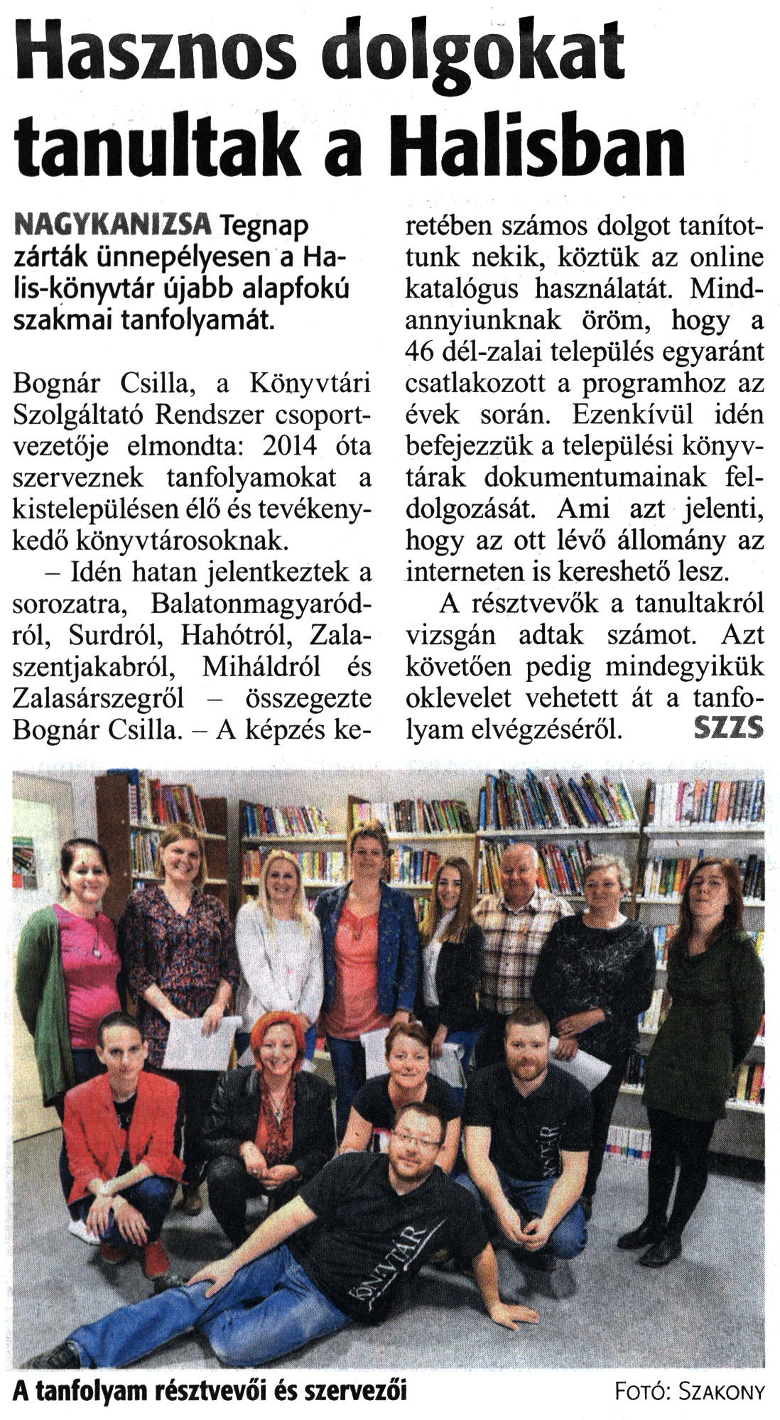 Nyilvános 1611 | 2888 | Zalai Hírlap 2019. április 10. 84. szám 3. oldal | Hasznos dolgokat tanultak a Halisban NAGYKANIZSA Tegnap zárták ünnepélyesen a Halis-könyvtár újabb alapfokú szakmai tanfolyamát. Bognár Csilla, a Könyvtári Szolgáltató Rendszer csoportvezetője elmondta: 2014 óta szerveznek tanfolyamokat a kistelepülésen élő és tevékenykedő könyvtárosoknak. - Idén hatan jelentkeztek a sorozatra, Balatonmagyaródról, Surdról, Hahótról, Zalaszentjakabról, Miháldról és Zalasárszegről - összegezte Bognár Csilla. - A képzés keretében számos dolgot tanítottunk nekik, köztük az online katalógus használatát. Mindannyiunknak öröm, hogy a 46 dél-zalai település egyaránt csatlakozott a programhoz az évek során. Ezenkívül idén befejezzük a települési könyvtárak dokumentumainak feldolgozását. Ami azt jelenti, hogy az ott lévő állomány az interneten is kereshető lesz. A résztvevők a tanultakról vizsgán adtak számot. Azt követően pedig mindegyikük oklevelet vehetett át a tanfolyam elvégzéséről. SZZS |