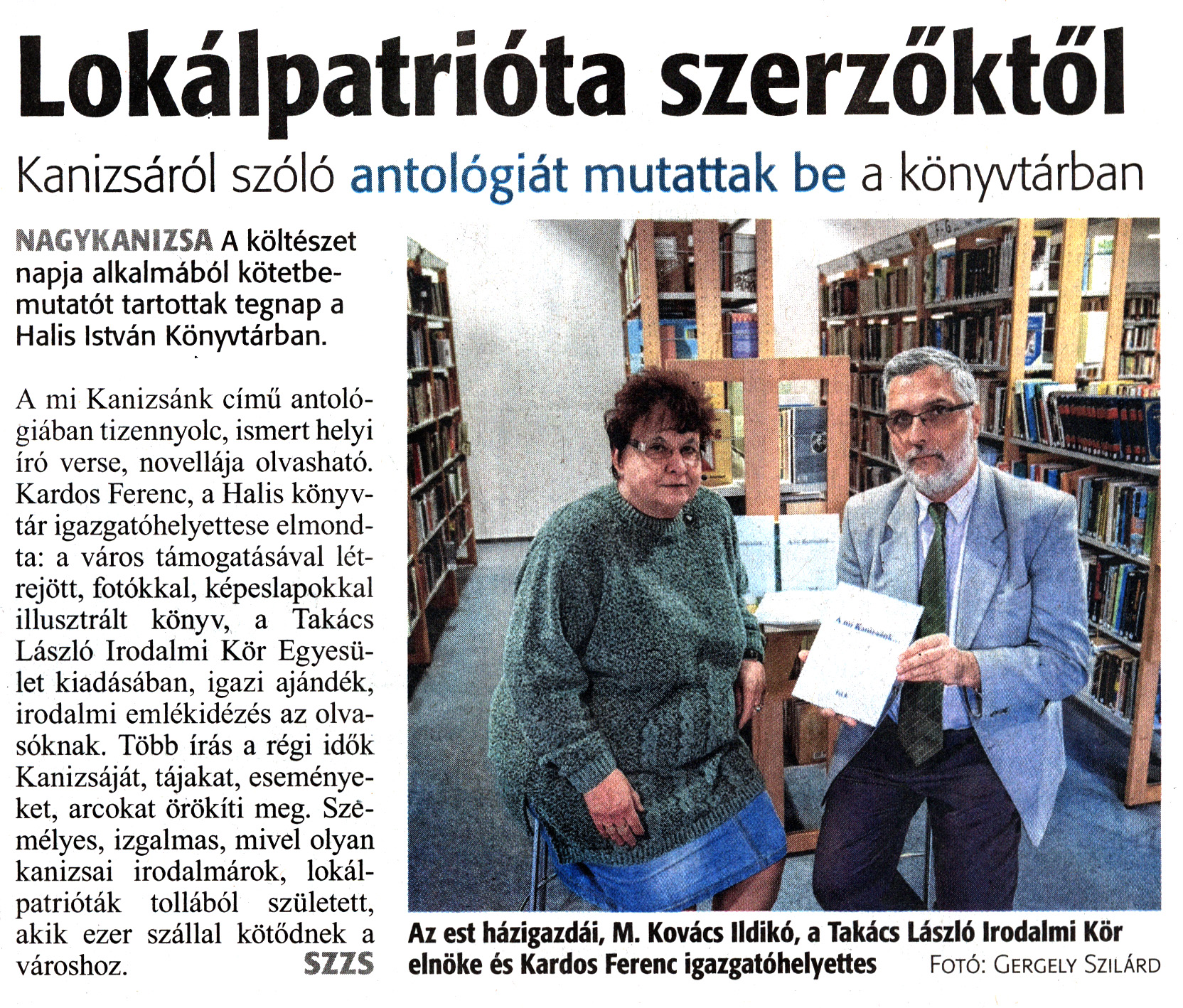 Nyilvános 1608 | 2979 | Zalai Hírlap 2019. április 13. 87. szám 1. oldal | Lokálpatrióta szerzőktől Kanizsáról szóló antológiát mutattak be a könyvtárban Az est házigazdái, M. Kovács Ildikó, a Takács László Irodalmi Kör elnöke és Kardos Ferenc igazgatóhelyettes Fotó: Gergely Szilárd NAGYKANIZSA A költészet napja alkalmából kötetbemutatót tartottak tegnap a Halis István Könyvtárban. A mi Kanizsánk című antológiában tizennyolc, ismert helyi író verse, novellája olvasható. Kardos Ferenc, a Halis könyvtár igazgatóhelyettese elmondta: a város támogatásával létrejött, fotókkal, képeslapokkal illusztrált könyv, a Takács László Irodalmi Kör Egyesület kiadásában, igazi ajándék, irodalmi emlékidézés az olvasóknak. Több írás a régi idők Kanizsáját, tájakat, eseményeket, arcokat örökíti meg. Személyes, izgalmas, mivel olyan kanizsai irodalmárok, lokálpatrióták tollából született, akik ezer szállal kötődnek a városhoz. SZZS |