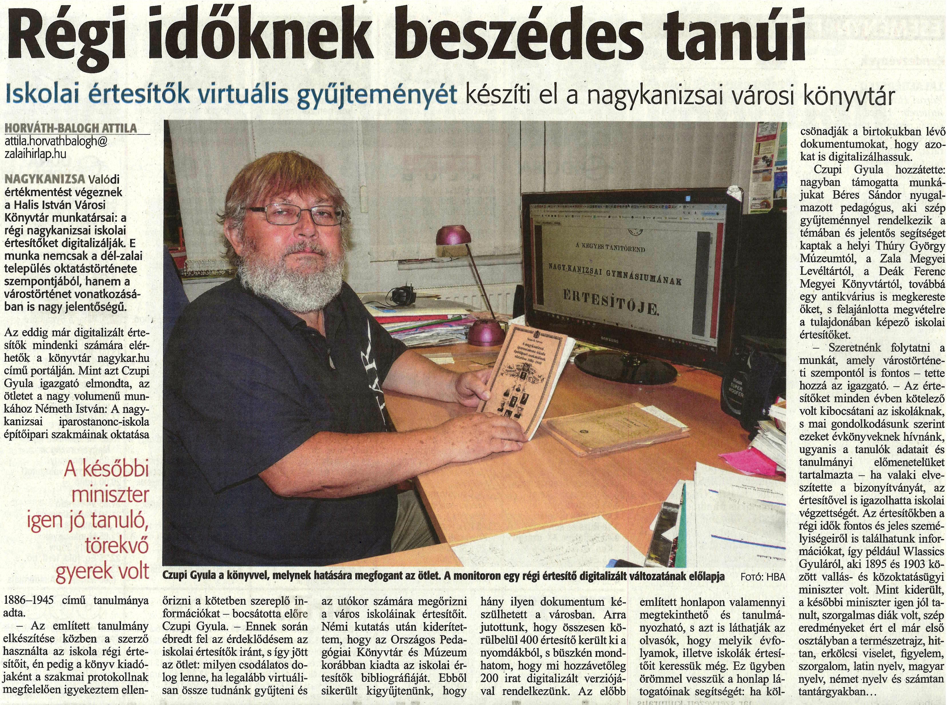 Nyilvános 1353 | 2364 | Régi időknek beszédes tanúi | Iskolai értesítők virtuális gyűjteményét készíti el a nagykanizsai városi könyvtár HORVÁTH-BALOGH ATTILA attila.horvathbalogh@zalaihirlap.hu NAGYKANIZSA Valódi értékmentést végeznek a Halis István Városi Könyvtár munkatársai: a régi nagykanizsai iskolai értesítőket digitalizálják. E munka nemcsak a dél-zalai település oktatástörténete szempontjából, hanem a várostörténet vonatkozásában is nagy jelentőségű. Az eddig már digitalizált értesítők mindenki számára elérhetők a könyvtár nagykar.hu című portálján. Mint azt Czupi Gyula igazgató elmondta, az ötletet a nagy volumenű munkához Németh István: A nagykanizsai iparostanonc-iskola építőipari szakmáinak oktatása - A későbbi miniszter igen jó tanuló, törekvő gyerek volt - 1886-1945 című tanulmánya adta. -Az említett tanulmány elkészítése közben a szerző használta az iskola régi értesítőit, én pedig a könyv kiadójaként a szakmai protokollnak megfelelően igyekeztem ellenőrizni a kötetben szereplő információkat - bocsátotta előre Czupi Gyula. - Ennek során ébredt fel az érdeklődésem az iskolai értesítők iránt, s így jött az ötlet: milyen csodálatos dolog lenne, ha legalább virtuálisan össze tudnánk gyűjteni és az utókor számára megőrizni a város iskoláinak értesítőit. Némi kutatás után kiderítettem, hogy az Országos Pedagógiai Könyvtár és Múzeum korábban kiadta az iskolai értesítők bibliográfiáját. Ebből sikerült kigyűjtenünk, hogy hány ilyen dokumentum készülhetett a városban. Arra jutottunk, hogy összesen körülbelül 400 értesítő került ki a nyomdákból, s büszkén mondhatom, hogy mi hozzávetőleg 200 irat digitalizált verziójával rendelkezünk. Az előbb említett honlapon valamennyi megtekinthető és tanulmányozható, s azt is láthatják az olvasók, hogy melyik évfolyamok, illetve iskolák értesítőit keressük még. Ez ügyben örömmel vesszük a honlap látogatóinak segítségét: ha kölcsönadják a birtokukban lévő dokumentumokat, hogy azokat is digitalizálhassuk. Czupi Gyula hozzátette: nagyban támogatta munkájukat Béres Sándor nyugalmazott pedagógus, aki szép gyűjteménnyel rendelkezik a témában és jelentős segítséget kaptak a helyi Thúry György Múzeumtól, a Zala Megyei Levéltártól, a Deák Ferenc Megyei Könyvtártól, továbbá egy antikvárius is megkereste őket, s felajánlotta megvételre a tulajdonában képező iskolai értesítőket. - Szeretnénk folytatni a munkát, amely várostörténeti szempontéi is fontos - tette hozzá az igazgató. - Az értesítőket minden évben kötelező volt kibocsátani az iskoláknak, s mai gondolkodásunk szerint ezeket évkönyveknek hívnánk, ugyanis a tanulók adatait és tanulmányi előmenetelüket tartalmazta - ha valaki elveszítette a bizonyítványát, az értesítővel is igazolhatta iskolai végzettségét. Az értesítőkben a régi idők fontos és jeles személyiségeiről is találhatunk információkat, így például Wlassics Gyuláról, aki 1895 és 1903 között vallás- és közoktatásügyi miniszter volt. Mint kiderült, a későbbi miniszter igen jól tanult, szorgalmas diák volt, szép eredményeket ért el már első osztályban a természetrajz, hittan, erkölcsi viselet, figyelem, szorgalom, latin nyelv, magyar nyelv, német nyelv és számtan tantárgyakban... Czupi Gyula a könyvvel, melynek hatására megfogant az ötlet. A monitoron egy régi értesítő digitalizált változatának előlapja Fotó: HBA |