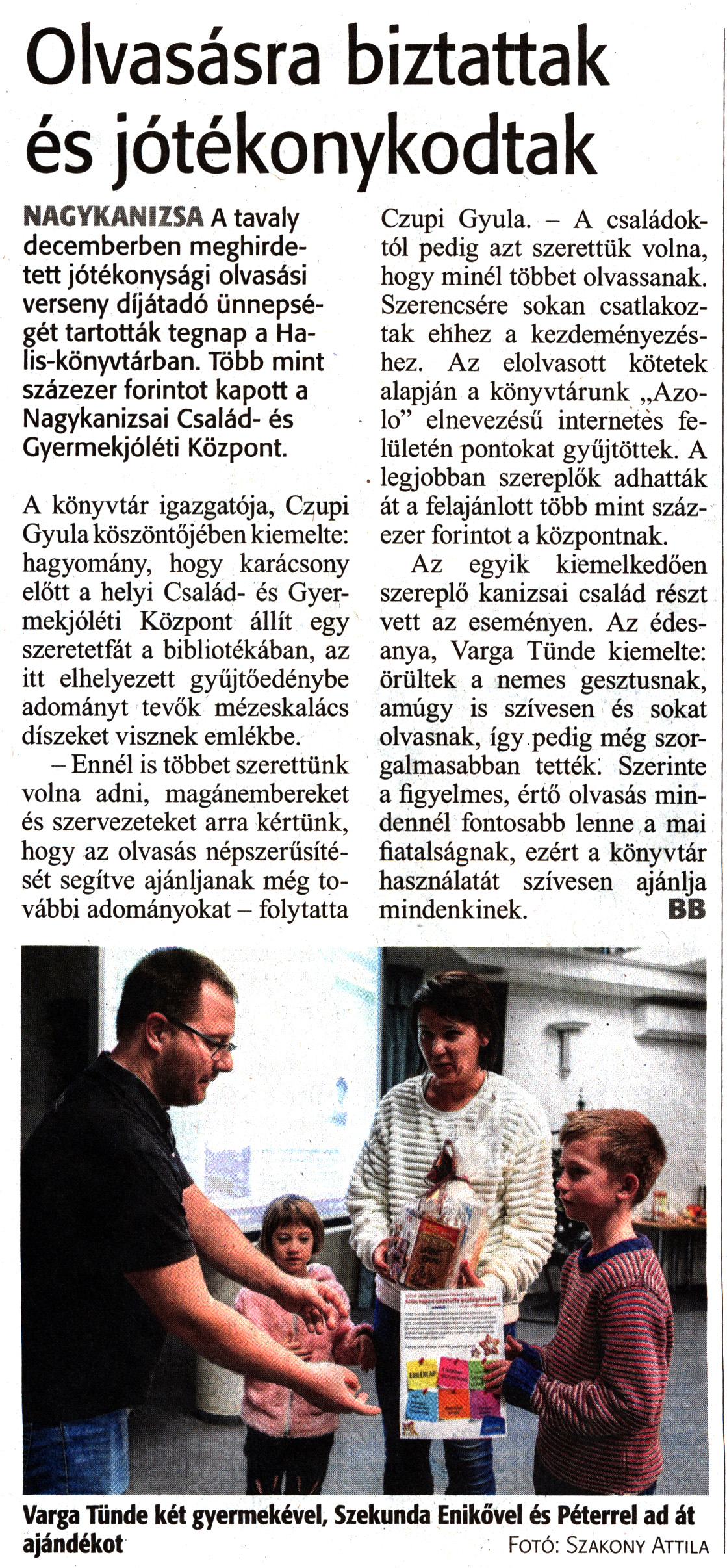 Nyilvános 1576 | 2668 | Zalai Hírlap 2020. január 7. 5. szám 4. oldal | Olvasásra biztattak és jótékonykodtak NAGYKANIZSA A tavaly decemberben meghirdetett jótékonysági olvasási verseny díjátadó ünnepségét tartották tegnap a Halis-könyvtárban. Több mint százezer forintot kapott a Nagykanizsai Család- és Gyermekjóléti Központ. A könyvtár igazgatója, Czupi Gyula köszöntőjében kiemelte: hagyomány, hogy karácsony előtt a helyi Család- és Gyermekjóléti Központ állít egy szeretetfát a bibliotékában, az itt elhelyezett gyűjtőedénybe adományt tevők mézeskalács díszeket visznek emlékbe. - Ennél is többet szerettünk volna adni, magánembereket és szervezeteket arra kértünk, hogy az olvasás népszerűsítését segítve ajánljanak még további adományokat - folytatta Czupi Gyula. - A családoktól pedig azt szerettük volna, hogy minél többet olvassanak. Szerencsére sokan csatlakoztak ehhez a kezdeményezéshez. Az elolvasott kötetek alapján a könyvtárunk „Azolo" elnevezésű internetes felületén pontokat gyűjtöttek. A legjobban szereplők adhatták át a felajánlott több mint százezer forintot a központnak. Az egyik kiemelkedően szereplő kanizsai család részt vett az eseményen. Az édesanya, Varga Tünde kiemelte: örültek a nemes gesztusnak, amúgy is szívesen és sokat olvasnak, így pedig még szorgalmasabban tették: Szerinte a figyelmes, értő olvasás mindennél fontosabb lenne a mai fiatalságnak, ezért a könyvtár használatát szívesen ajánlja mindenkinek. BB Varga Tünde két gyermekével, Szekunda Enikővel és Péterrel ad át ajándékot Fotó: Szakony Attila |