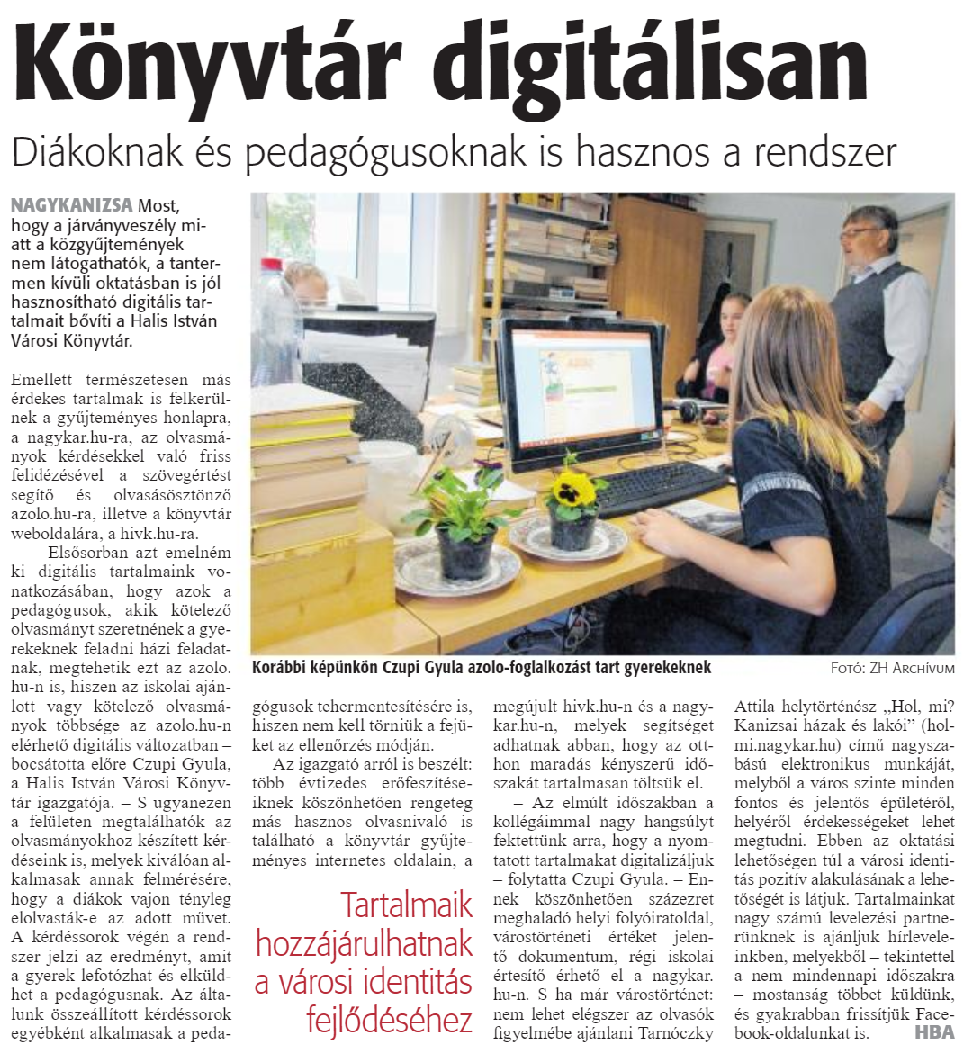 Nyilvános 1425 | 2067 | Könyvtár digitálisan | Diákoknak és pedagógusoknak is hasznos a rendszer Korábbi képünkön Czupi Gyula azolo-foglalkozást tart gyerekeknek Fotó: ZH Archívum NAGYKANIZSA Most, hogy a járványveszély miatt a közgyűjtemények nem látogathatók, a tantermen kívüli oktatásban is jól hasznosítható digitális tartalmait bővíti a Halis István Városi Könyvtár. Emellett természetesen más érdekes tartalmak is felkerülnek a gyűjteményes honlapra, a nagykar.hu-ra, az olvasmányok kérdésekkel való friss felidézésével a szövegértést segítő és olvasásösztönzö azolo.hu-ra, illetve a könyvtár weboldalára, a hivk.hu-ra. - Elsősorban azt emelném ki digitális tartalmaink vonatkozásában, hogy azok a pedagógusok, akik kötelező olvasmányt szeretnének a gyerekeknek feladni házi feladatnak, megtehetik ezt az azolo.hu-n is, hiszen az iskolai ajánlott vagy kötelező olvasmányok többsége az azolo.hu-n elérhető digitális változatban -bocsátotta előre Czupi Gyula, a Halis István Városi Könyvtár igazgatója. - S ugyanezen a felületen megtalálhatók az olvasmányokhoz készített kérdéseink is, melyek kiválóan alkalmasak annak felmérésére, hogy a diákok vajon tényleg elolvasták-e az adott művet. A kérdéssorok végén a rend-szer jelzi az eredményt, amit a gyerek lefotózhat és elküldhet a pedagógusnak. Az általunk összeállított kérdéssorok egyébként alkalmasak a pedagógusok tehermentesítésére is, hiszen nem kell törniük a fejüket az ellenőrzés módján. Az igazgató arról is beszélt: több évtizedes erőfeszítéseiknek köszönhetően rengeteg más hasznos olvasnivaló is található a könyvtár gyűjteményes internetes oldalain, a megújult hivk.hu-n és a nagykar.hu-n, melyek segítséget adhatnak abban, hogy az otthon maradás kényszerű időszakát tartalmasai! töltsük el. - Az elmúlt időszakban a kollégáimmal nagy hangsúlyt fektettünk arra, hogy a nyomtatott tartalmakat digitalizáljuk - folytatta Czupi Gyula. - Ennek köszönhetően százezret meghaladó helyi folyóiratoldal, várostörténeti értéket jelentő dokumentum, régi iskolai értesítő érhető el a nagykar.hu-n. S ha már várostörténet: nem lehet elégszer az olvasók figyelmébe ajánlani Tarnóczky Attila helytörténész "Hol, mi? Kanizsai házak és lakói" (hol-mi.nagykar.hu) című nagyszabású elektronikus munkáját, melyből a város szinte minden fontos és jelentős épületéről, helyéről érdekességeket lehet megtudni. Ebben az oktatási lehetőségen túl a városi identitás pozitív alakulásának a lehetőségét is látjuk. Tartalmainkat nagy számú levelezési partnerünknek is ajánljuk hírleveleinkben. melyekből - tekintettel a nem mindennapi időszakra - mostanság többet küldünk, és gyakrabban frissítjük Facebook-oldalunkat is. HBA |